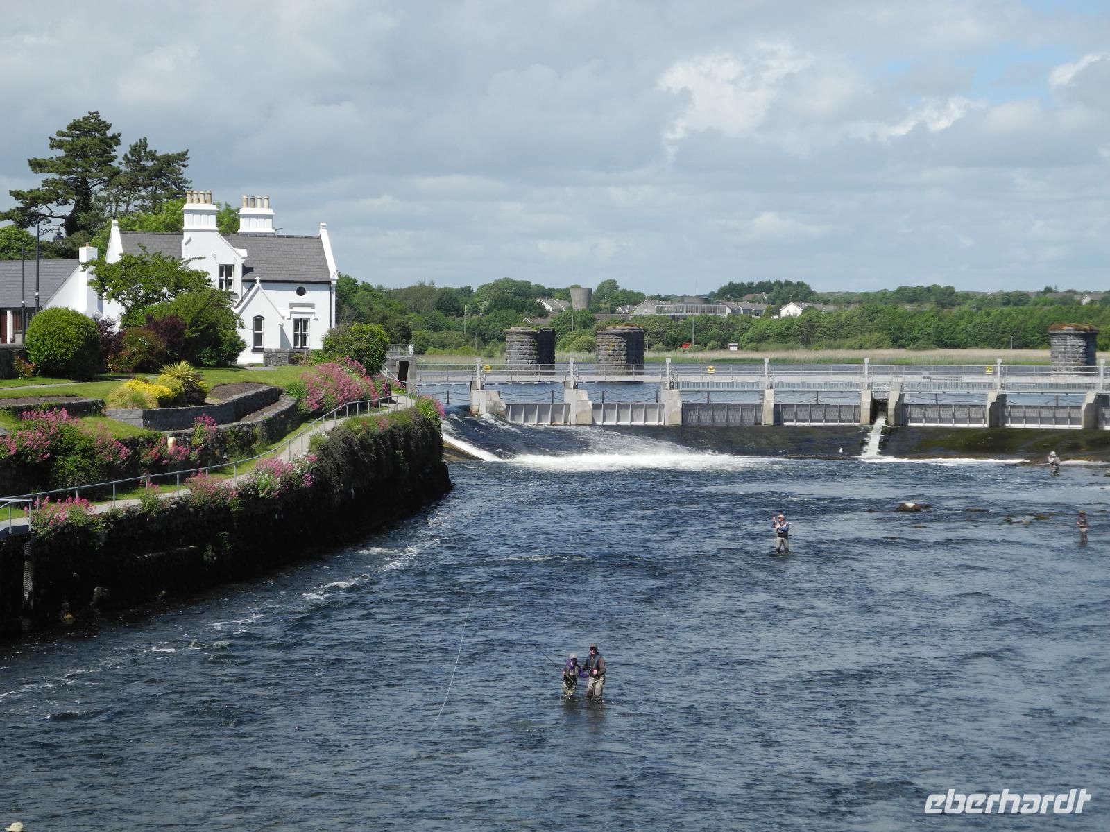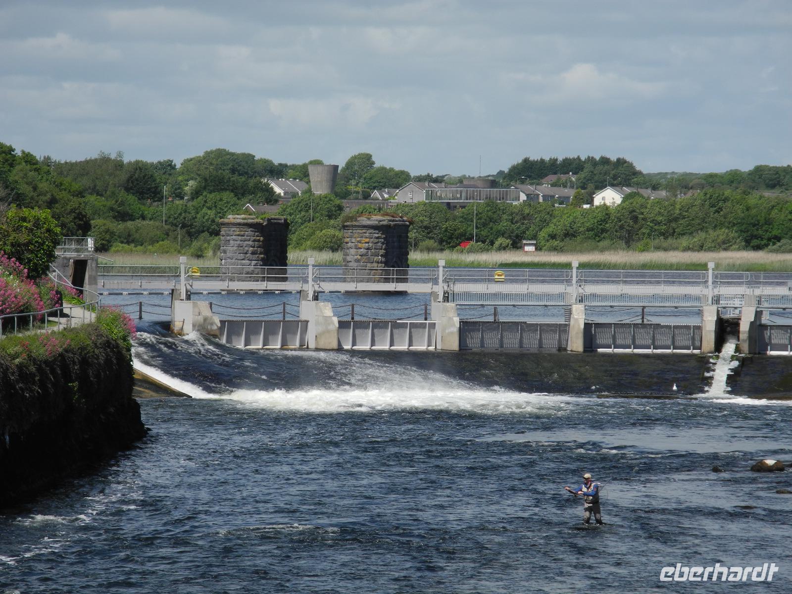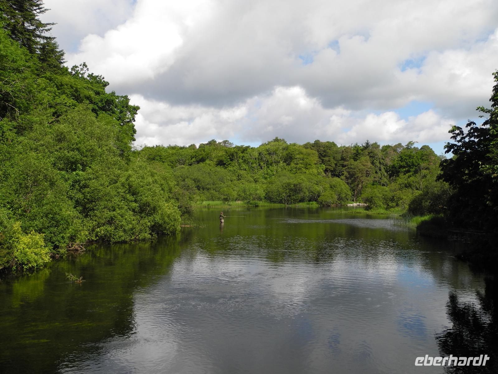 Oisín, unser Busfahrer zeigt uns unterwegs noch eine Anlage an einem Fluss, wo wir beobachten können, wie die Fliegenfischer versuchen, die aufsteigenden Lachse zu überlisten.