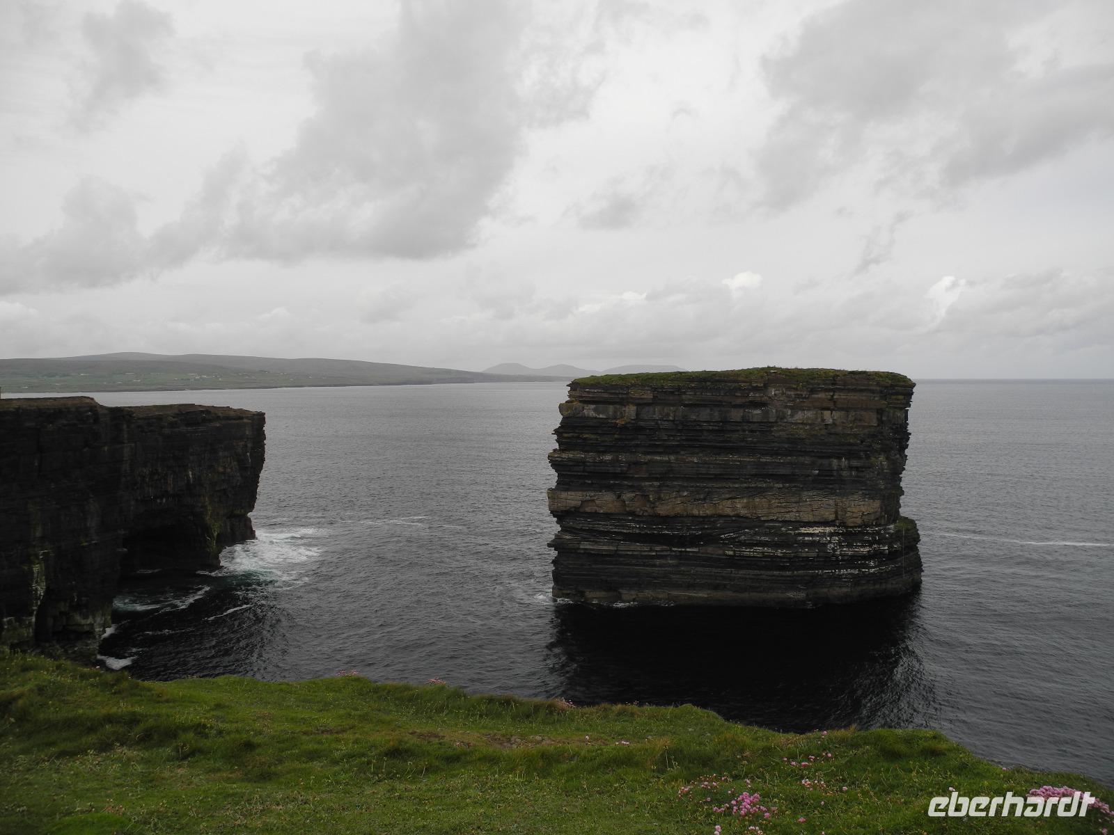 Heute unternehmen wir einen längeren Tagesausflug und fahren zunächst ganz weit hinaus auf eine Landzunge, immer die kleinen Straßen entlang, bis wir schließlich bei „Downpatrick Head" ankommen.