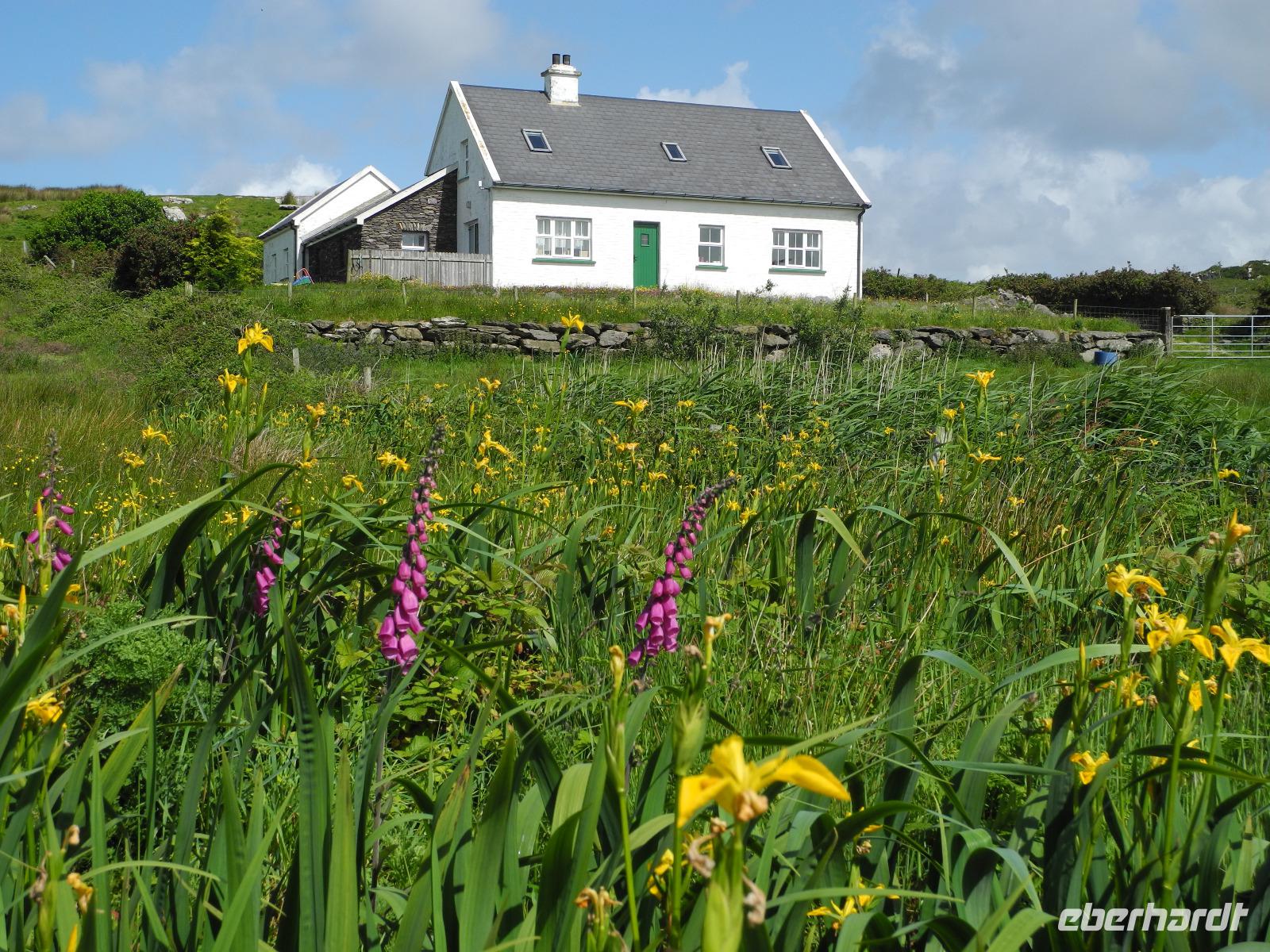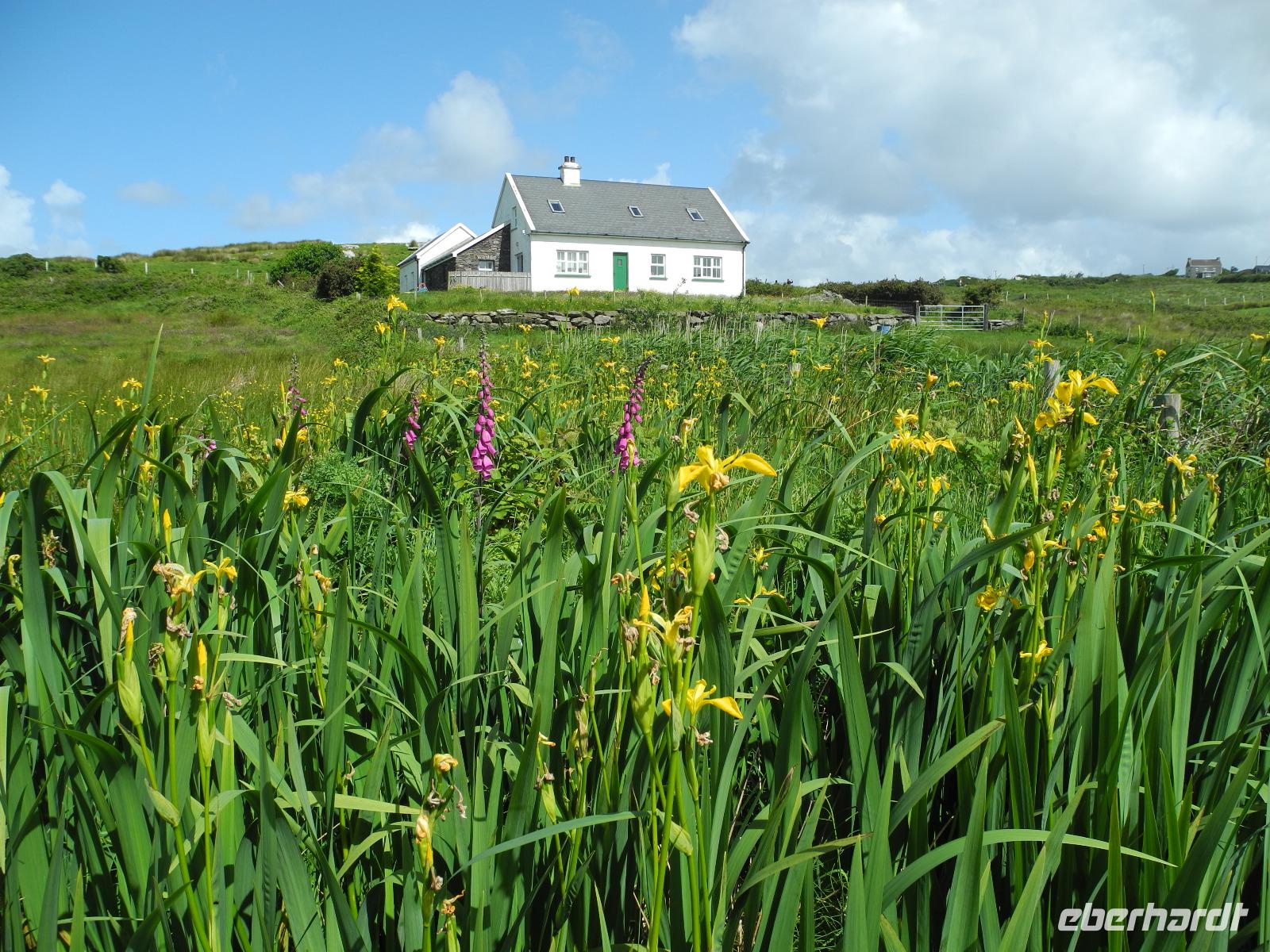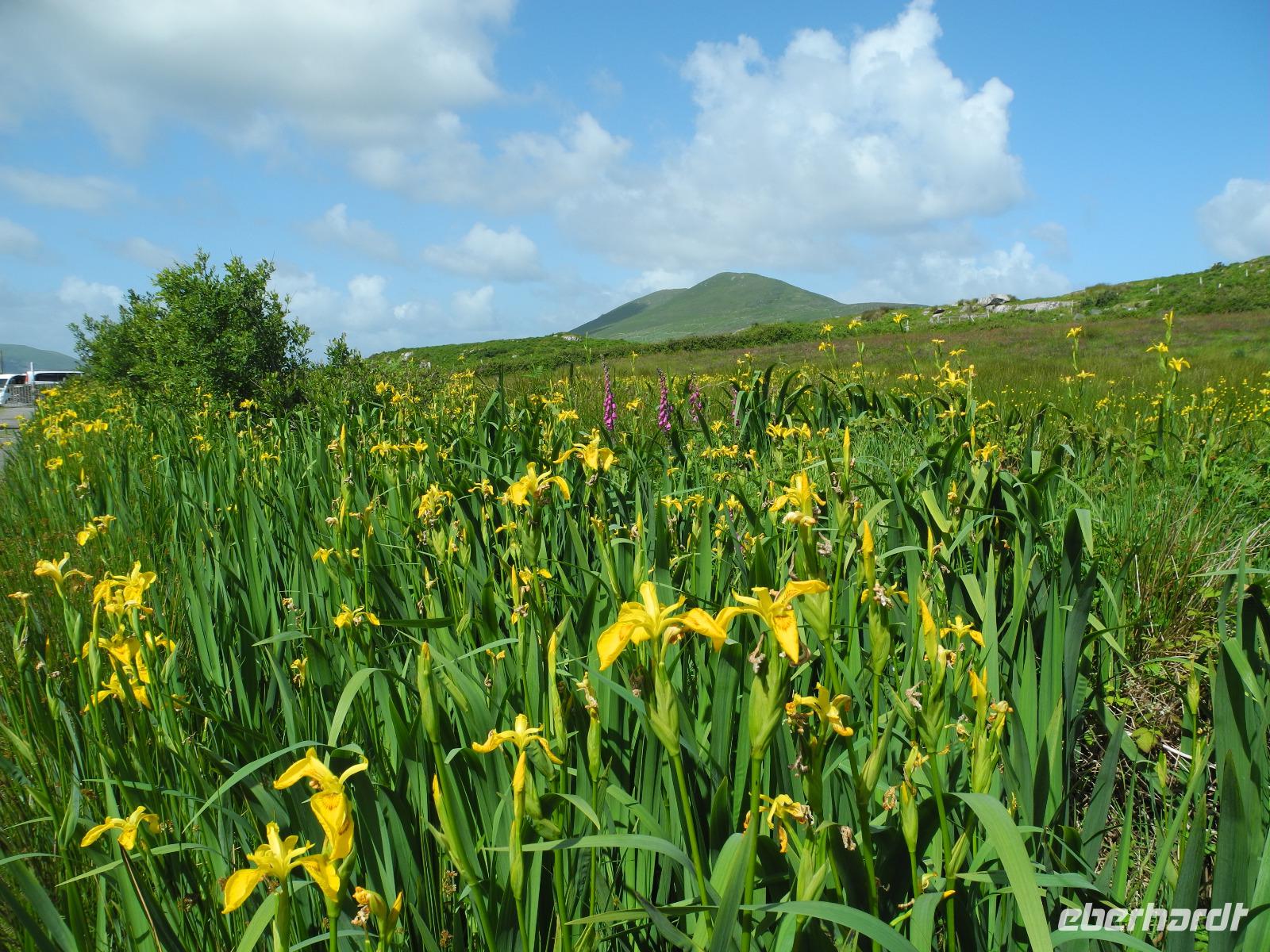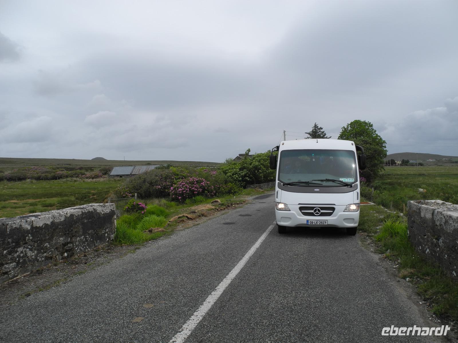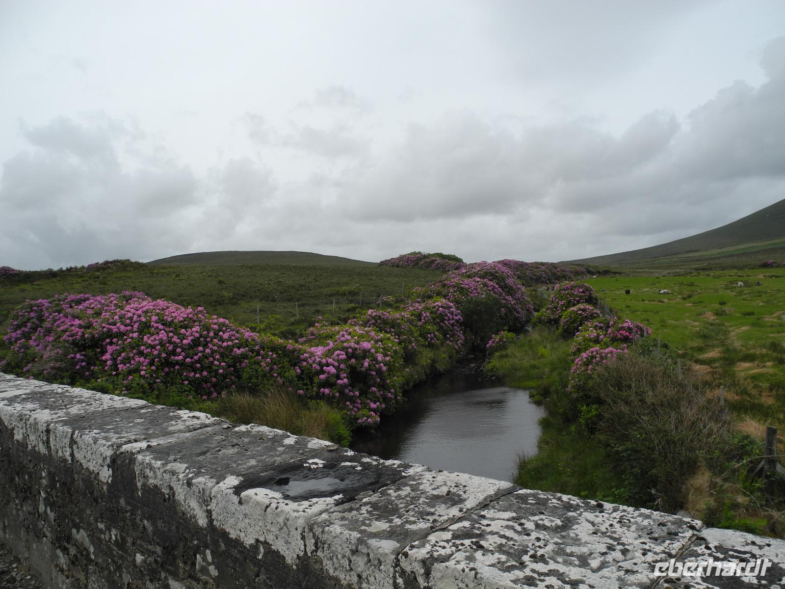 Auf unserer Weiterfahrt sehen wir immer wieder riesige Felder von Rhododendron, welcher sich in Irland inzwischen schon zu einer ernsthaften Plage entwickelt hat. Uns gefällt es aber dennoch immer wieder, wenn wir diese wilde Landschaft mit dem satten Grün und den violett leuchtenden Pflanzen in solch einer unvorstellbaren Dimension sehen.