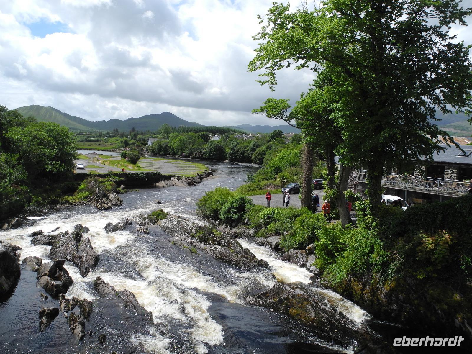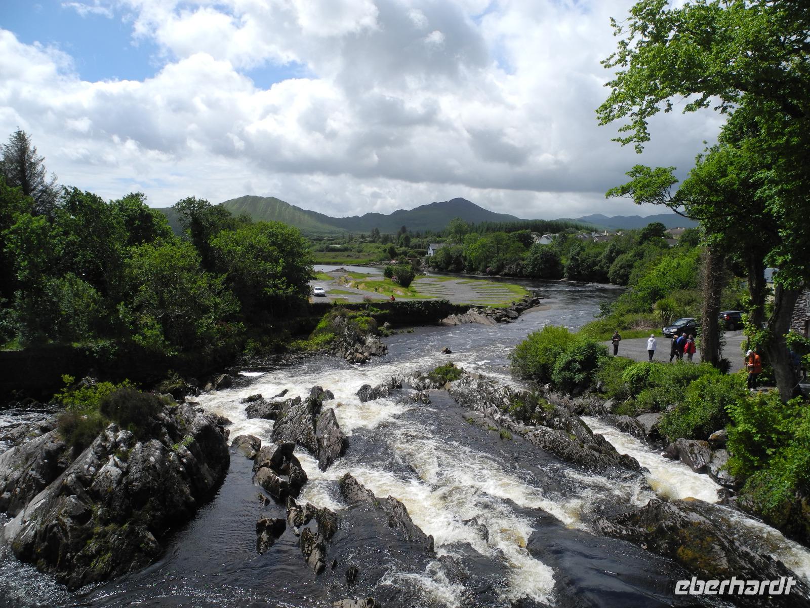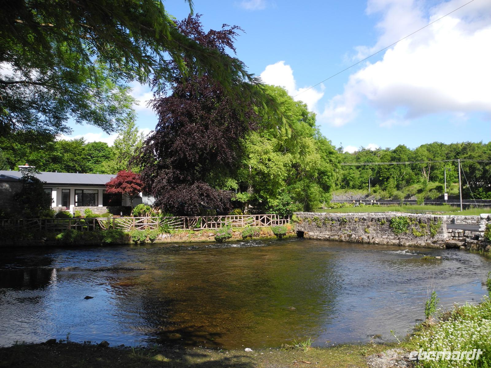 Gleich morgens fahren wir wieder zurück nach Galway und darüber hinaus in Richtung Westen bis zum Ort Oughterard, wo wir unseren ersten Stopp machen. Vorbei am River und Lough Corrib gelangen wir in dieses schicke Dörfchen und man merkt gleich, dass sich dort u.a. auch der Geldadel niedergelassen hat.