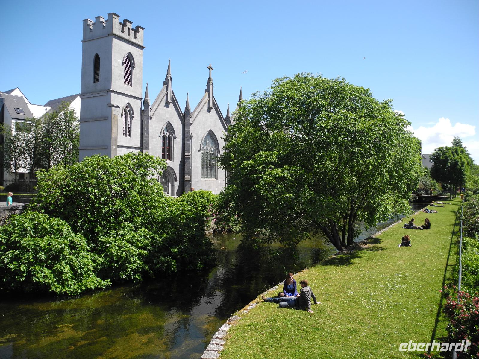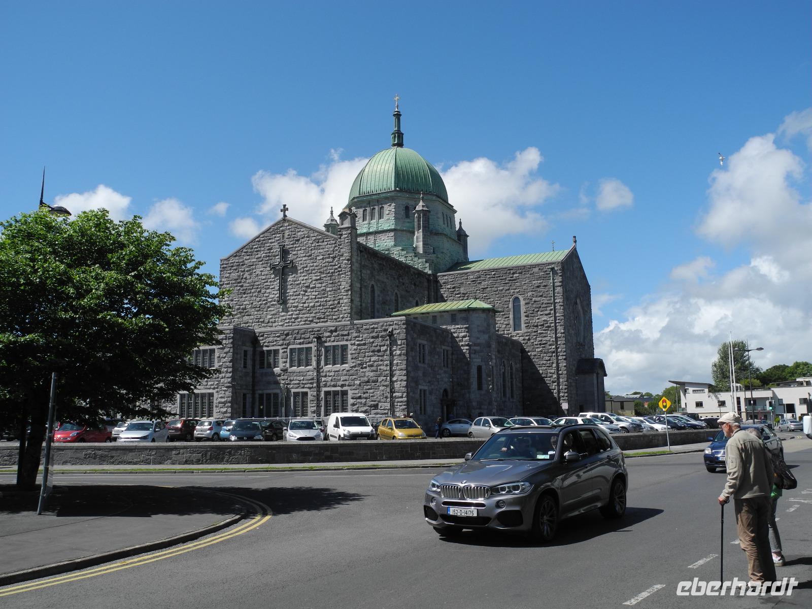 Auch wenn mancher aus unserer Gruppe geglaubt hatte, nun seinen Koffer in dieses Hotel tragen zu dürfen mussten wir dann nach einer schönen Rast mit diesem tollen Ausblick weiter gen Süden fahren, nämlich in den County Galway.Am Eingang von Galway, im mondän wirkenden Stadtteil „Salthill" zwang uns die Sonne quasi zu einem weiteren Stopp und einem Spaziergang an der schicken Strandpromenade, wo man am Ende den typischen „kick the wall" auszuführen hat, bevor man wieder in Richtung Innenstadt Galway zurück läuft. Dies ist kein Touristenulk, sondern ganz gewöhnliches Procedere der Bewohner von Galway.Danach, direkt in Galway-Stadt parken wir unseren Bus nahe der imposanten Kathedrale, um anschließend diese tolle, jugendliche Stadt zu sehen.