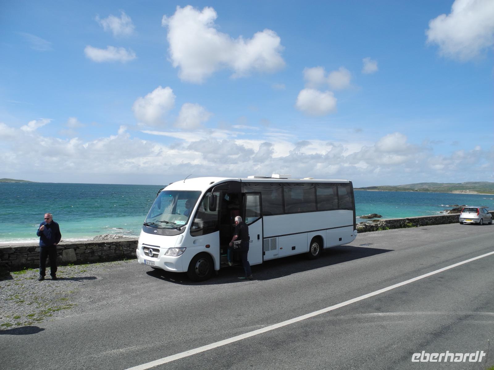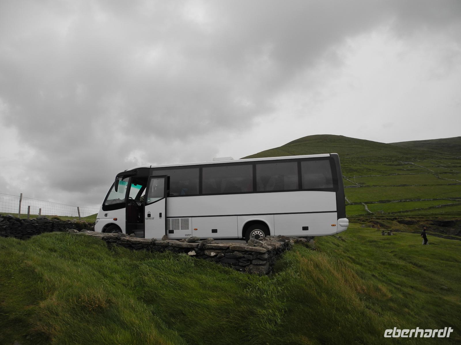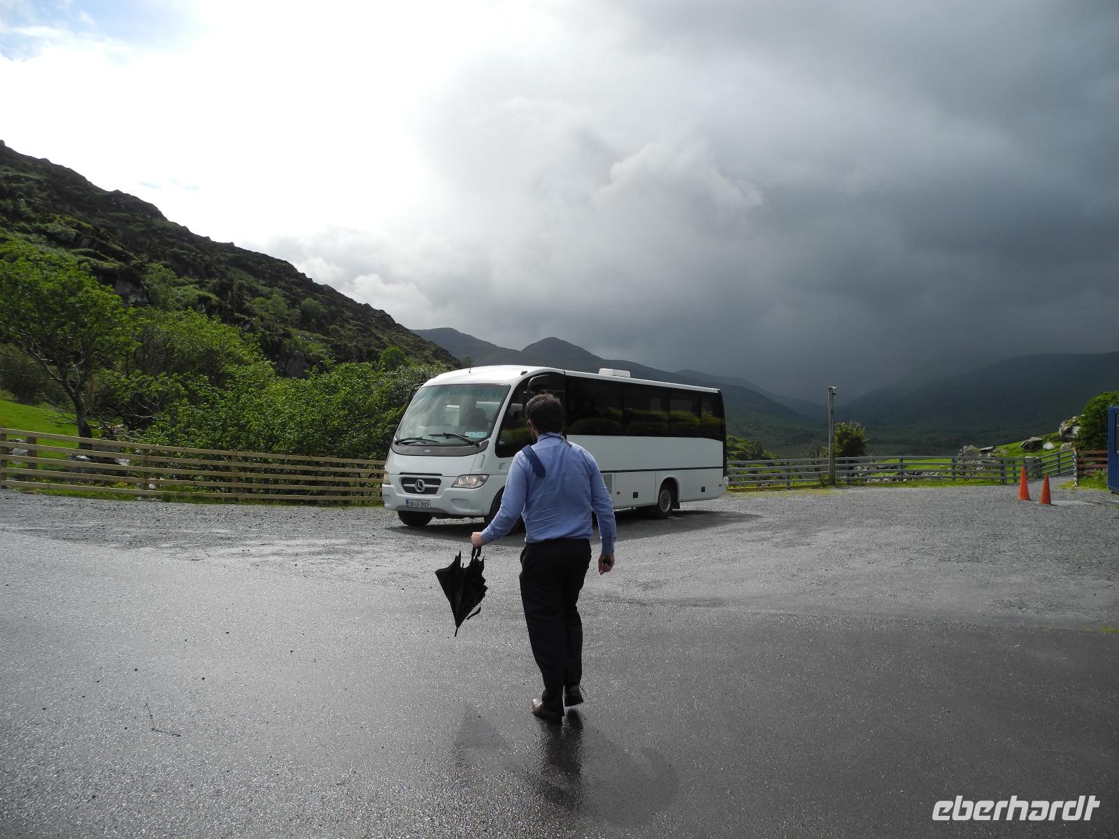 Glücklicherweise hat Oisín unser Busfahrer ein Auge auf uns und rettet uns unmittelbar aus dem plötzlich hereinbrechenden Regenschauer.