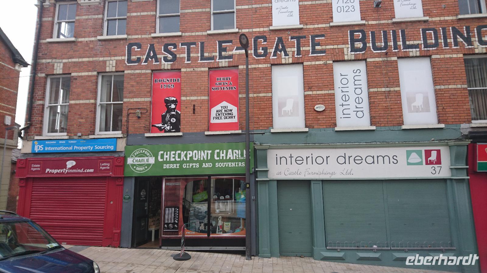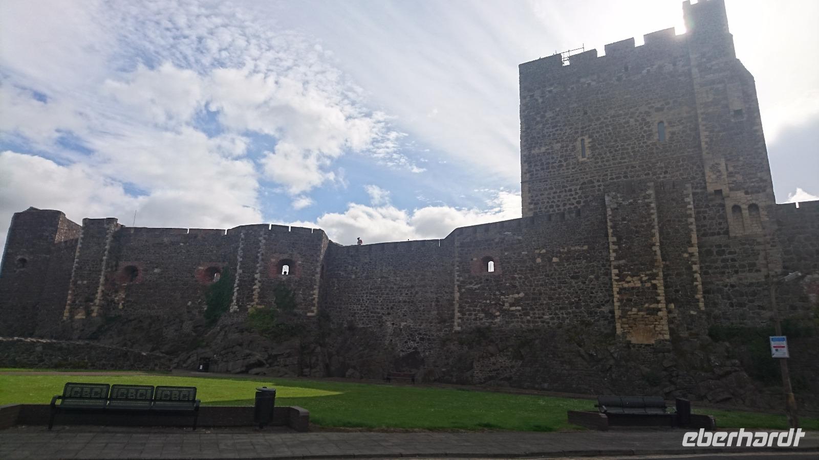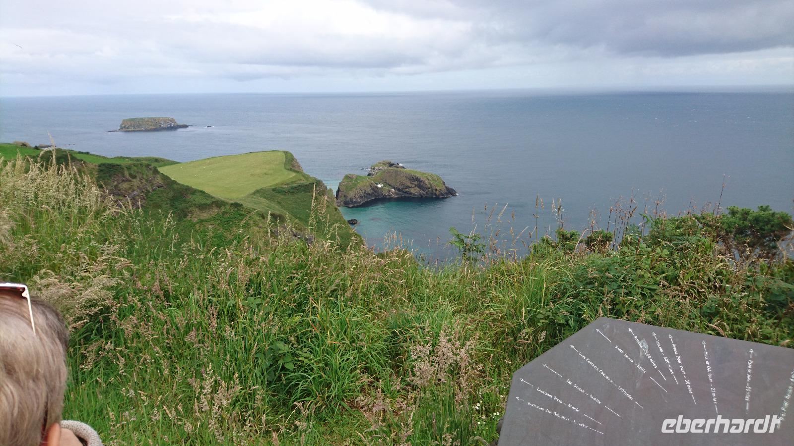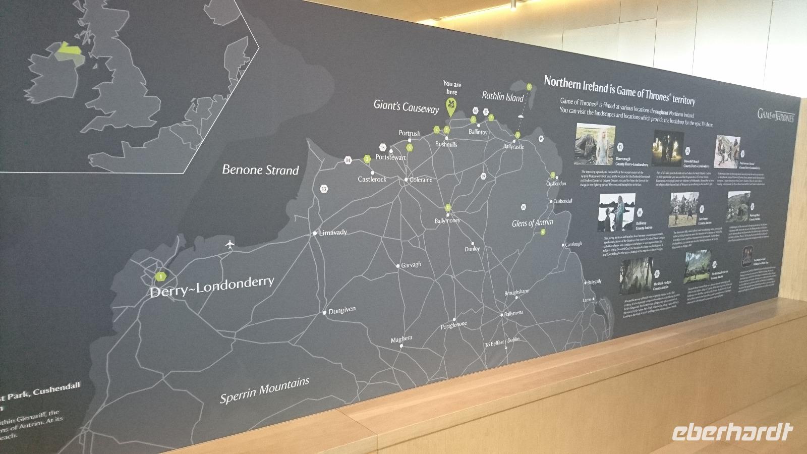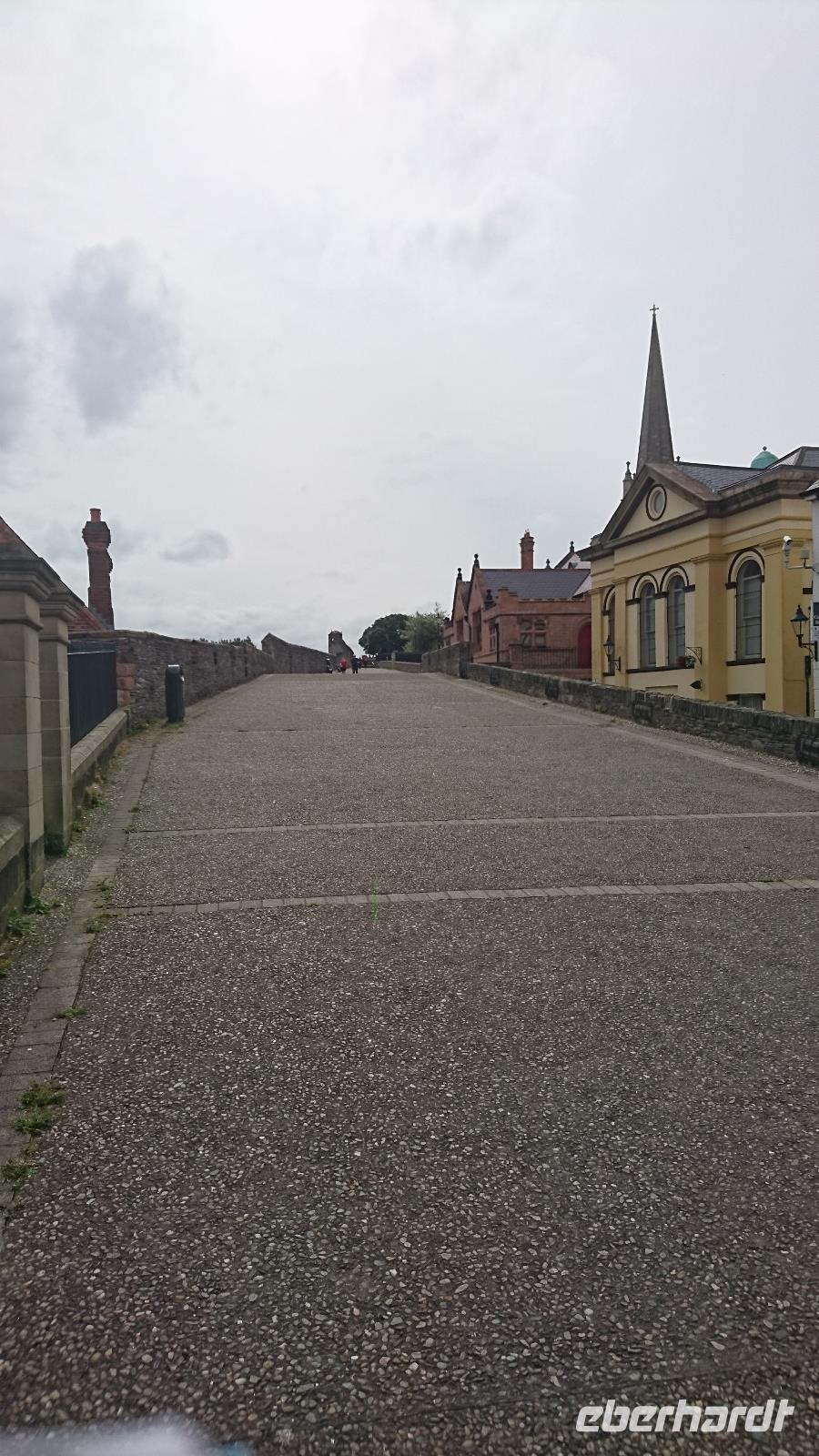 Eine Oma schenkte ihrem Enkel zur Hochzeit die Würde eines Barons von Carrickfergus. Erst wollten wir es gar nicht glauben, doch dann sahen wir die königliche Flagge über dem alten Castle im Ort unserer Übernachtung wehen, hielten auch noch einmal am Castle für ein paar Fotos. Prince William ist nun also ein Baron dieses Ortes. Stefan stellte uns nun noch die Zusatzangebote der Tour mit ein paar Filmminuten von DVD im Bus vor und wir konnten uns ein Bild davon machen, was wir zusätzlich zum Programm noch alles erleben würden. Nach dieser Erfahrung fuhren wir weiter an der nordirischen Küste entlang, sahen viele Gegensätze. Orte, die durch die Wahl ihrer Beflaggung zeigten, ob sie royal oder republikanisch eingestellt waren. Etwas bekümmert schauten wir nach den Flaggen, sahen wir doch erst am Vortag eine Teilung in Belfast und wussten nun um Vieles rund um Nordirland. Trotzdem freuten wir uns am Wetter, sahen auf einem Zwischenstopp in Carnlough einen originalen Film-Set der Serie Games of Thrones und kamen am Mittag nach einem Blick auf eine lange Hängebrücke zu einem Fischfelsen und hinüber nach Mull of Kintyre in Schottland zur Brücke der Riesen, dem Giants Causeway. Hier hatten wir, ausgestattet mit Audioguides, genügend Zeit, um das Gebiet an der Steilküste zu erwandern und zusätzlich noch einen irischen Eintopf im Besucherzentrum zu essen. Die Sage vom Riesen Finn, der die Brücke einst baute und dessen Rivale sie dann auf der Flucht vor der Macht des Erbauers aus Versehen zerstörte, berichtete uns Stefan schon vorab und wir erkannten an der Küste und bei unserem Rundweg einige gut zu deutende Überreste aus der Zeit der Riesen. Tiere aus Stein, ein Riesenschuh und Vieles Anderes. Später fuhren wir weiter, sahen das alte Castle der MacDonalds, die einst aus dem Glen Coe in Schottland hierher flohen und Dunluce Castle errichteten, fuhren durch Bushmills und gelangten schließlich in die Stadt mit dem Schrägstrich. Derry/Londonderry. Stefan führte uns mit vielen Erklärungen über die breite und heute noch die Stadt in Royalisten und Republikaner teilende Stadtmauer und wir hatten noch etwas Zeit für einen eigenen Bummel, ehe wir Nordirland später wieder verließen und bald darauf in Letterkenny eintrafen, um dort im Hotel einzuchecken und bald zu Abend zu essen.