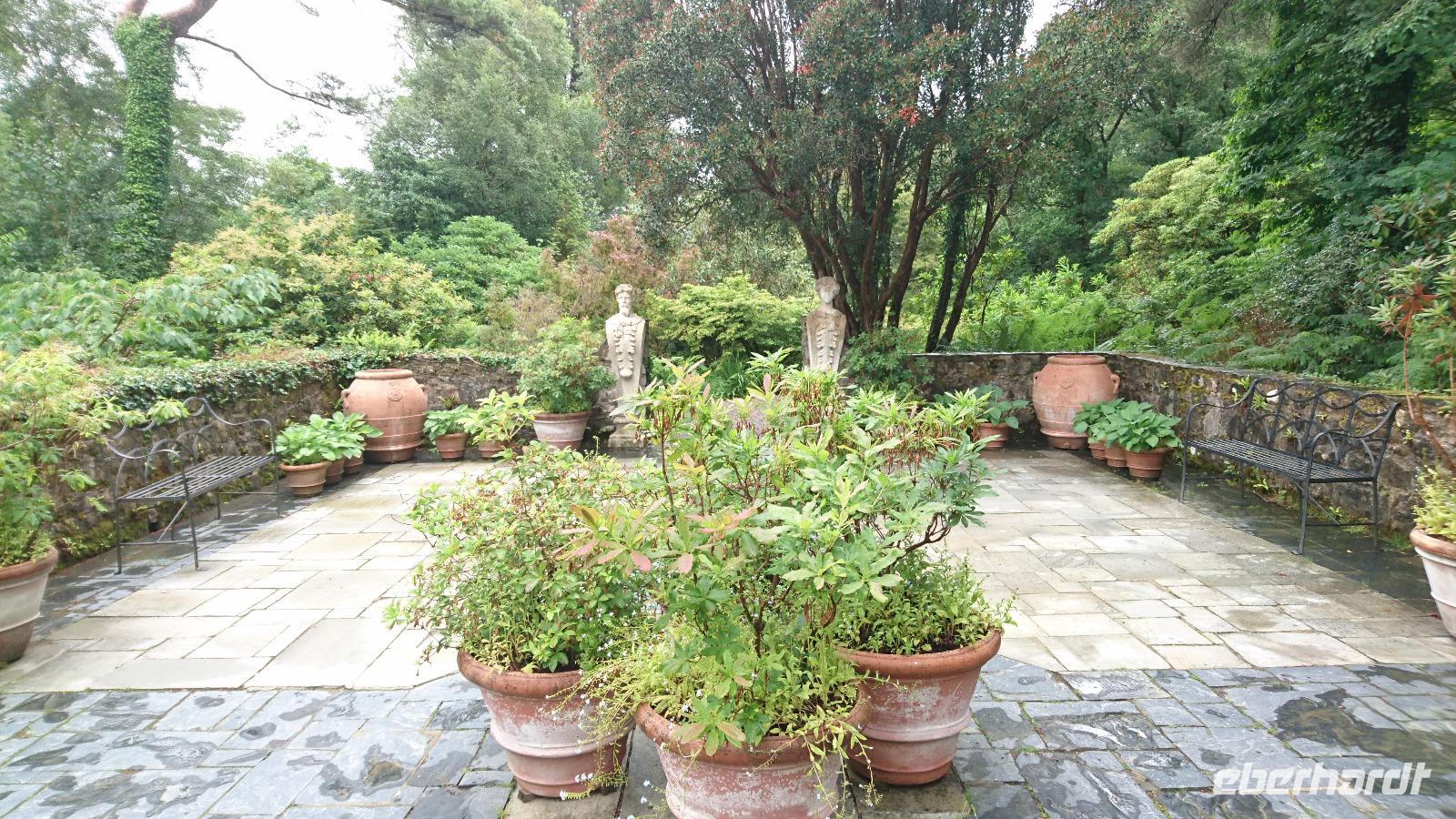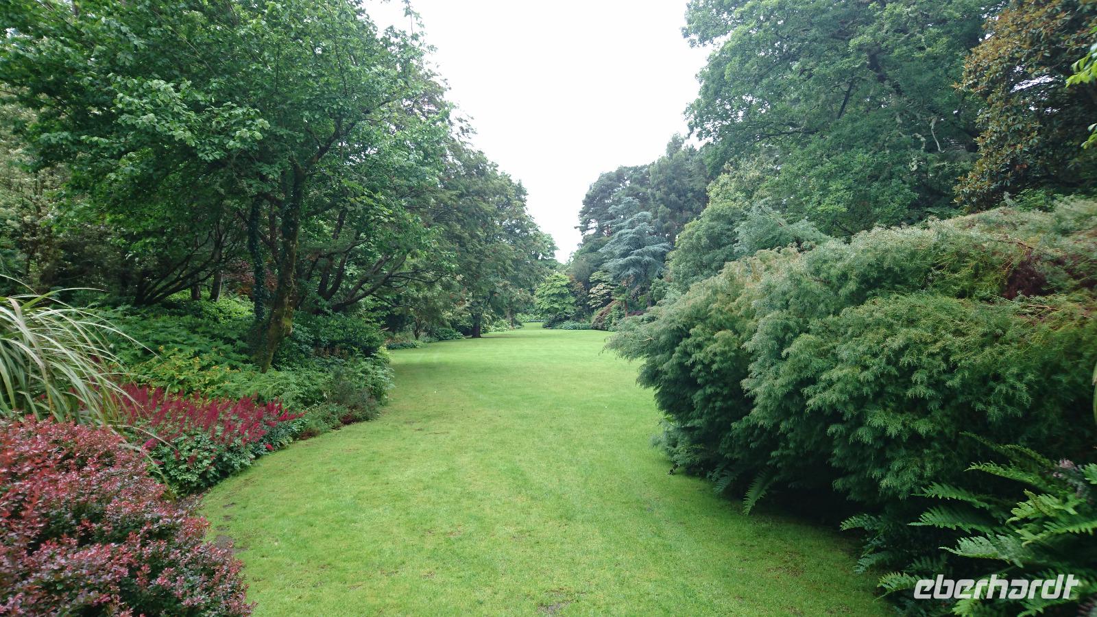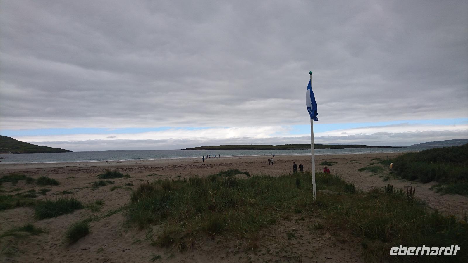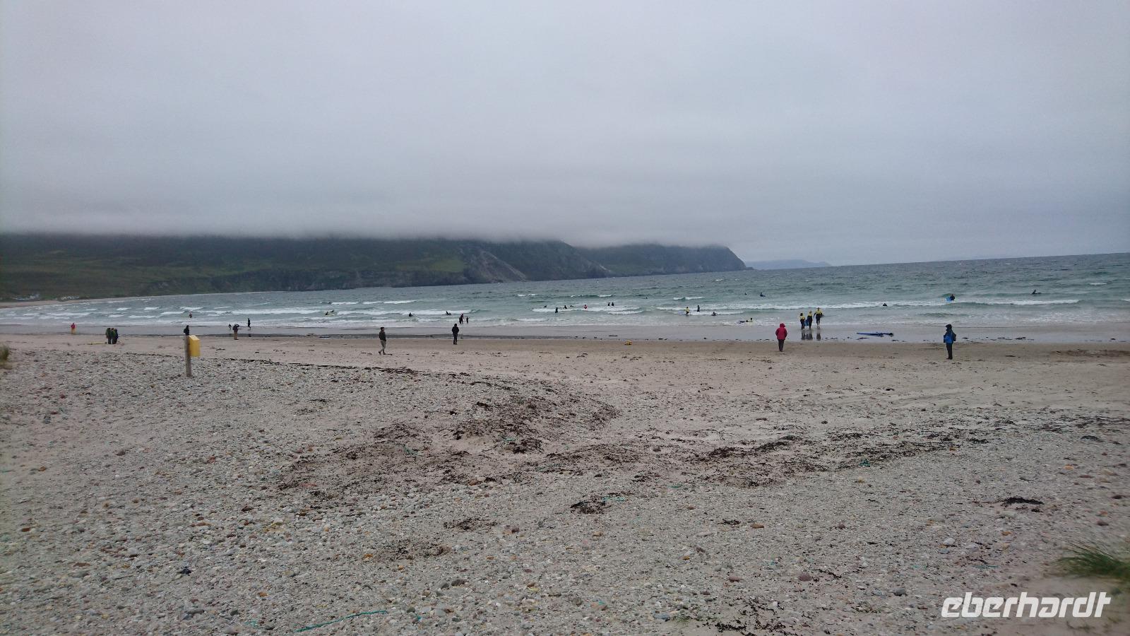Ein Nationalpark, in dem man einst in karger Vegetation ein Castle errichtete und um dieses herum eine Oase aus Garten, Park und gehegtem Land anlegte, der versprach schon tolle Eindrücke. So waren wir heute auch alle unterwegs nach Glenveagh, schauten uns erst auf der Fahrt an, wie eine Heide- und Torflandschaft plötzlich einem Park wich, sahen dann einen interessanten Film im Besucherzentrum, in dem uns in Deutsch alles Wichtige zur Entstehung, zur Geschichte und zum Erhalt von Park und Castle vermittelt wurde, ehe wir mit kleinen Shuttle-Bussen direkt zum Castle fuhren, in dem uns Stefan dann führte und uns zum Beisiel erläuterte, wozu man früher am Kamin ein Feuerschild benötigte oder in welchem Bett Greta Garbo einst schlief, wenn sie Glenveagh besuchte. Danach hatten wir Zeit, den Garten und den Park eingehend zu besichtigen, konnten auch in etwa 40 Minuten zum Besucherzentrum zurück laufen oder den schnelleren Weg per Shuttle-Bus wählen, um noch einen Happen im kleinen Bistro des Zentrums zu essen. Nach vielen tollen Eindrücken ging es nun quer durch den Nationalpark zum Mt. Errigal, der sich heute leider in den Wolken versteckte. Nun gut, wen er sich nicht sehen lässt, schauen wir eben auf den Atlantik! Stefan kannte einen kleinen Sandstrand an der Westküste und so fuhren wir, sicher gelenkt von Clive, nach Narin, stapften dort etwas durch den Sand, trauten uns auch, Barfuß ins Wasser zu gehen und genossen ein Eis an einem der kleinen Stände, ehe wir von dort im weiten Bogen und durch fast unberührte Landschaft zurück nach Letterkenny ins Hotel fuhren, wo man uns wieder ein schönes Abendessen bereitete. Manche von uns nutzten den Abend, um noch ein paar Schritte durch den Ort, die erste größere Stadt Donegals hinter der Nordirisch-Irischen Grenze, zu gehen und den einen oder anderen Pub aufzusuchen.