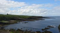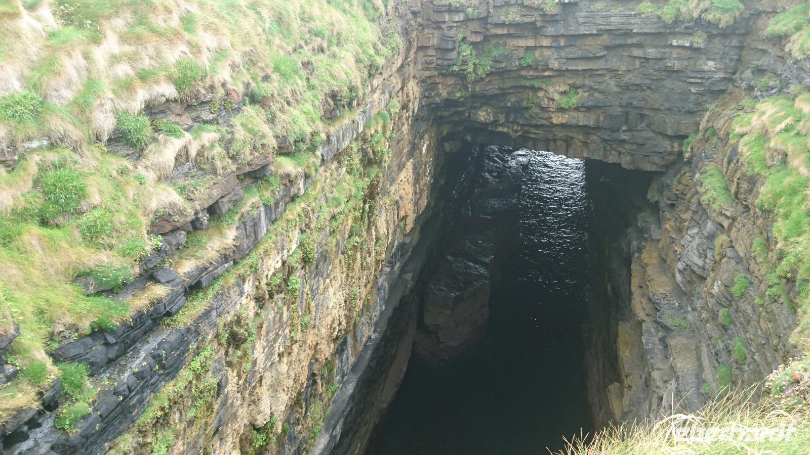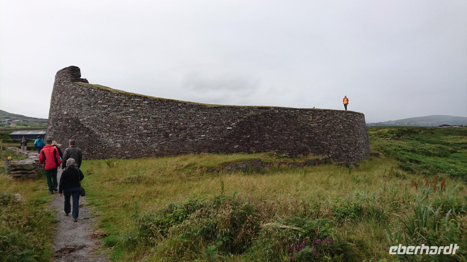 Genug Altes in Irland? Nein, natürlich nicht! Heute ging es nach Ceide Fields, doch auf der Fahrt dahin wollten wir noch weitaus mehr sehen. So stoppten wir zuerst in einem kleinen Nest Namens Killala und besuchten den dortigen Rundturm, von dem aus man eine herrliche Sicht über die dem Ort nach benannte Bucht hat. Dann ging es zum Downpatrick Head, einem zerklüfteten Felsenstück mit Höhlen und einzeln im Wasser stehenden Felsen. Hier versteckten sich nicht nur Freiheitskämpfer erfolgreich, sondern hier konnte man auch einiges im ersten und zweiten Weltkrieg im wahrsten Sinne des Wortes von der Oberfläche verschwinden lassen. Dann ging es zu den Ausgrabungen. In Ceide Fields entdeckte man vor einigen Jahrzehnten mehr durch Zufall beim Torfstechen gerade Formationen aus Stein unter der dicken Torfschicht. Eine neuartige und den Boden nicht zerstörende Suchmethode, entwickelt vom Sohn des einstigen Entdeckers des Feldes, legte nahe, dass es sich um ein Dorf, eine ausgiebig genutzte Landwirtschaftsfläche, eben ein Überbleibsel einer sehr alten Kultur handeln musste. Man konnte mittels Karbonanalysen feststellen, dass die dort einst Lebenden aus dem Megalith-Zeitalter stammen mussten, doch warum und wohin sie später das Gebiet verließen, weiß man bis heute nicht. Klar ist jedoch, dass sie in Frieden und ohne Hast gingen, denn man findet kaum etwas Zurückgelassenes. Alles, was sie verwerten oder nutzen konnten, nahmen sie einst mit. Die Führung, die uns Stefan übersetzte, war sehr interessant. Danach mussten wir uns sputen, denn noch eine weite Strecke lag vor uns. Wir wollten nach Achill Island, einer westlichen, direkt der Küste vorgelagerten Insel, die man nur über eine einzige Brücke über den Achill Sound erreichen kann. Die Strecke zieht sich ganz schön lang hin, doch was wir dann sahen, war sehr schön. Ein Surfer-Paradies wartete in Keel auf uns. Wir verbrachten dort einige Zeit. Es war windig, aber nicht zu kalt. Der Nebel gab den Felsen um den Strand herum ein mystisches Aussehen und wir genossen die Zeit. Dann ging es zurück und noch vorbei an der Farm von Heinrich Böll. Uns war klar, dass er sich hier wohlfühlte und ungestört schreiben konnte. Später fuhren wir einen weiten Bogen durch interessante Landschaften und kamen schließlich wieder zurück nach Ballina zum Hotel und zum Abendessen. Ein weiterer interessanter Irland-Tag ging zu Ende.