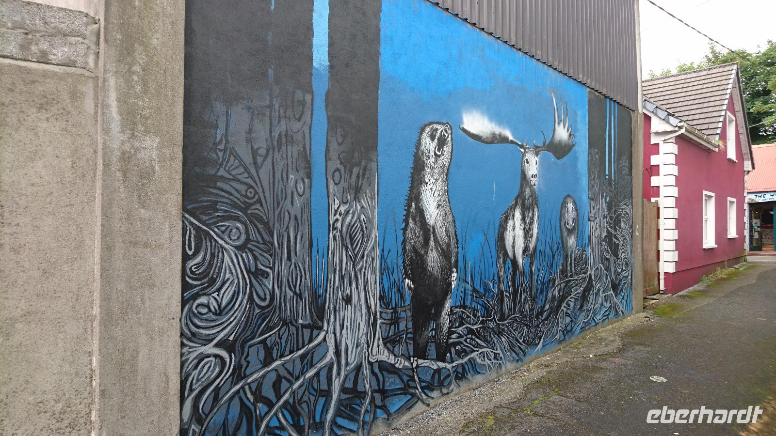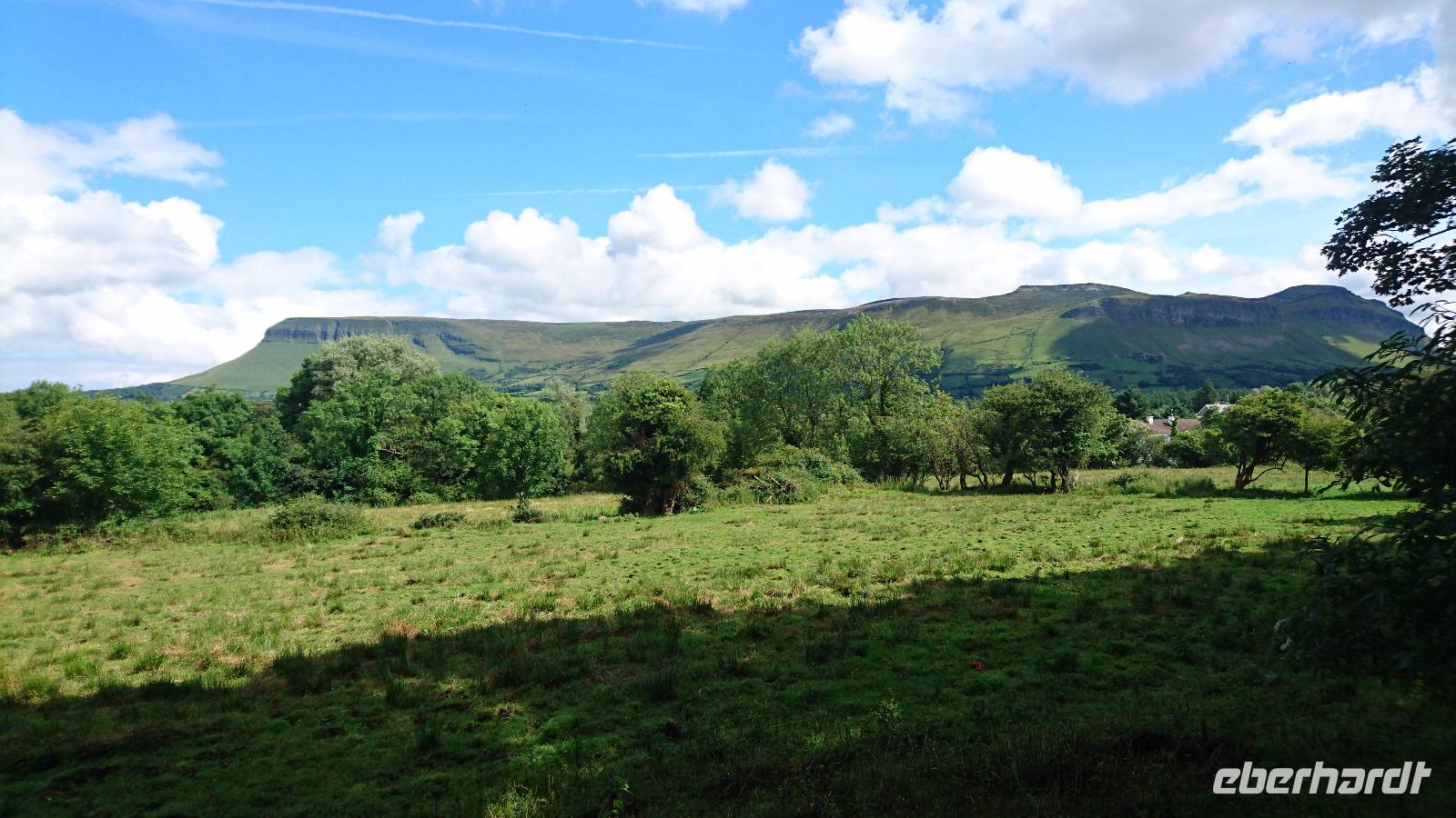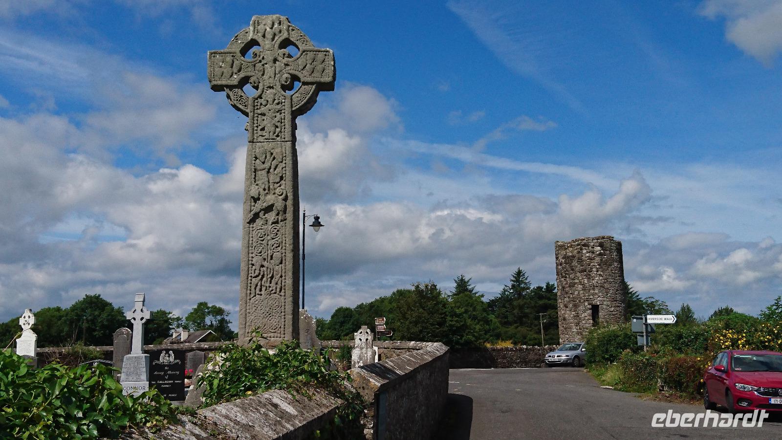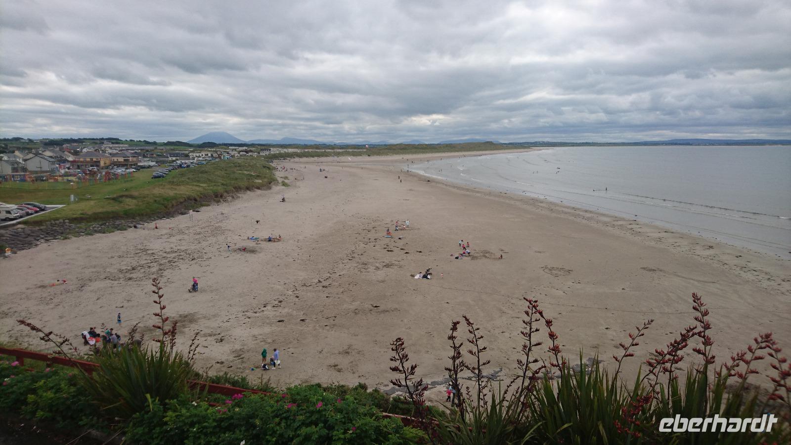 Krone und Irland. Erklärte uns nicht Stefan, dass Irland eine Republik ist und dass man sich ebenso aus dem Commonwealth verabschiedete, gar Besitz der Krone nicht mehr anerkannte? Ja, das stimmte schon. Nur wurde und wird Besitz der Krone heute in Irland einzelnen Personen zugeschrieben. So auch Mullaghmore, welches den Montbattens gehörte und immer noch gehört. In den Siebzigern war es wohl, dass die IRA den damaligen Lord Montbatten und seine Familie in der Bucht vor dem kleinen Ort umbrachten. Erst vor zwei Jahren waren erstmals wieder Royals zu Besuch in Irland und Stefan konnte uns eine verrückte Geschichte rund um deren Blockade aller Reiseziele an einem Tag seiner vorherigen Reisen hierher berichten. Wir schauten uns dabei das Castle der Montbattens an, bestaunten die Steilküste und schüttelten über alles Andere den Kopf. Danach ging es nach Drumcliff, wo wir am Friedhof hielten und uns erst einmal das Grab des irischen Nationaldichters W.B. Yeats anschauten, ehe wir unser Glück beim Vorbeigehen am alten Rundturmfragment versuchten. Der klügste Mensch der Welt war wohl nicht unter uns, denn der Turm blieb trotz redlicher Versuche stehen. Nun gut. Dann sahen wir uns noch das alte keltische Hochkreuz am Friedhof an und weiter ging es gen Carrowmore. Wieder Gräber. Diesmal jedoch mehrere Tausend Jahre alt. Megalithkulturen sollten sie hinterlassen haben. Die sagenumwobene Königin Maeh lebte wohl einst beim heutigen Sligo und trotzdem fand man bisher noch kein zu den dortigen Gräbern gehörendes Dorf. So fuhren wir noch ein Stück den Knocknarea hinauf, schauten zum Ben Bulben hinüber und bummelten dann als verspätete Mittagspause durch Sligo, ehe wir am späten Nachmittag noch einen Blick auf den Atlantikstrand bei Inishcron riskierten und danach bald unser Hotel in Ballina erreichten, wo man uns später ein tolles Abendessen bereitete.