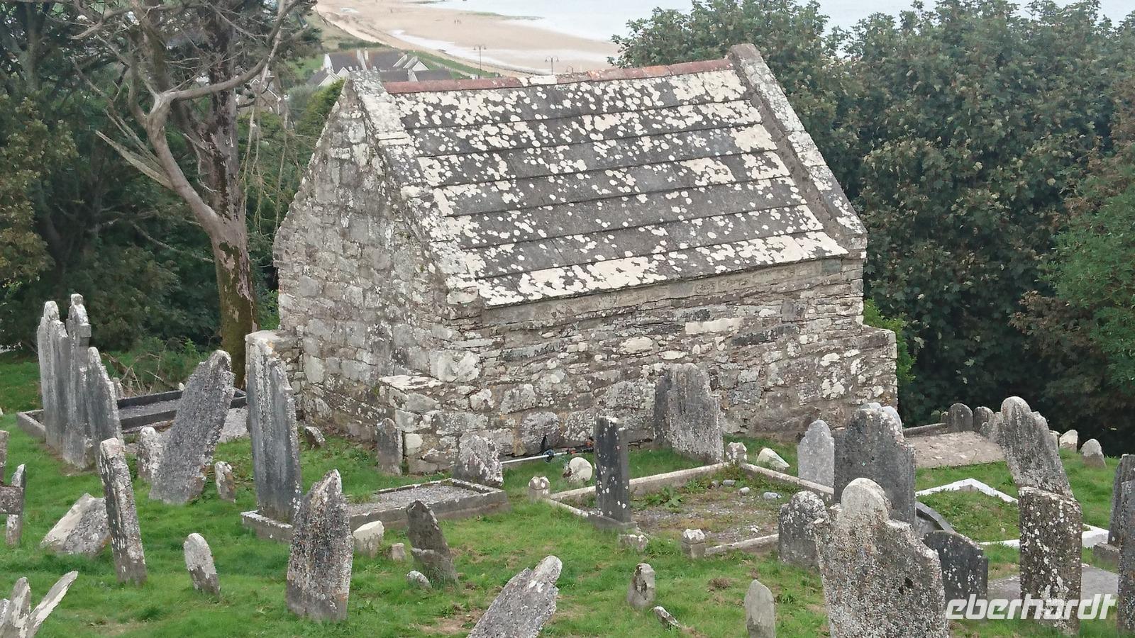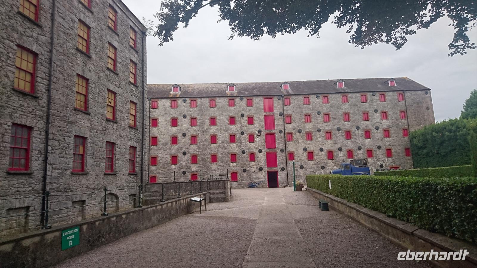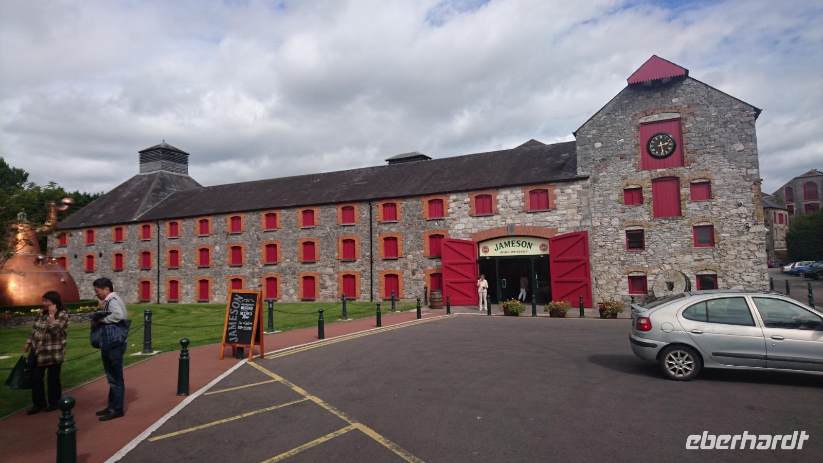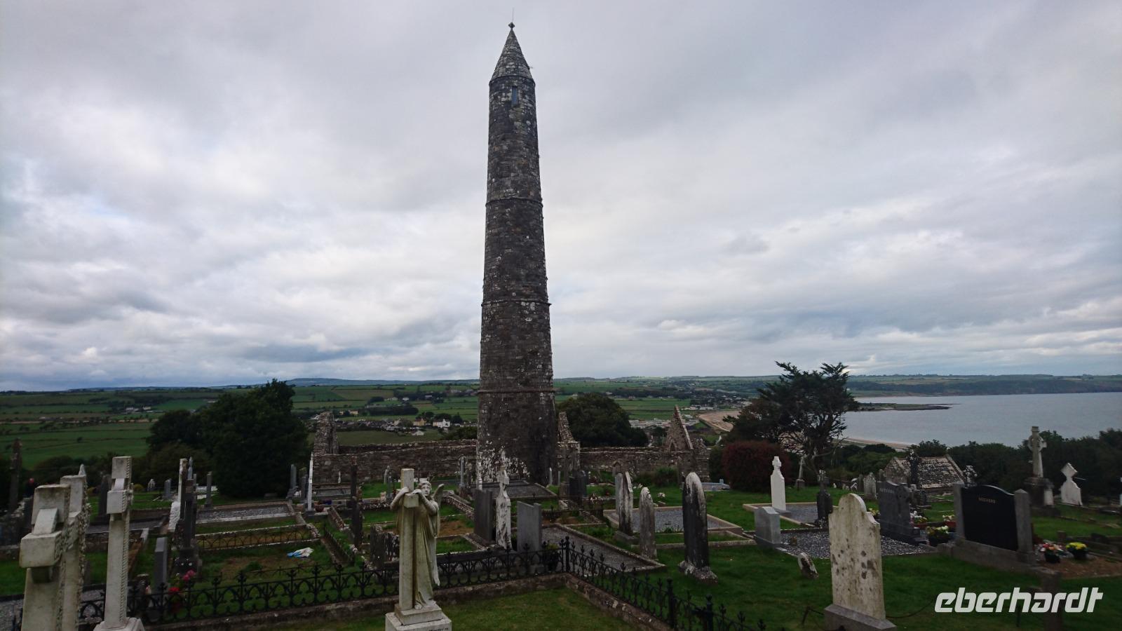 Nach Süden und nach Osten. Der größte Teil der Insel war schon umrundet. Nun kamen wir mit einem kleinen Zwischenstopp in Mackroom beim alten Castle und neben dem alten Friedhof später vor dem Mittag ins ehemalige Queenstown, dem heutigen Cobh. Hier legte einst die Titanic das letzte Mal an, ehe sie später auf See sank. Natürlich gibt es darum auch hier eine entsprechende Ausstellung, doch leider stellte man sich hier noch nicht auf die deutschen Besucher ein, sodass wir von einem Besuch Abstand nahmen. Lieber bummelten wir am Hafen entlang, sahen, wo früher und heute die großen Schiffe anlegten und gingen auch durch die Geschäfte. Dazu mussten wir etwas essen, denn wir benötigten für den nächsten Programmpunkt des Tages eine gute Grundlage. Es ging dann nach Midleton, zur Jameson Destillerie. Eine Führung in Deutsch war sehr interessant. Alle durften wir den Unterschied zwischen irischem, schottischen und US-amerikanischen Whisk(e)y herausschmecken und später in der bar noch einen Jameson auf Kosten des Hauses probieren. Manch ein kleines Mitbringsel aus dem Shop der Destillerie wanderte dann mit uns in den Bus und später nach Hause. Weiter ging es nach Ardmore, wo uns Stefan noch einen Rundturm auf einem alten Abbey-Friedhof mit herrlicher Sicht auf den darunter liegenden Sandstrand zeigte, ehe wir am Abend Waterford und unser nächstes Hotel erreichten.