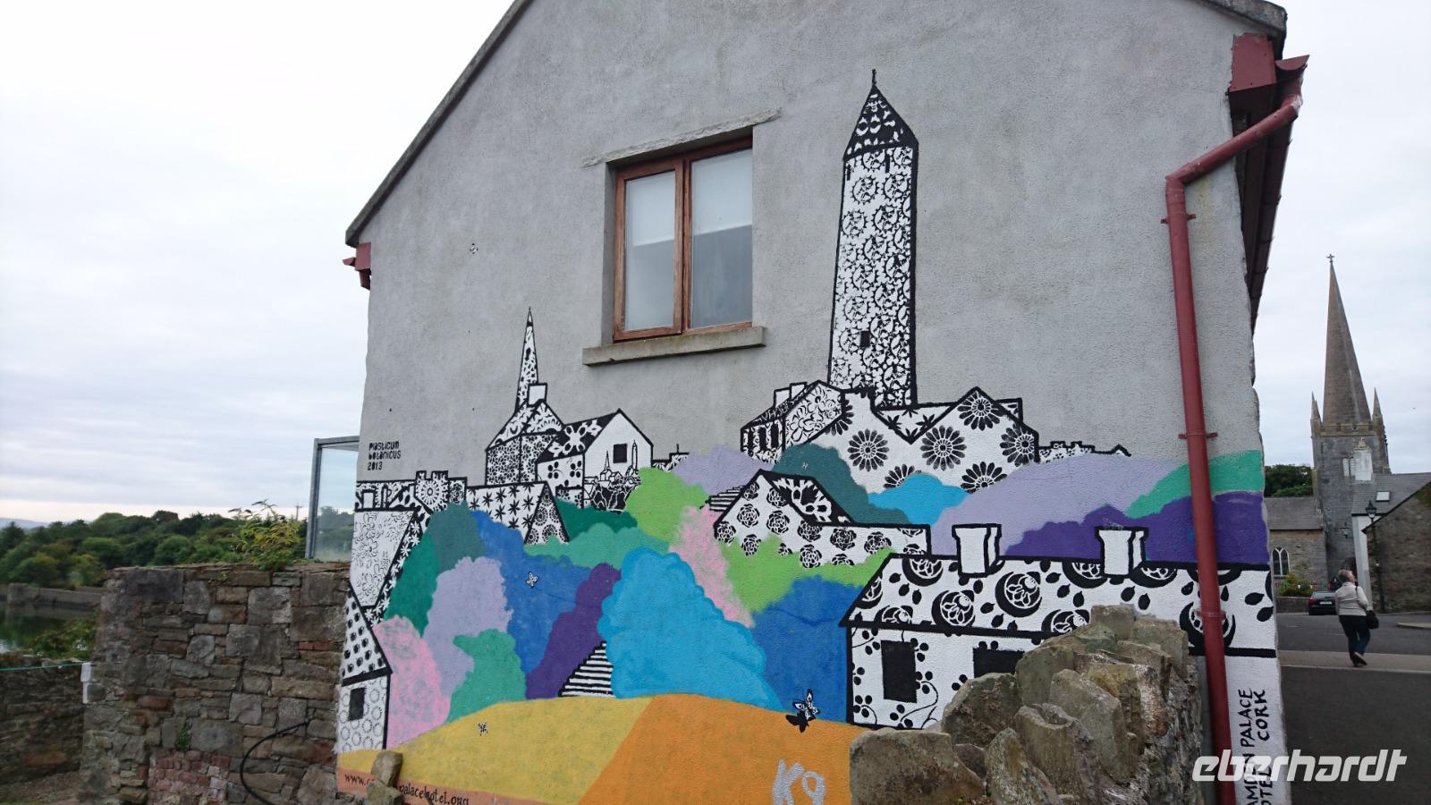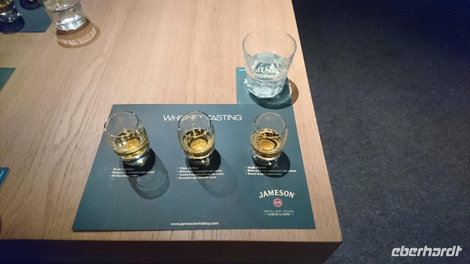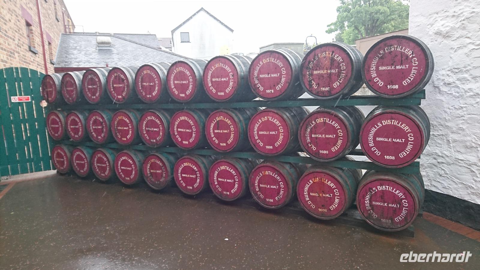 Nach Süden und nach Osten. Der größte Teil der Insel war schon umrundet. Nun kamen wir mit einem kleinen Zwischenstopp in Mackroom beim alten Castle und neben dem alten Friedhof später vor dem Mittag ins ehemalige Queenstown, dem heutigen Cobh. Hier legte einst die Titanic das letzte Mal an, ehe sie später auf See sank. Natürlich gibt es darum auch hier eine entsprechende Ausstellung, doch leider stellte man sich hier noch nicht auf die deutschen Besucher ein, sodass wir von einem Besuch Abstand nahmen. Lieber bummelten wir am Hafen entlang, sahen, wo früher und heute die großen Schiffe anlegten und gingen auch durch die Geschäfte. Dazu mussten wir etwas essen, denn wir benötigten für den nächsten Programmpunkt des Tages eine gute Grundlage. Es ging dann nach Midleton, zur Jameson Destillerie. Eine Führung in Deutsch war sehr interessant. Alle durften wir den Unterschied zwischen irischem, schottischen und US-amerikanischen Whisk(e)y herausschmecken und später in der bar noch einen Jameson auf Kosten des Hauses probieren. Manch ein kleines Mitbringsel aus dem Shop der Destillerie wanderte dann mit uns in den Bus und später nach Hause. Weiter ging es nach Ardmore, wo uns Stefan noch einen Rundturm auf einem alten Abbey-Friedhof mit herrlicher Sicht auf den darunter liegenden Sandstrand zeigte, ehe wir am Abend Waterford und unser nächstes Hotel erreichten.