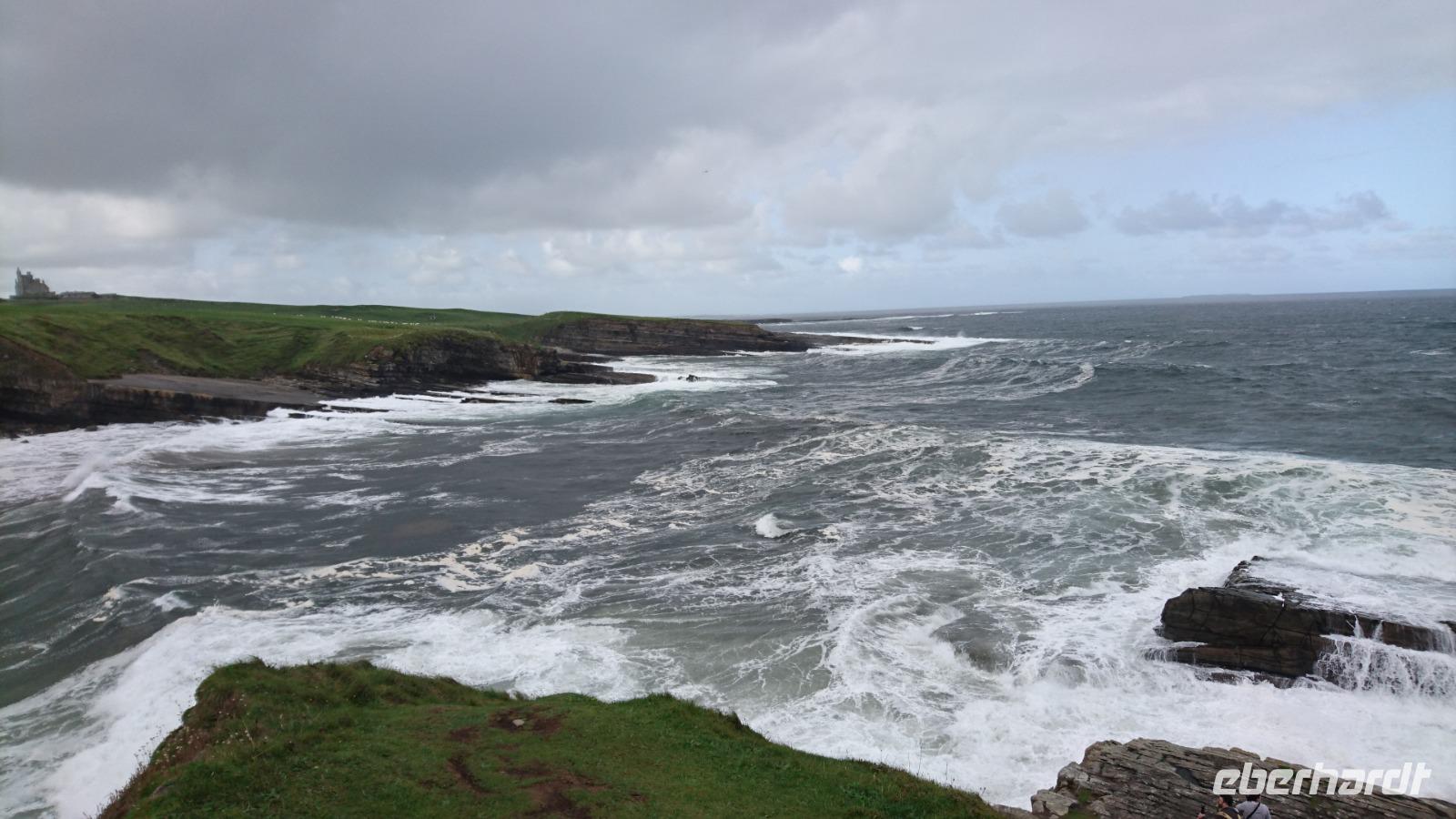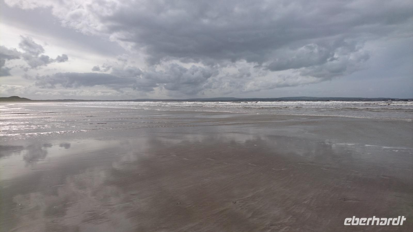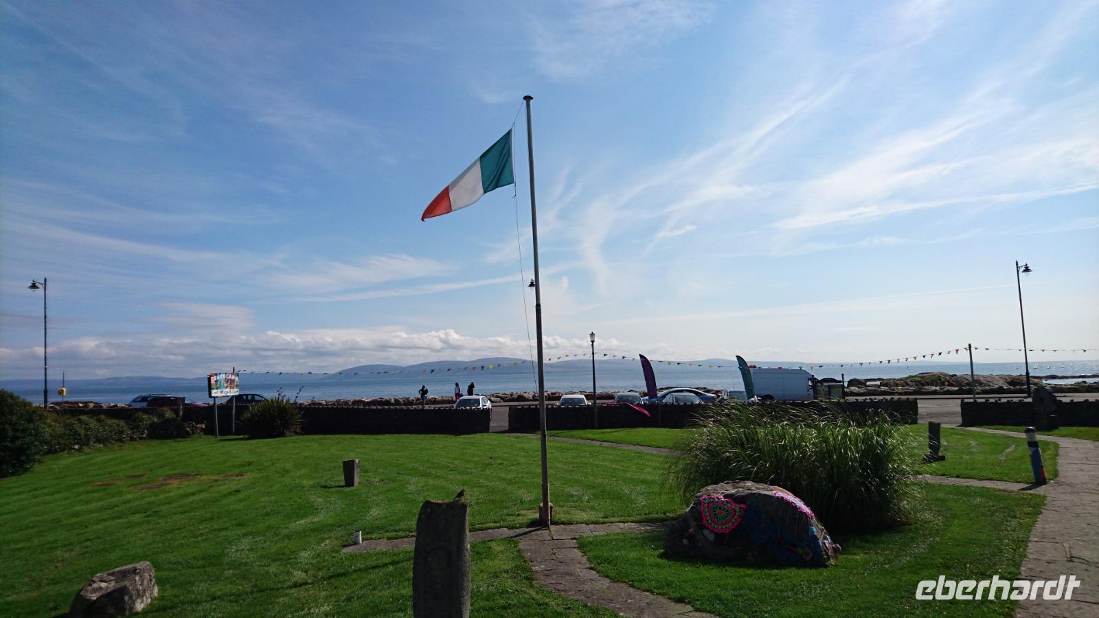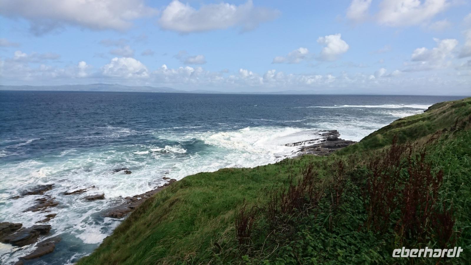 In den Süden, immer den Wild Atlantic Way entlang ging es heute. Nicht nur das alte Castle Mullagmore der Familie Montbatten war interessant auf den schroffen Felsen an der Küste zu sehen, sondern eben die Steilküste am Mullaghmore Head hatte für diverse Fotostopps wunderbare Motive für uns. Dann stauchten wir wieder in irische Geschichte ein, besuchten das Grab von W.B.Yeats, irischer Nationaldichter, in Drumcliff, versuchten dort auch gleich unser Glück mit dem noch stehenden Rundturmsegment, das endgültig zusammenfallen sollte, wenn er klügste Mensch der Welt daran vorbei ginge. Na ja, wir wollten unsere Klugheit heute nicht Jedem zeigen, sondern schauten uns einfach die alten Hochkreuze des Friedhofes an und fuhren weiter nach Sligo, der kleinen Stadt weiter südlich, wo wir unsere Mittagspause am Fluss, in den Pubs oder Einkaufszentren verbrachten, ehe wir noch einmal in der Geschichte zurück wandwerten und die alten Megalithgräber in Carrowmore besuchten. Um jedoch nach so vielen Informationen auch noch ein wenig die Seele baumeln lassen zu können, stoppten Oisin und Stefan für uns noch an zwei wunderschönen Stränden und wir bummelten über den Sand, sammelten Muscheln und genossen die Ruhe zwischen Wind, Wolken, Wasser und Sand, ehe wir schließlich nach Ballina in unser ebenso ruhig am Ortsrand gelegenes Hotel fuhren und den Tag mit Abendessen und einem kleinen Spaziergang am nahen Bach ausklingen ließen.