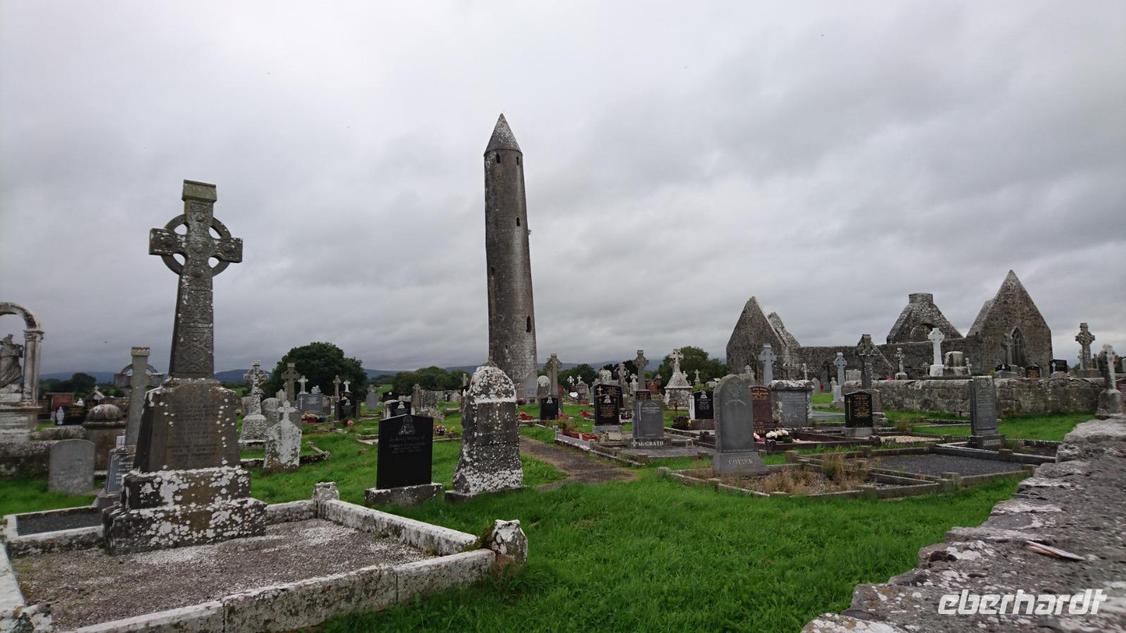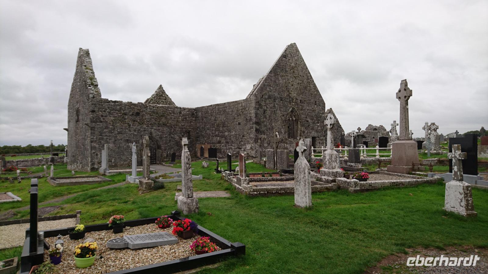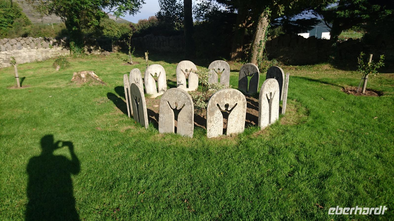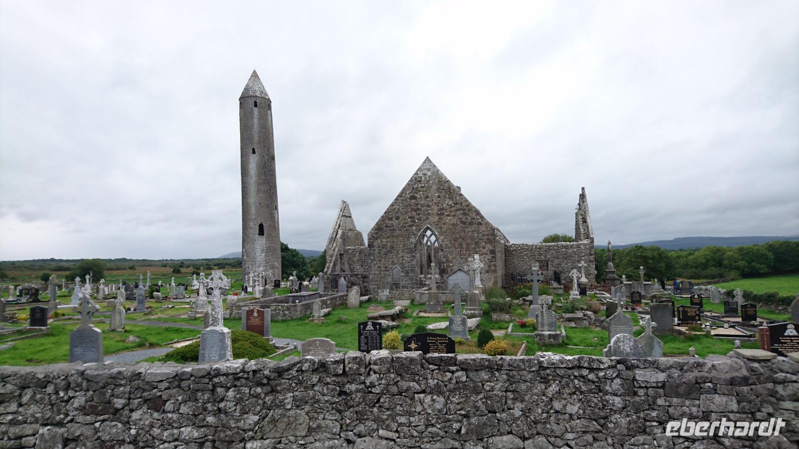 Weiter gen Süden führte uns heute unser Weg, denn unser Ziel war und blieb es ja, die Insel einmal komplett zu umrunden, ehe wir wieder nach Hause fliegen würden. So fuhren wir heute wieder durch herrliche Natur, entlang der schroffen Küste und durch herrliche Täler, wie eben auch jenem einst als fürstliches Jagdrevier hergerichteten Tal von Delphi. So gelangten wir gegen Mittag nach Cong. Dieser Ort hat eine bewegte Geschichte. Einmal gab es eints ein Castle, von dem man heute nichts mehr sieht, zum anderen stehen hier die Reste einer Abbey, die heute noch so beliebt ist, dass wir darin eben eine Hochzeit erleben durften. Dann finden sich am Ortsrand Reste eines Kanalbauversuches mit Schleusensystem, welches jedoch nie wirklich in Betrieb ging, denn das dahinein geleitete Wasser versickerte schon vor der Eröffnung im Karstgestein, wodurch man den Kanal einfach als ‚den trockenen Kanal' bezeichnet. Warum jedoch viele Menschen heute nach Cong kommen, hat einen anderen Grund: Hier drehte einst John Ford den Film ‚Der Sieger' mit Mauren O'Hara und John Wayne in den Hauptrollen. Natürlich gibt es die originalen Filmdrehorte noch, man kann ein zugehöriges Museum besuchen und ebenso eine Statue der beiden Haupthelden bewundern. Für uns ing es anschließend weiter gen Gort, doch ehe wir zum Hotel fuhren, besuchten wir noch den Coole Park der Lady Gregory, der einstigen Muse von W.B.Yeats, und den Unterschriftenbaum im ummauerten Garten und unternahmen danach noch einen Bus-Ausflug nach Kilmadough, einer alten Abtei, die lange Jahrzehnte in sich verfiel und nun wieder als Friedhof genutzt wird. Die alten Ruinen und der Rundturm, alte und neue Gräber auf der grünen Wiese, darum herum Kuh- und Schafherden, das alles gab diesem abendlichen Besuch eine besondere Note, die wir nicht missen wollten. Später fuhren wir ins altehrwürdige Hotel der Lady Gregory in Gort und ließen uns beim Abendessen und an der Bar verwöhnen, ehe wir Kraft für künftige Erlebnisse tankten und den Tag ausklingen ließen.