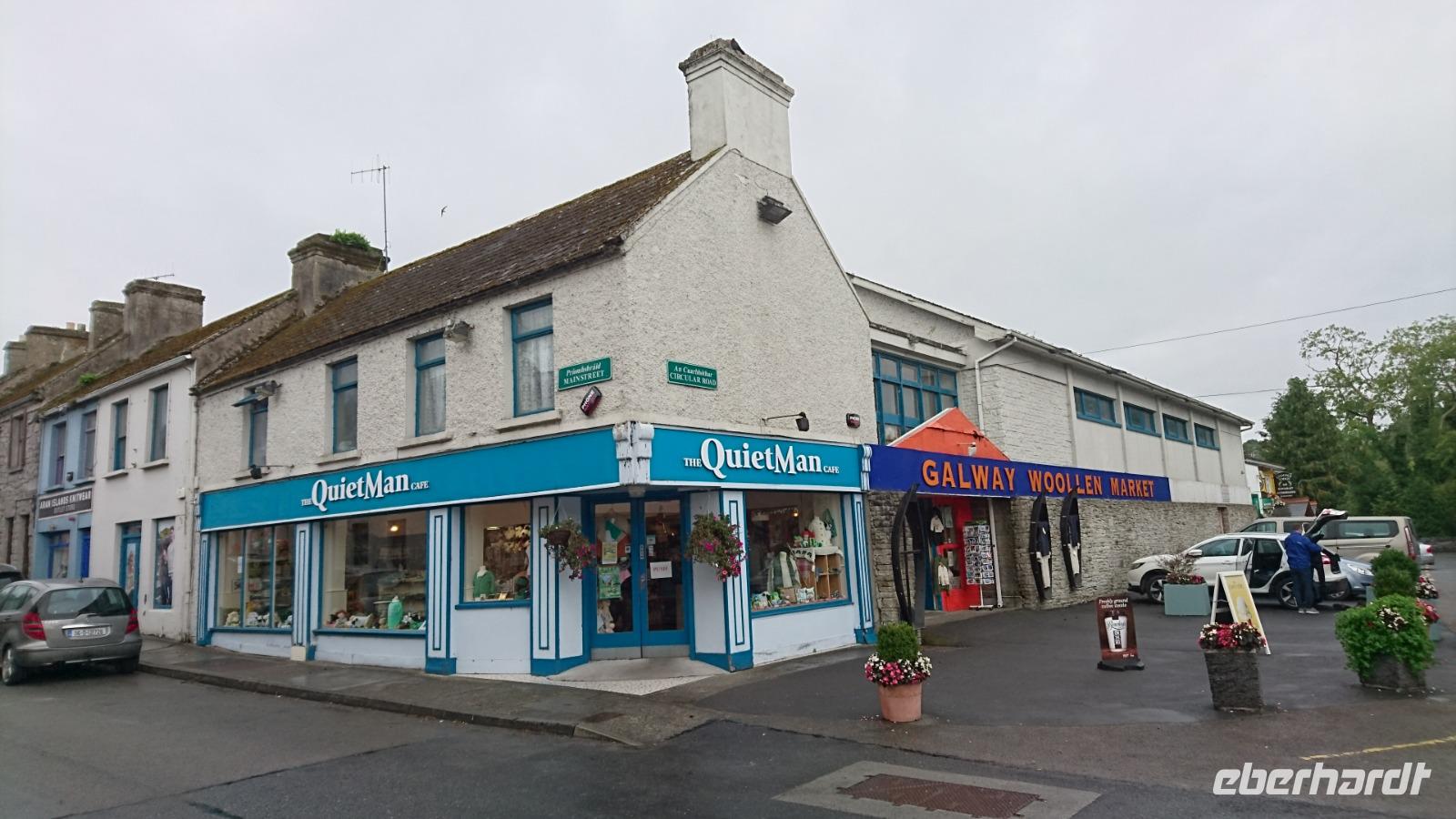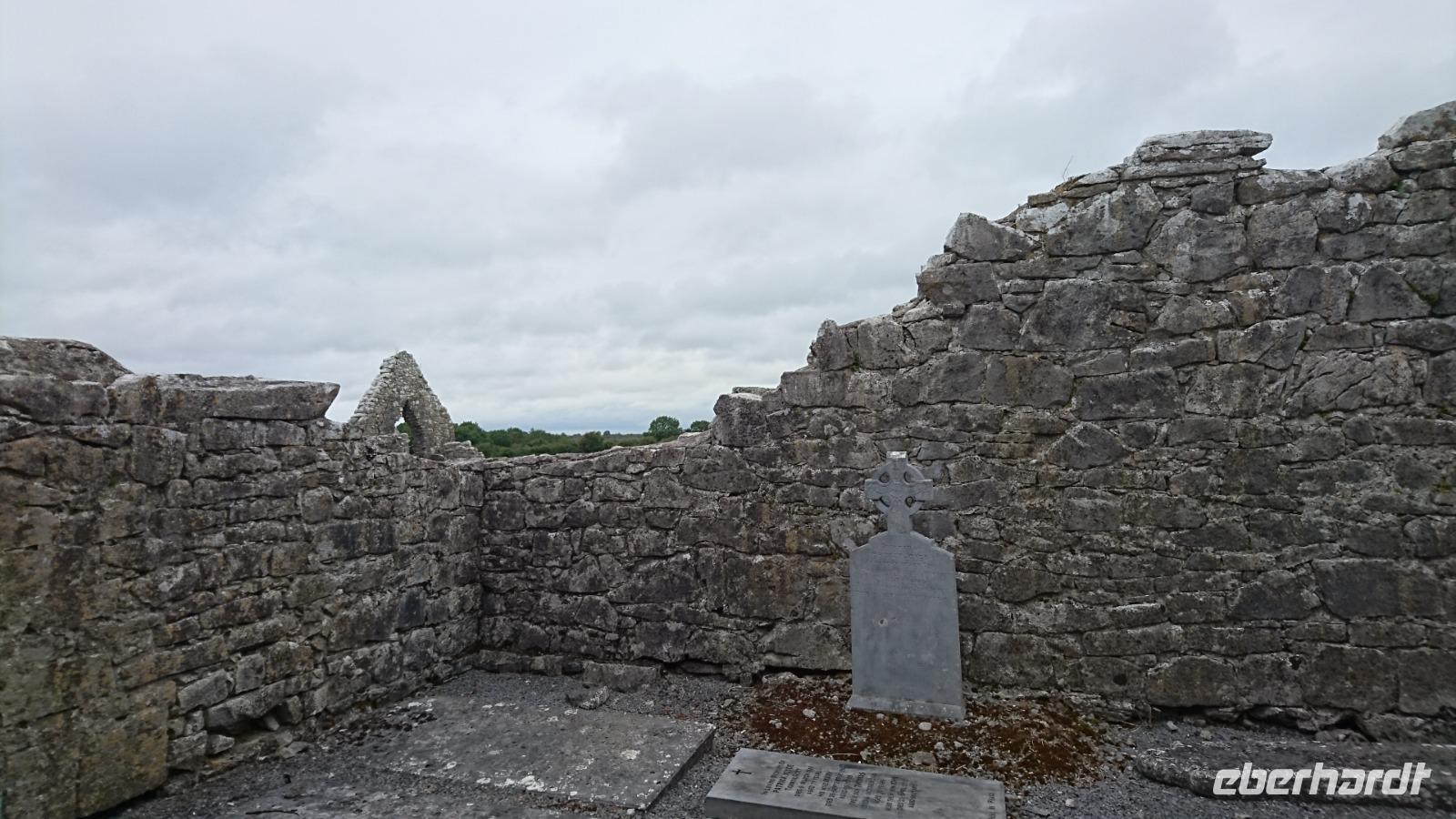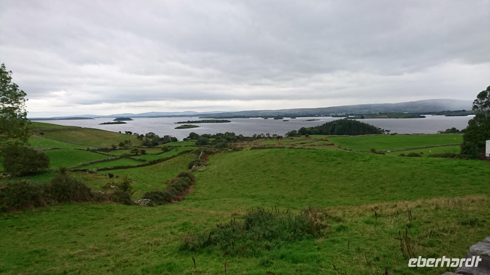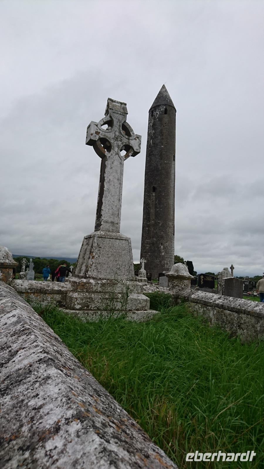 Weiter gen Süden führte uns heute unser Weg, denn unser Ziel war und blieb es ja, die Insel einmal komplett zu umrunden, ehe wir wieder nach Hause fliegen würden. So fuhren wir heute wieder durch herrliche Natur, entlang der schroffen Küste und durch herrliche Täler, wie eben auch jenem einst als fürstliches Jagdrevier hergerichteten Tal von Delphi. So gelangten wir gegen Mittag nach Cong. Dieser Ort hat eine bewegte Geschichte. Einmal gab es eints ein Castle, von dem man heute nichts mehr sieht, zum anderen stehen hier die Reste einer Abbey, die heute noch so beliebt ist, dass wir darin eben eine Hochzeit erleben durften. Dann finden sich am Ortsrand Reste eines Kanalbauversuches mit Schleusensystem, welches jedoch nie wirklich in Betrieb ging, denn das dahinein geleitete Wasser versickerte schon vor der Eröffnung im Karstgestein, wodurch man den Kanal einfach als ‚den trockenen Kanal' bezeichnet. Warum jedoch viele Menschen heute nach Cong kommen, hat einen anderen Grund: Hier drehte einst John Ford den Film ‚Der Sieger' mit Mauren O'Hara und John Wayne in den Hauptrollen. Natürlich gibt es die originalen Filmdrehorte noch, man kann ein zugehöriges Museum besuchen und ebenso eine Statue der beiden Haupthelden bewundern. Für uns ing es anschließend weiter gen Gort, doch ehe wir zum Hotel fuhren, besuchten wir noch den Coole Park der Lady Gregory, der einstigen Muse von W.B.Yeats, und den Unterschriftenbaum im ummauerten Garten und unternahmen danach noch einen Bus-Ausflug nach Kilmadough, einer alten Abtei, die lange Jahrzehnte in sich verfiel und nun wieder als Friedhof genutzt wird. Die alten Ruinen und der Rundturm, alte und neue Gräber auf der grünen Wiese, darum herum Kuh- und Schafherden, das alles gab diesem abendlichen Besuch eine besondere Note, die wir nicht missen wollten. Später fuhren wir ins altehrwürdige Hotel der Lady Gregory in Gort und ließen uns beim Abendessen und an der Bar verwöhnen, ehe wir Kraft für künftige Erlebnisse tankten und den Tag ausklingen ließen.