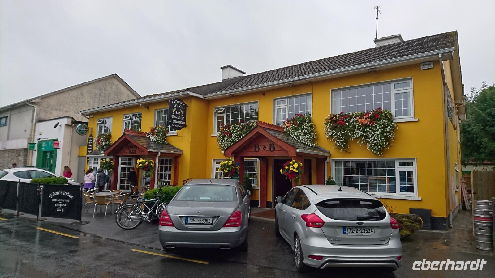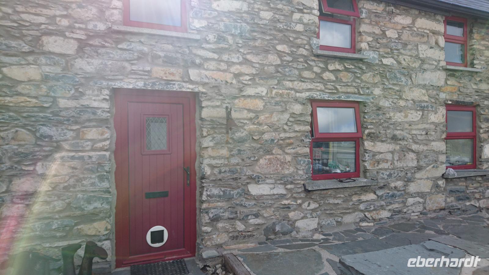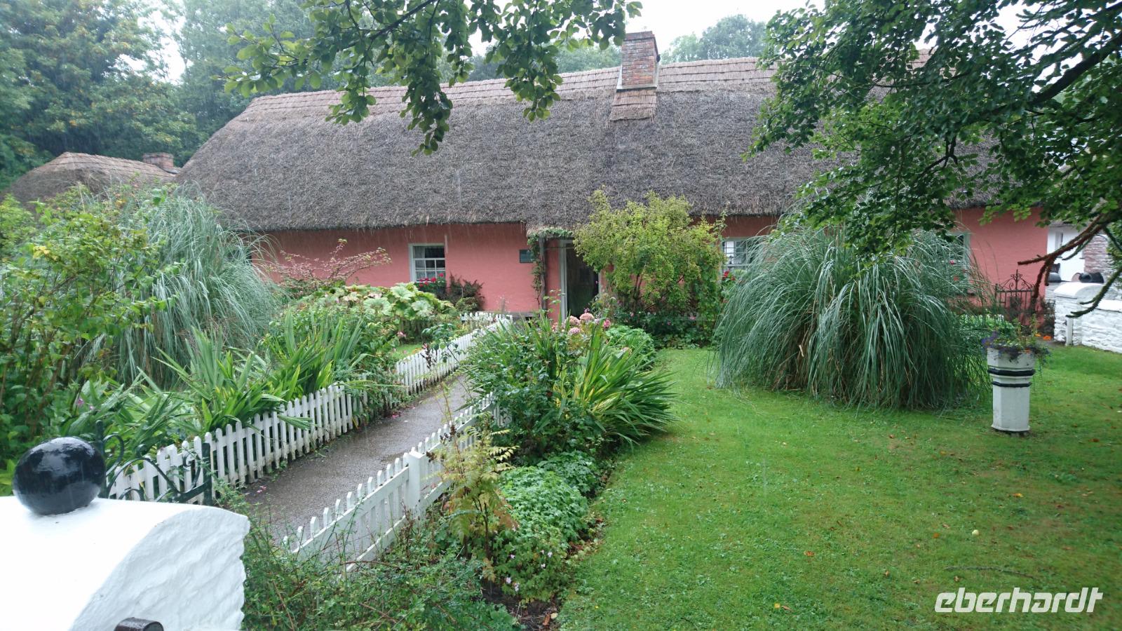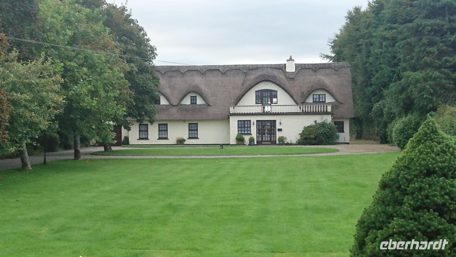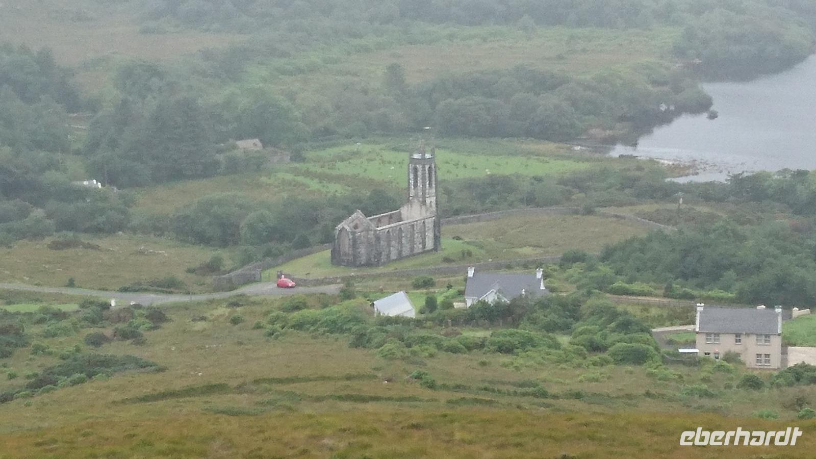 Weiter gen Süden führte uns heute unser Weg, denn unser Ziel war und blieb es ja, die Insel einmal komplett zu umrunden, ehe wir wieder nach Hause fliegen würden. So fuhren wir heute wieder durch herrliche Natur, entlang der schroffen Küste und durch herrliche Täler, wie eben auch jenem einst als fürstliches Jagdrevier hergerichteten Tal von Delphi. So gelangten wir gegen Mittag nach Cong. Dieser Ort hat eine bewegte Geschichte. Einmal gab es eints ein Castle, von dem man heute nichts mehr sieht, zum anderen stehen hier die Reste einer Abbey, die heute noch so beliebt ist, dass wir darin eben eine Hochzeit erleben durften. Dann finden sich am Ortsrand Reste eines Kanalbauversuches mit Schleusensystem, welches jedoch nie wirklich in Betrieb ging, denn das dahinein geleitete Wasser versickerte schon vor der Eröffnung im Karstgestein, wodurch man den Kanal einfach als ‚den trockenen Kanal' bezeichnet. Warum jedoch viele Menschen heute nach Cong kommen, hat einen anderen Grund: Hier drehte einst John Ford den Film ‚Der Sieger' mit Mauren O'Hara und John Wayne in den Hauptrollen. Natürlich gibt es die originalen Filmdrehorte noch, man kann ein zugehöriges Museum besuchen und ebenso eine Statue der beiden Haupthelden bewundern. Für uns ing es anschließend weiter gen Gort, doch ehe wir zum Hotel fuhren, besuchten wir noch den Coole Park der Lady Gregory, der einstigen Muse von W.B.Yeats, und den Unterschriftenbaum im ummauerten Garten und unternahmen danach noch einen Bus-Ausflug nach Kilmadough, einer alten Abtei, die lange Jahrzehnte in sich verfiel und nun wieder als Friedhof genutzt wird. Die alten Ruinen und der Rundturm, alte und neue Gräber auf der grünen Wiese, darum herum Kuh- und Schafherden, das alles gab diesem abendlichen Besuch eine besondere Note, die wir nicht missen wollten. Später fuhren wir ins altehrwürdige Hotel der Lady Gregory in Gort und ließen uns beim Abendessen und an der Bar verwöhnen, ehe wir Kraft für künftige Erlebnisse tankten und den Tag ausklingen ließen.