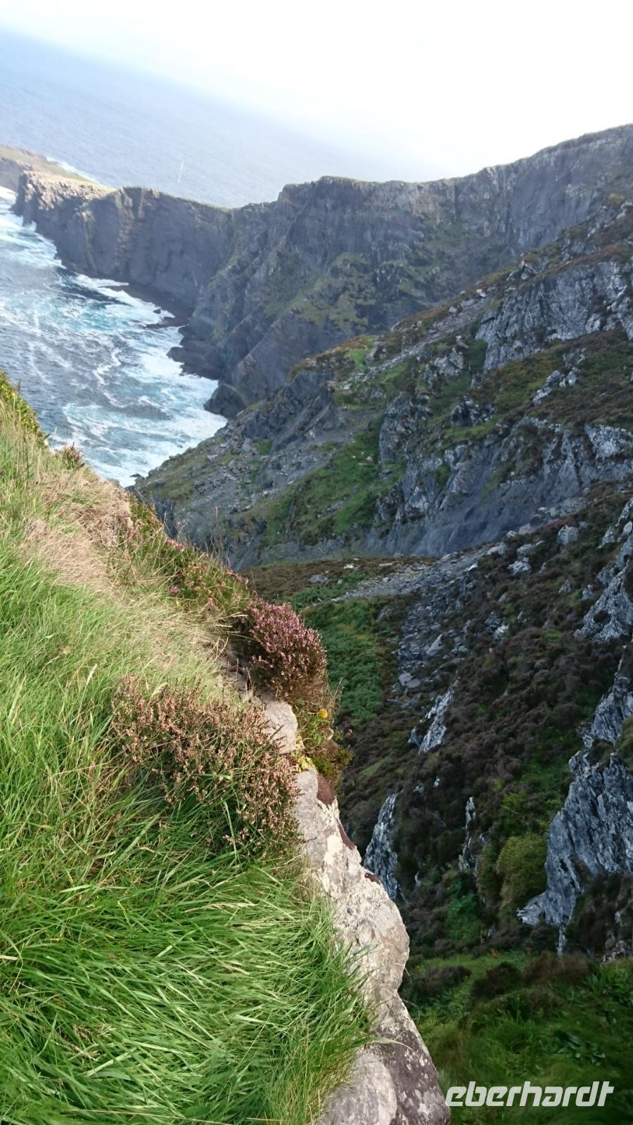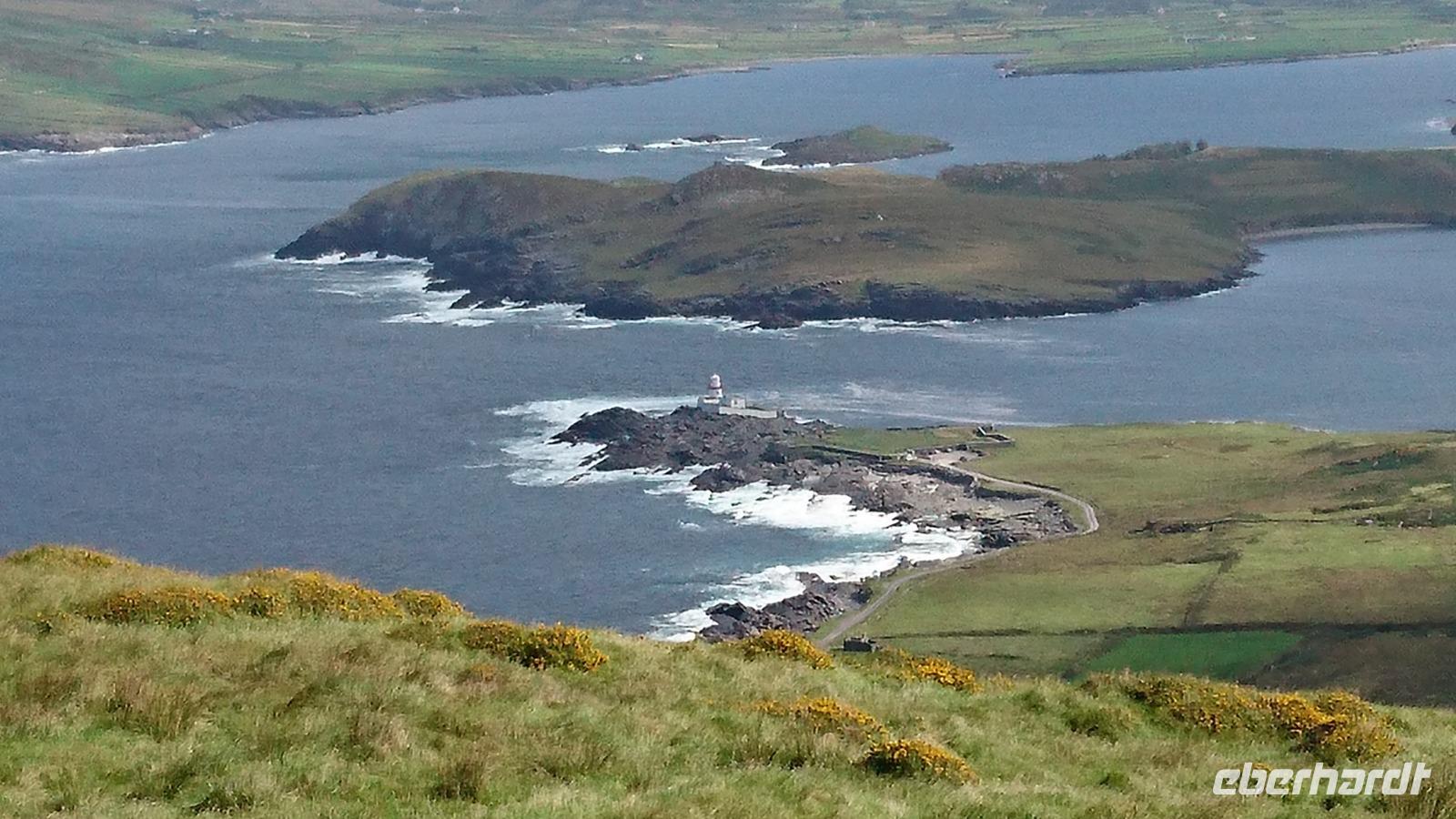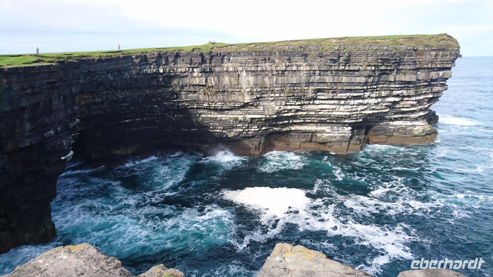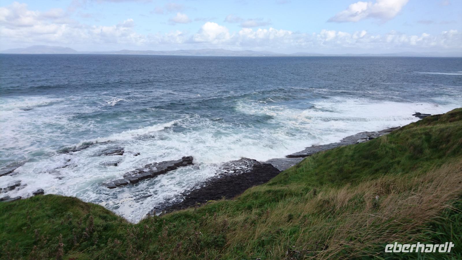 Am Morgen schon Geschichte? Ja! Wir fuhren nach Killala und konnten hier einmal einen komplett erhaltenen Rundturm sehen, hatten dabei eine wunderbare Weitsicht über das Hafenbecken des Ortes und genossen diesen gemütlichen Tagesbeginn. Dann ging es ein Stück auf die Halbinsel hinaus und wieder konnten wir nur staunen. Auf dem Downpatrick's Head entdeckten wir tiefe Felsschluchten und Höhlen, hörten die wunderliche Geschichte des Felsabbruches direkt vor der Küste und bewunderten die Gesteinsschichten an den Bruchkanten. Danach fuhren wir um die Bucht herum und kamen nach Ceide Fields, einer der genialsten Ausgrabungen Irlands und gleichzeitig ältester heute bekannter Siedlungsort hier. Gleich am Eingang des Besucherzentrums sahen wir eine tausende Jahre alte versteinerte Pinie und erlebten schließlich eine interessante Führung über das alte Torffeld, unter dessen oberer Schicht ein Pfarrer vor Jahrzehnten Strukturen entdeckte, die sein Sohn, heute anerkannter Professor für Archäologie, später mit neuen Methoden der zerstörungsfreien Suche freilegte und damit nachweisen konnte, dass es an dieser Küste einmal eine sehr alte Siedlung gab, deren Menschen und Bewohner einst nach 500 Jahren Siedlungsgeschichte scheinbar von einem Tag zum anderen die Gegend verließen. Auch wir verließen nach einem Mittagsimbiss die Gegend, fuhren weiter nach Süden und erreichten die Insel Achill, deren Küsten ebenso legendär sind wie einer ihrer prominentesten ehemaligen Bewohner, Heinrich Böll. Neben den Stränden warfen wir auch einen Blick auf sein Cottage und fuhren später über schmale, gewundene Straßen mitten durch das ursprünglich erhaltene Irland zurück zu unserem Hotel in Ballina, wo uns wieder ein gutes Abendessen und viel Ruhe erwarteten.