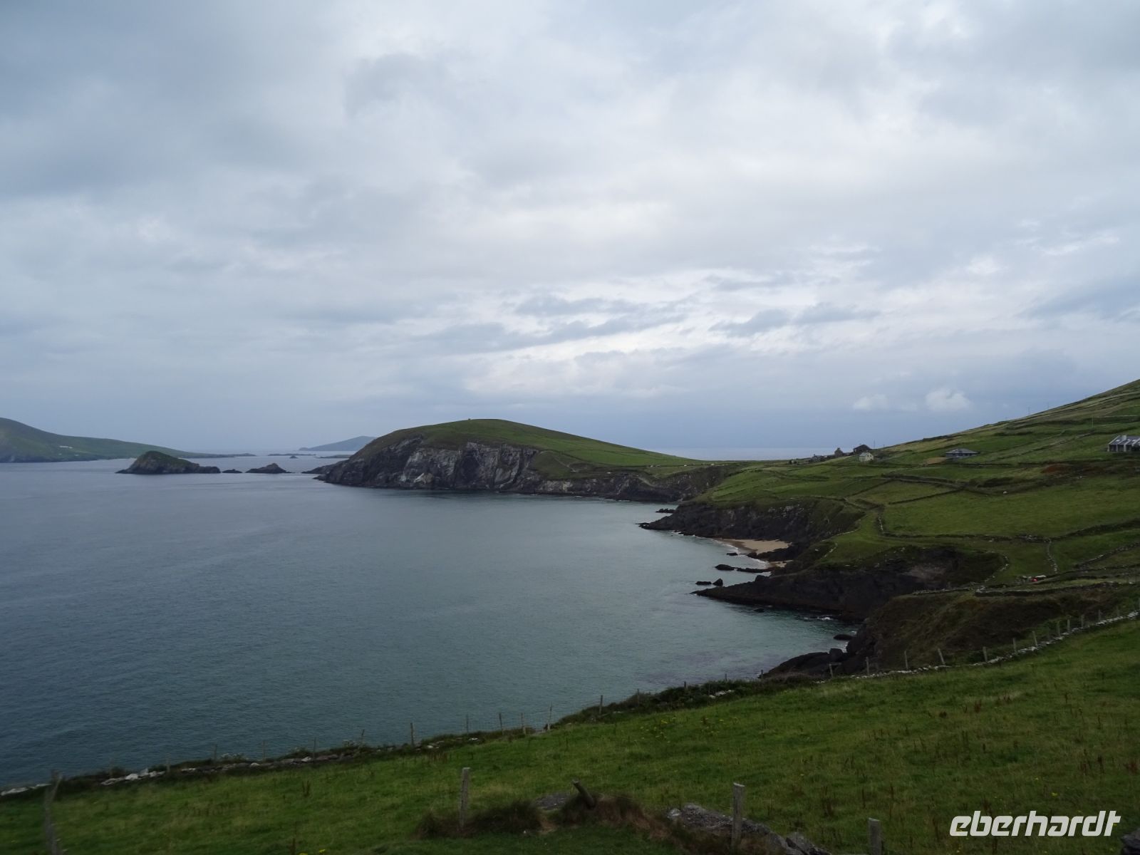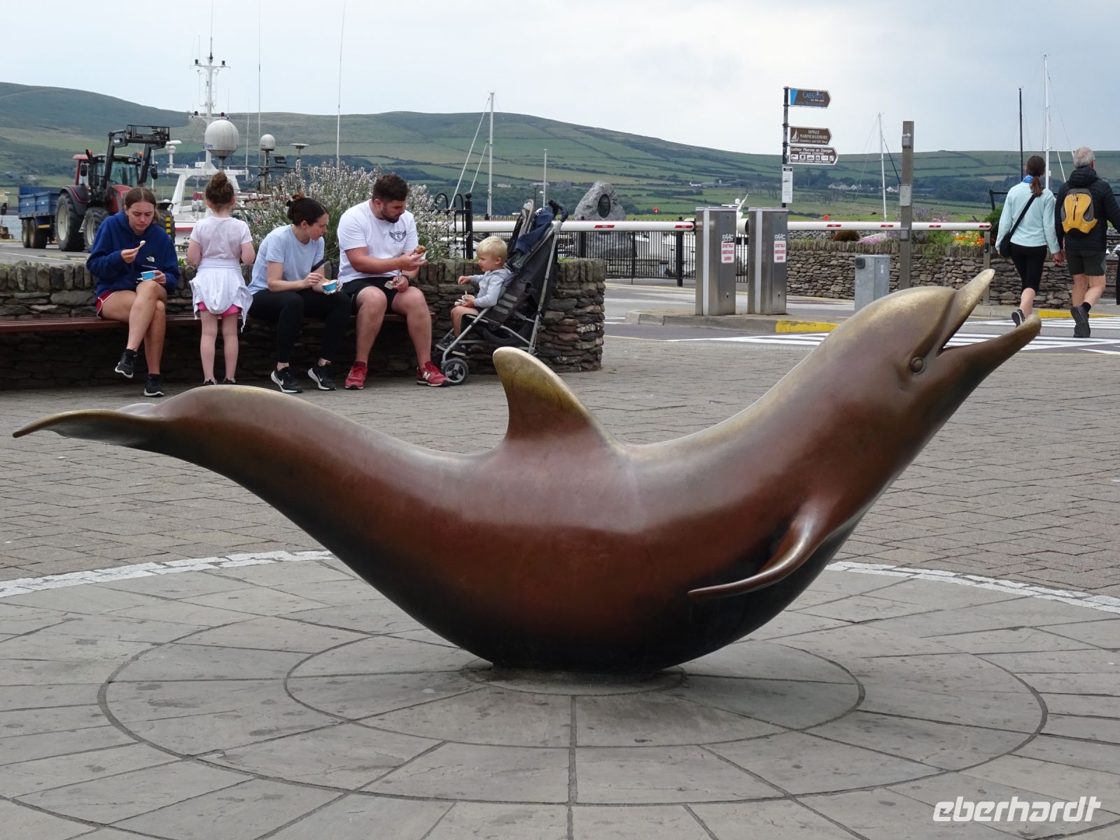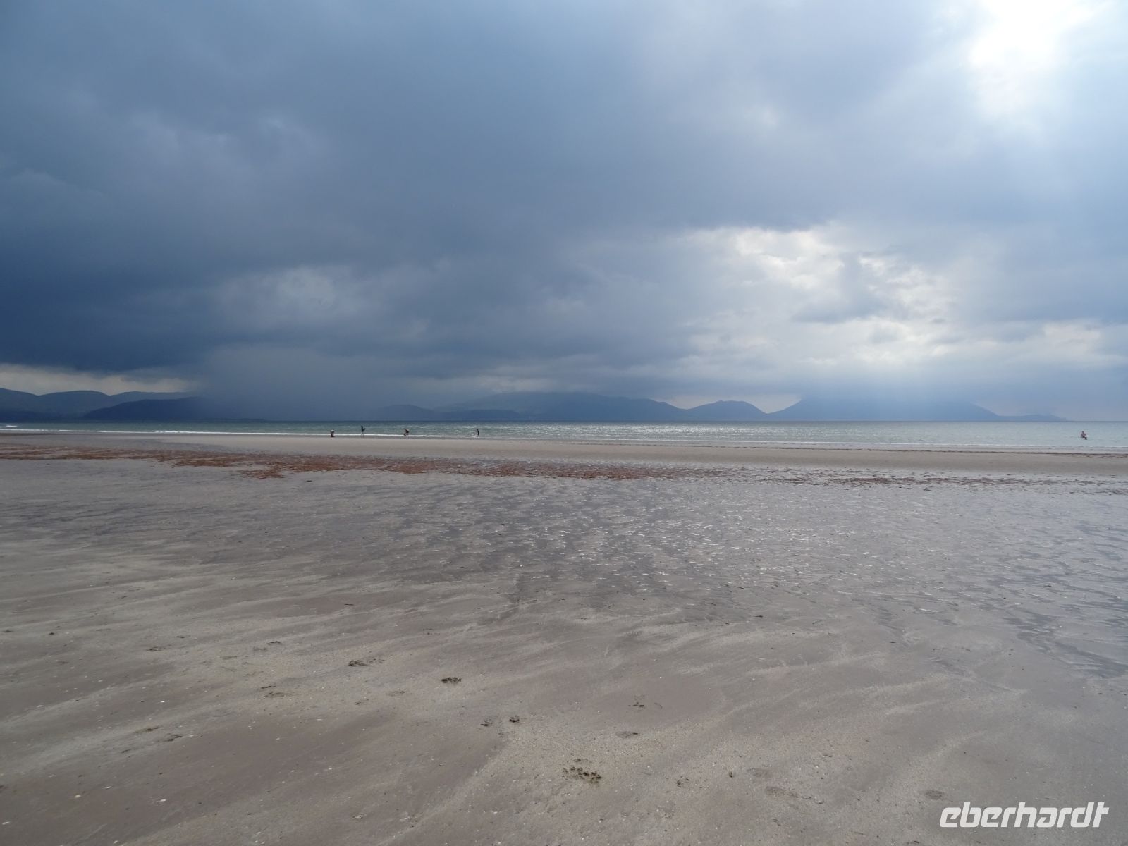 An der Blennerville Windmill vorbei, mit einem fantastischen "Fotoblick" auf die Bucht von Tralee, beginnt unsere heutige Tour. Unterwegs erfreut uns der Anblick einer Reiterin. die ihr Pferd imFluß badet - als wir auf dem Rückweg wieder vorbeikommen, hat die Ebbe jegliches Wasser verschluckt! Vielleicht war es eine Fata Morgana? -Von der Küstenstrasse entdecken wir steile und sehr kahle hohe Berghänge mit ungewöhnlichen Behausungen, erahnen in der nebeligen Ferne die Blasketinseln und entdecken das seltsame Gallarus Oratory.Im hübschen Städtchen Dingle locken Restaurants,Teestuben, Souvenirläden mit interessant gestalteten Hausfassaden. Den kilometerlangen breiten Strand von Inch haben wir zur Strand- und Badepause erkoren .Als wir gerade so froh die irische Sonne genießen, muß wohl ein Leprechon sein Spielchen mit uns getrieben haben: Plötzlich ziehen schwarze Wolken und starker Wind auf und ein starker Platzregen läßt uns schlagartig patschnaß sein! So erleben wir doch endlich auch wenigstens einmal den typisch irischen Regen! Unser Trost: Seelenwärmer im Bus.