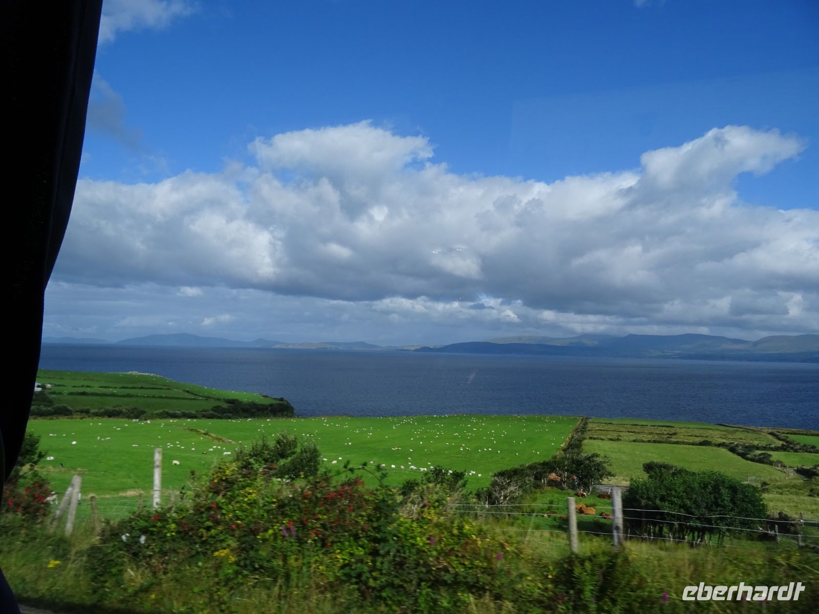 Bei einer Irlandreise darf der Ring of Kerry nicht fehlen. Zu Beginn unserer Rundfahrt schauen wir auf die andere Seite der Dingle- Bucht. Der Schäfer Brendon zeigt uns verschiedene Schafrassen und demonstriert die Arbeit der Hunde. Uns beeindruckt, wie eifrig und begierig diese auf ihre Aufgaben sind. Beim Probieren eines Irish Coffee - hm lecker! -singt uns die Wirtin das Lied von Molly Malone. Auch ein Steinfort besuchen wir und können darauf auch herumklettern. Beeindruckend, was unsere Vorfahren geschaffen haben! In Waterford legen wir eine Mittagspause ein und fotografieren uns mit der Plastik Charlie Chaplins, der hier oft seine Ferien verbrachte. Unterwegs legen wir viele Fotostopps , z. B. am " Lady`s View","Moll`s Gap"und vielerlei Blicken in die Landschaft des County Kerry ein. Unterwegs beantwortet unsere örtliche Reiseleiterin Eileen unsere Fragen zu aktuellen Lebensumständen der Iren aus ihrer unmittelbaren Erfahrung heraus.