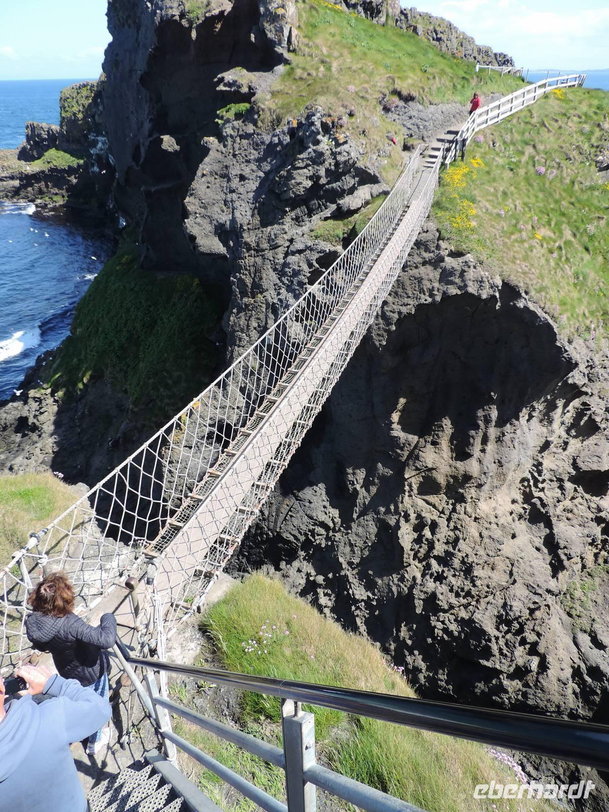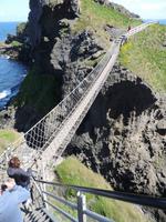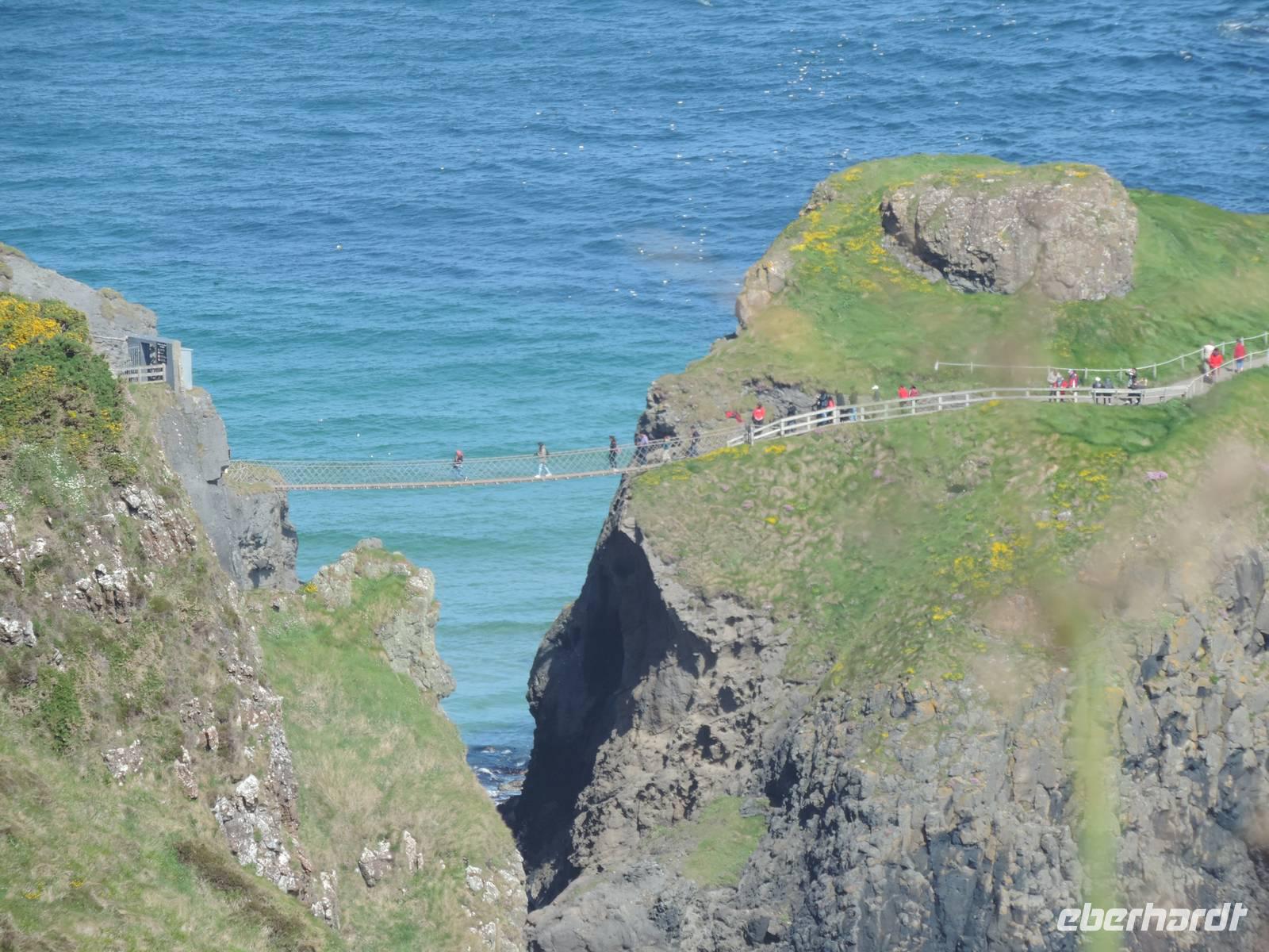 Einige Gäste möchten die Seilbrücke gerne überqueren. So schieben wir den Programmpunkt ein. Leider liegt der Parkplatz etwa 1 km von der Brücke entfernt. So sind wir etwas unter Zeitdruck, da wir eine Reservierung für den Giant's Causeway haben. Hinzu kommt, dass die Brücke einspurig wechselweise frei gegeben wird. Da muss man immer einige Min warten, bis man den Rückweg starten kann. Nicht alle mögen sich diese Hetze antun - doch die, die es tun, kommen mit einem breiten Grinsen zurück. Die anderen finden Gefallen an dem Souvenirladen und dem Blick auf die Steilküste.