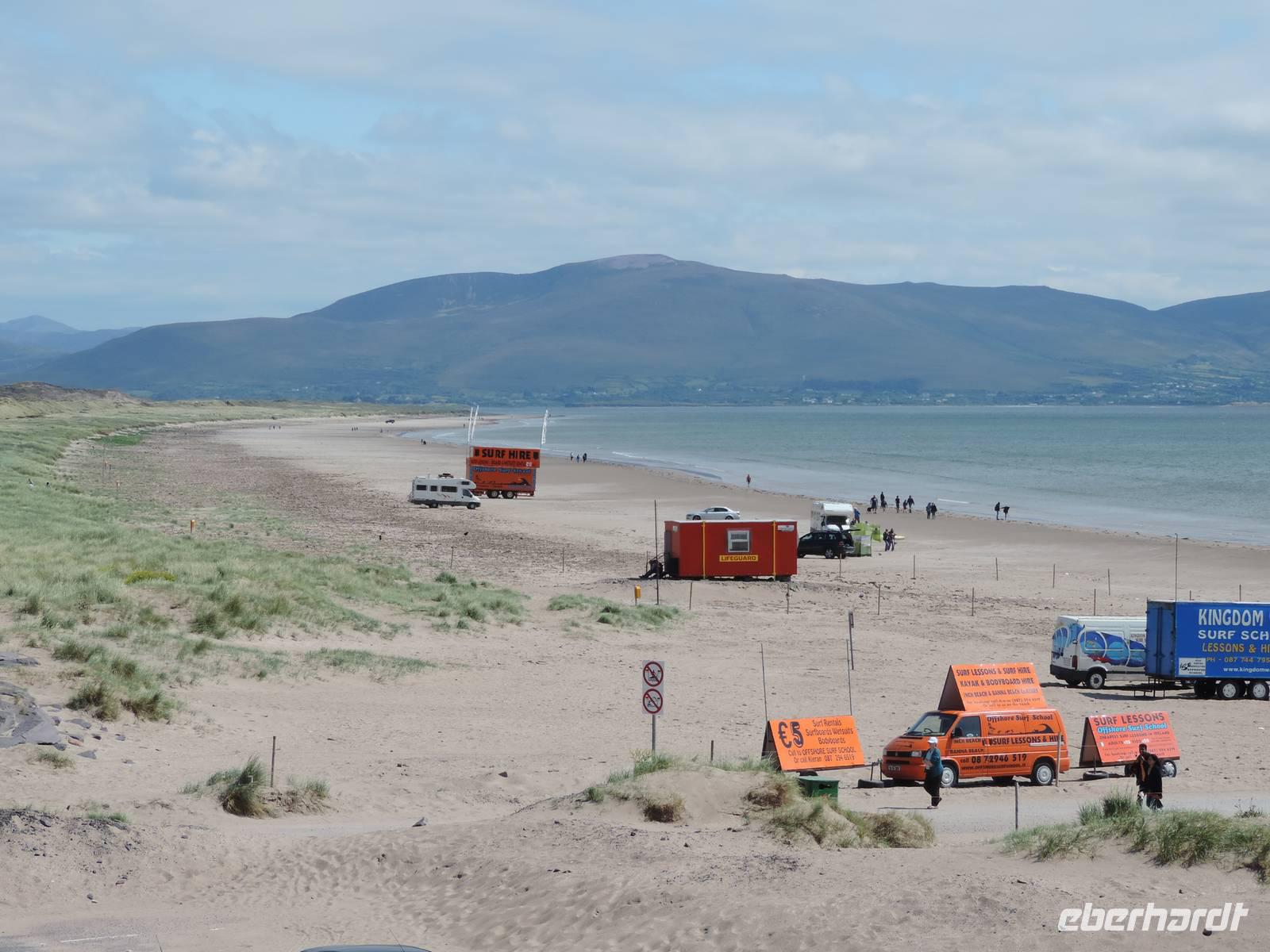 Je weiter wir auf die Halbinsel fahren, desto windiger wird es und desto blauer wird der Himmel. Kurz nach 12 Uhr sind wir wieder in Dingle. Dies ist ein hübscher Ort, der auch mal Geschmackvolles/Kunstvolles neben all dem Souvenirkitsch anbietet. Bis 14.30 Uhr haben wir dort Freizeit. Dann fahren wir zum Strand von Inch, wo wir eine Stunde bis 16 Uhr Aufenthalt haben. Es ist sonnig, etwas windig, frisch.