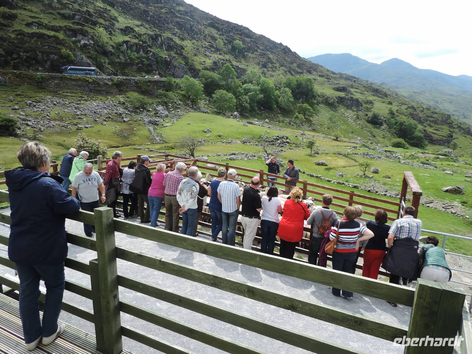 Den Ring of Kerry besuchen wir heute mit dem lokalen Guide Jan. Es gibt mehrere Fotostopps. Er organisiert eine Mittagspause und eine Kaffeepause in Sneem. Auf der Kissane Sheep Farm demonstriert man uns die Arbeit der Hunde und zeigt das Scheren der Schafe.