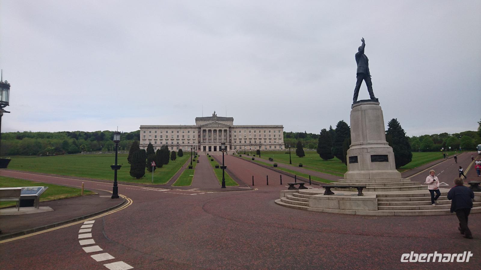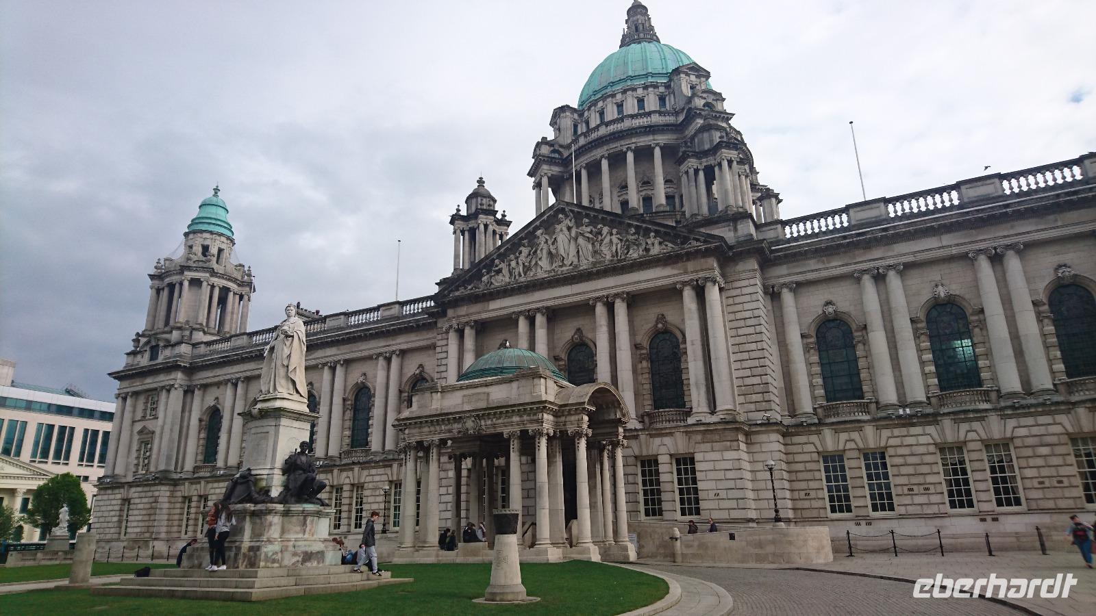 Ein Spar-Markt ist doch ein riesiges Ding, dachten wir, als wir den Treffpunkt auf dem Dubliner Flughafen hörten. Stefan, unser Reiseleiter, rief uns am Tag vor der Abreise an und wir vereinbarten, uns spätestens dort zu treffen. Mit ein klein wenig Verspätung landete eine der drei erwarteten Maschinen und so kamen wir pünktlich vor dem Mittag am Spar zusammen. Dieser Markt entpuppte sich jedoch nur als kleiner Stand und wir lächelten ein wenig darüber. Dann begrüßte uns Stefan und stellte uns unsere Busfahrerin Diane vor, mit der wir die ersten vier tage unterwegs sein wollten. Schon ging es ab zum Bus und bald saßen wir drinnen, hörten irische Musik, sahen die irische Flagge, erfuhren das Programm der nächsten tage und einige wichtige organisatorische Dinge und fuhren schon aus Dublin heraus gen Norden. Unser erstes Ziel heute lag gar nicht in der Republik Irland, sondern im zum vereinigten Königreich gehörenden Nordirland. Belfast. Stefan berichtete uns von der Schönheit, aber auch der Zerrissenheit dieser Stadt und Petra, unsere örtliche Reiseleiterin für Belfast, zeigte uns später, nachdem wir schon einen Eindruck vom Grün der Insel auf der Fahrt hierher bekamen, ihre Stadt mit allen Ecken und Kanten. Von der City Hall ging es vorbei an Gründerzeitvillen in die Arbeiterbezirke und hin zu den Mauern, die einst für etwas Entspannung im konfliktbelasteten Nordirland sorgten. Wir sahen angemalte Mauern und fühlten uns etwas zurückversetzt nach Berlin vor 1989. Die alte Seite der Stadt erkannten wir am alten, Prinz Albert geweihten Uhrturm , dem Zollhaus und dem ältesten Pub der Stadt, die moderne Seite anhand des blauen Belfaster Fisches, des ‚Ding mit dem Ring' und vielen modernen Gebäuden. Als Verbindung zwischen all dem kann gut und gern das Titanic-Viertel gelten, in dem zum Einen die alten Konstruktionsbüros des 1912 gesunkenen, jedoch in Belfast ordentlich gebauten Luxusschiffes zu sehen sind und das zum Anderen vom hoch modernen Gebäude der Titanic-Exhibition Titanic Belfast überragt wird.. Mit vielen neuen Eindrücken stiegen wir an der City Hall nach der Stadtrundfahrt aus und schauten uns noch ein wenig auf eigene Faust in der Innenstadt um, ehe wir wieder im Bus saßen und zu unserem Hotel vor den Toren der Stadt, in Carrickfergus, aufbrachen, wo wir bald unsere schönen Zimmer bezogen, das Abendessen genossen und uns anschließend vom Anreisetag erholten. Was würden wir in den kommenden Tagen wohl noch alles sehen?