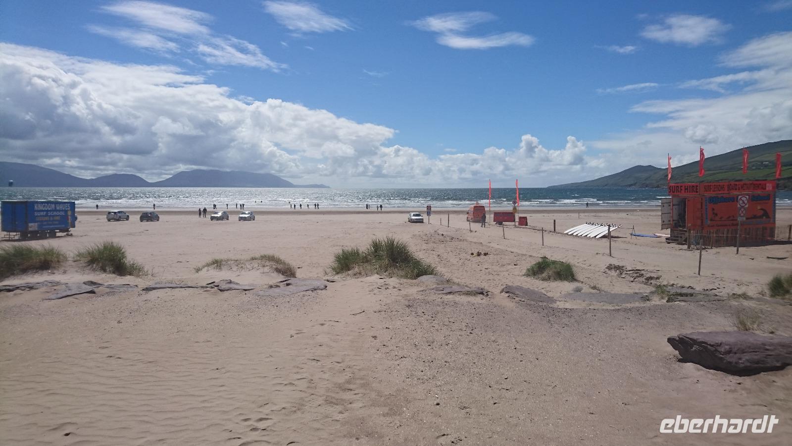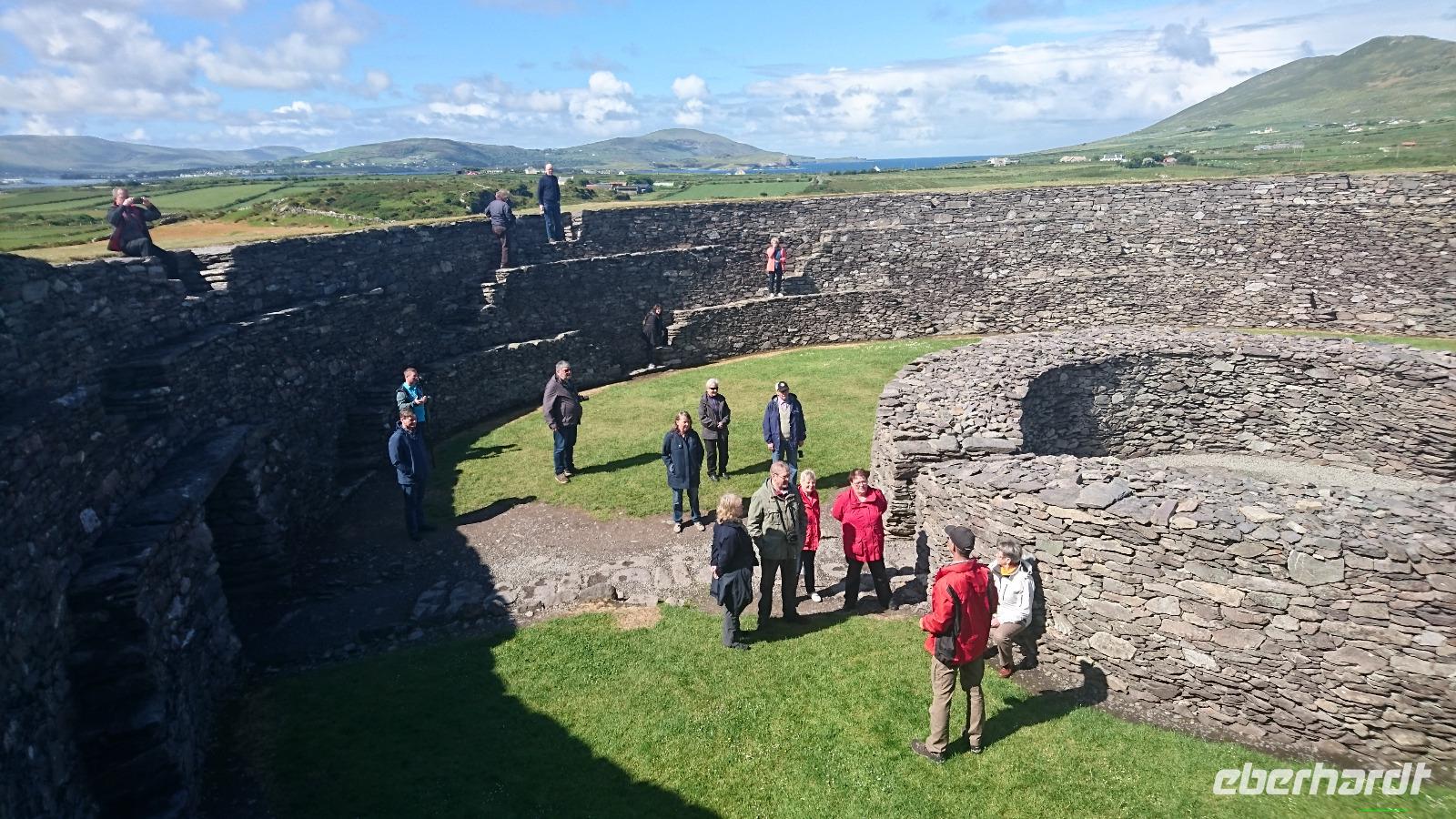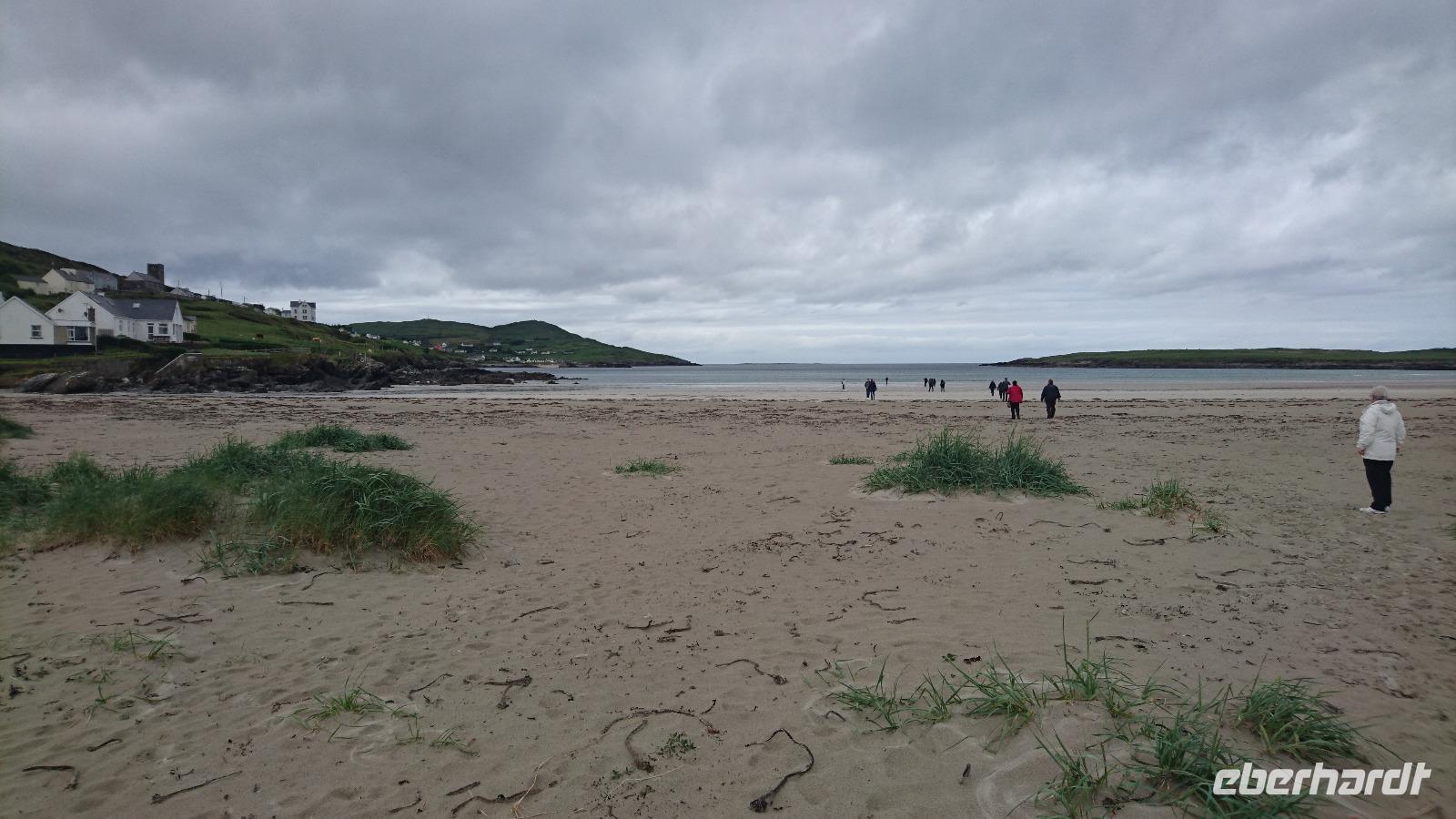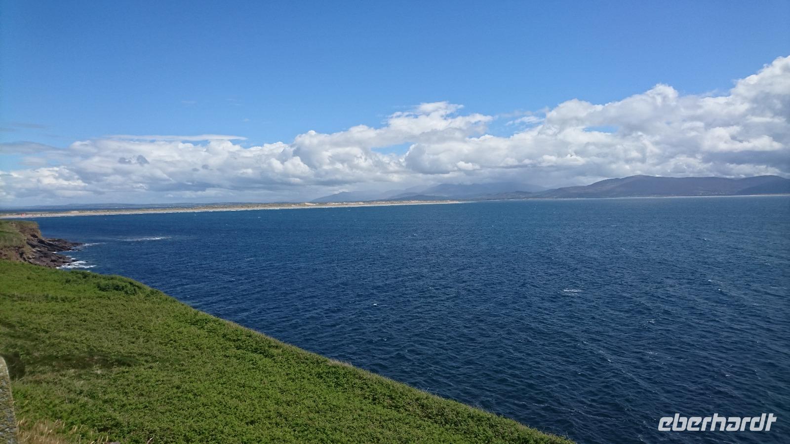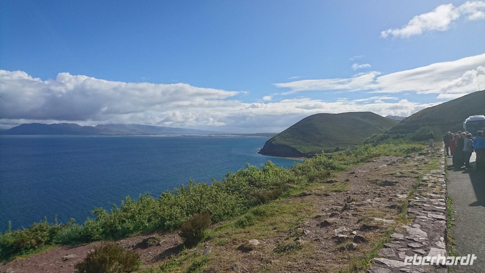 Halbinsel an Halbinsel reihen sich an der unteren Westküste Irlands aneinander. Heute besuchten wir jene, die gleich auf der Höhe von Tralee liegt. Dingle. Die Natur schuf schon schöne Plätzchen auf der erde und man wundert sich, wie ruhig das Leben sein kann, wenn man ihr nur genügend Zeit und Raum lässt. So fuhren wir am Morgen in den Ort Dingle, verschafften uns schon einmal eine kurze Übersicht, ehe wir entlang der Küste weiter um die Halbinsel fuhren. Auf halber Strecke machten wir Station und schauten genau da hinüber nach dem Ring of Kerry, wo wir am Vortag hierher schauten, und... sahen, dass es das Wetter gut mit uns meinte. Während über dem Ring gegenüber dichte Regenwolken hingen, hatten wir fast blauen Himmel über uns. Na, so macht das Reisen und Erkunden noch mehr Spaß! Am Slea Head, einer Landspitze an der Westseite, erfuhren wir mehr über das keltische Baumhoroskop, konnten, wenn wir es wollten, sogar unser Baumsymbol auf einem Stein mit nach Hause nehmen. Weiter ging es über die Berge hinüber zur Nordseite der Halbinsel und an einen Filmset der besonderen Art. Während sich in den 50-er Jahren der Hollywood-Drehstab zu Ryans Daughter in Dingle Town einquartierte, baute man für diesen Film an der Inselnordseite eine Stadt, die man nach dem Dreh den Iren schenken wollte. Irland lehnte ab, so wurde alles zurück gebaut und erst später entstanden da spärlich einige Gehöfte. So war die Landschaft noch ursprünglich, als ein weiterer Filmstab unterwegs war und hier für die richtigen Motive fündig wurde. Die neuen Star Wars Filme entstanden zum Teil auch hier auf Dingle und so pilgern heute einige Fans dieses Genres gern hierher. Wir verweilten etwas, fotografierten und machten uns dann auf, unsere Freizeit in Dingle Town zu verbringen, wo man schön bummeln, essen, shoppen oder auch hinaus zu Fungi, dem Delfin der Bucht, fahren kann. Später nutzten wir den Heimweg noch für einen Zwischenstopp in Inch, einem Sandfinger, der als Strand in die Bucht hineinragt und damit ein Surfer- und Badeparadies der besonderen Art ist. Wir genossen die Sonne des Nachmittags, ehe es später zurück nach Tralee ging. Stefan besorgte für alle, die ins Theater gehen und dort irische Lebensfreude erleben wollten, die Karten für den Abend im Theater gegenüber des Hotels und wir gingen bald zum Abendessen und später zur Show, die uns sehr gefiel. Dann war auch dieser schöne tag schon wieder zu Ende.