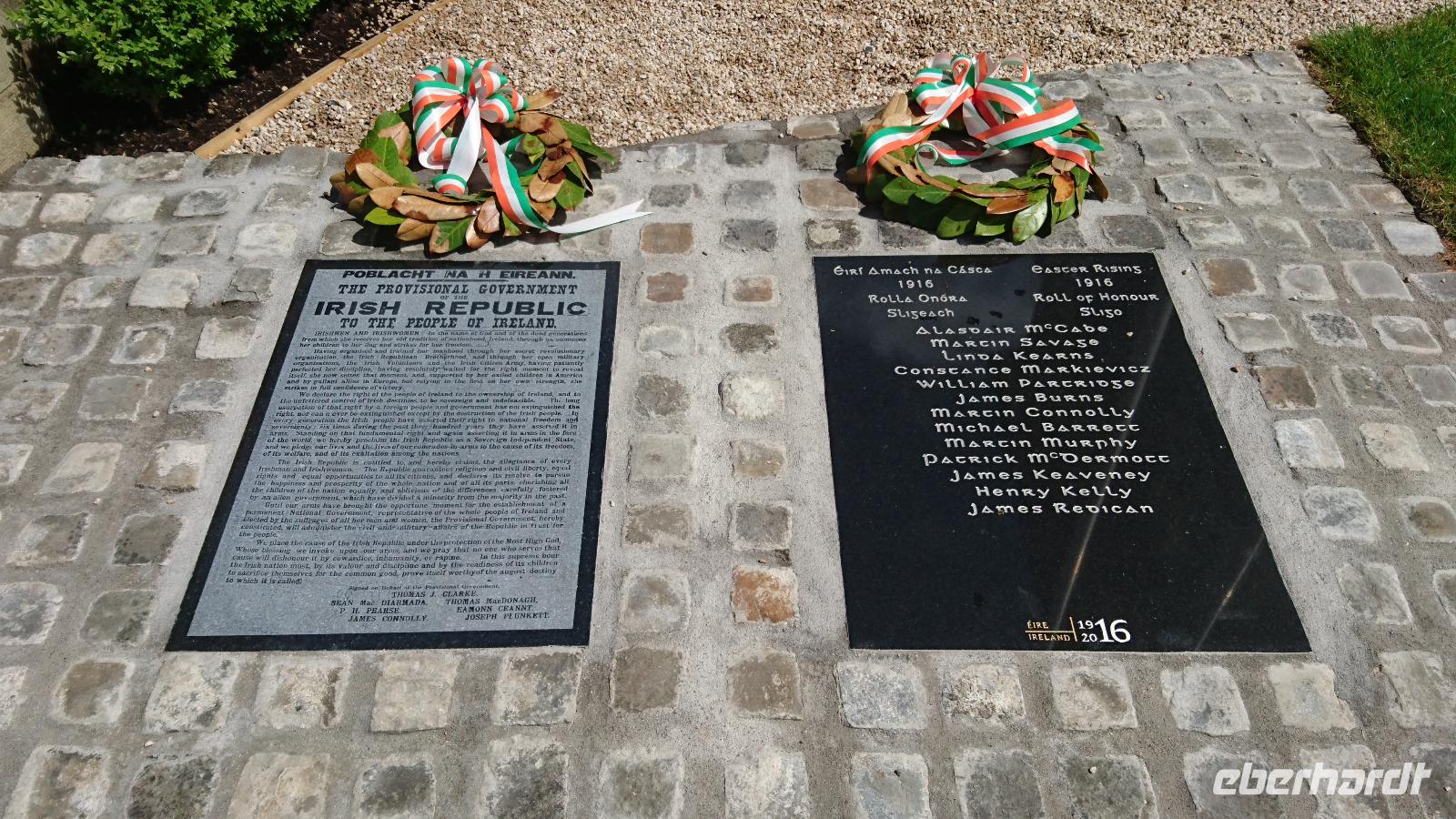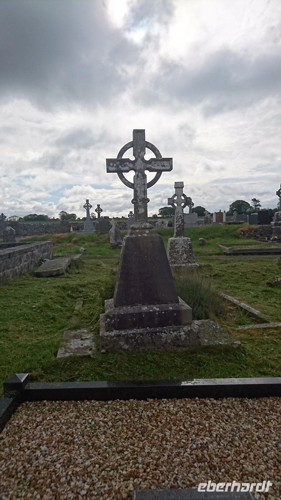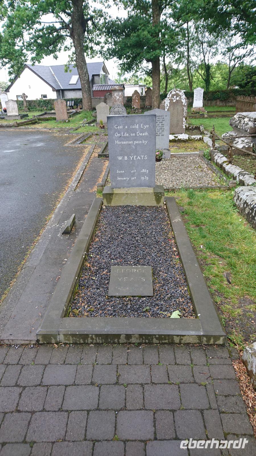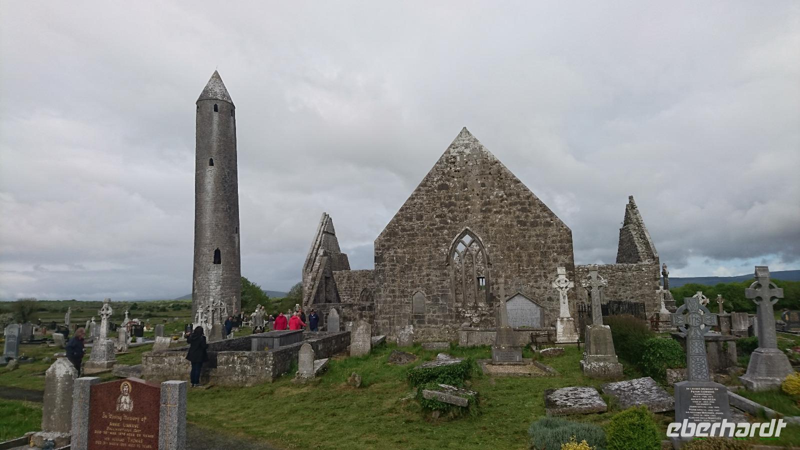 Alt und Neu, weit zurückliegende Geschichte, aktuelle Machtpolitik und immer noch der Glaube, all das bestimmt Irland, bestimmt die Bevölkerung und deren Regierung. All das sollte wir heute sehen und erleben. Zuerst ging es nach Mullaghmore, in dessen Castle bis 1979 der einzige Baron von Mullaghmore, Lord Montbatten lebte, ehe die IRA ihn, mangels greifbarer Ziele in Nordirland, unschön aus dem Leben beförderte. Doch nicht wegen dieser Tat waren wir hier, sondern wegen der herrlichen Steilküste, dem darauf thronenden alten Schloss und der Kontraste, wie wir hier erleben konnten. Später fuhren wir zu jenem Turm, der einst einstürzen soll, wenn der klügste Mensch der Welt daran vorbei geht. Er blieb stehe. Na ja, wir gingen auch nicht daran vorbei, sondern fuhren mit dem Bus. Trotzdem hielten wir an und besuchten den alten Friedhof von Drumcliff mit einem alten keltischen Hochkreuz und vor allem dem Grab des irischen Nationaldichters W.B. Yeats. Nach einem kurzen Aufenthalt dort ging es schon wieder zu Gräbern. Diesmal fanden wir sie in Carrowmore und sie sind heute ca. 7.000 Jahre alt, sollen gar in ihrer Ausrichtung einen Bezug zu Stonehenge und jenen Kulturen, die es errichteten, haben. Ob das wohl stimmt? Auf jeden Fall lauschten wir Stefans Erklärungen zu jener alten Kultur, ehe wir weiter fuhren. In Sligo, unweit von Carrowmore, hielten wir zum Bummeln und zur Mittagspause, genossen etwas Ruhe am Wasser und schon ging es weiter. Der nächste Halt war in Knock, dem Nationalheiligtum, der Pilgerstätte der Iren. Im späten 19. Jahrhundert soll es dort eine inzwischen von der katholischen Kirche anerkannte Marienerscheinung gegeben haben und so entstand in den Siebtigern des letzten Jahrhunderts eine riesige, zu bestimmten Tagen um die 10.000 Menschen fassende Wallfahrtskirche neben der Erscheinungskirche und seither läuft auch das durch die Weihung eines nahen Sees nun heilige Wasser aus Wasserhähnen zu den Pilgern, die es gern mit nach Hause nehmen möchten. Das war für uns ungewöhnlich, jedoch erkennt man als Fremder eh' nie alle Bestandteile der für einen fremden Kultur und so war dies für uns ebenso ein interessanter Stopp. Noch ehe wir unser Hotel in Gort erreichten, ließ Stefan Diane zum Coole Park abbiegen. Dieser gehörte einst Lady Gregory, jener Kunst- und Kulturliebhaberin und glühenden Republikanerin, nach der auch unser heutiges Hotel benannt wurde. In ihrem Park steht in einem ummauerten Garten der Unterschriftenbaum, eine Blutbuche, in der sich alle Größen der damaligen Zeit, die bei Lady Gregory weilten, mit ihrer in den Stamm geschnittenen Unterschrift verewigten. Dank der zugehörigen Hinweistafel entzifferten wir bald die eine oder andere Unterschrift von W.B. Yeats und seinem Bruder Jack, George Bernard Shaw, John Millington Synge, Seán O'Casey, John Masefield, G. W. Russell, George Moore, Augustus John und anderen. Nun jedoch ging es zum Hotel und wir verarbeiteten die vielen Eindrücke des Tages nach dem Abendessen auf unseren Zimmern. Dabei verabschiedeten wir uns von unserer netten und versierten Busfahrerin Diane, die dringend einen anderen Termin wahrnehmen musste.
