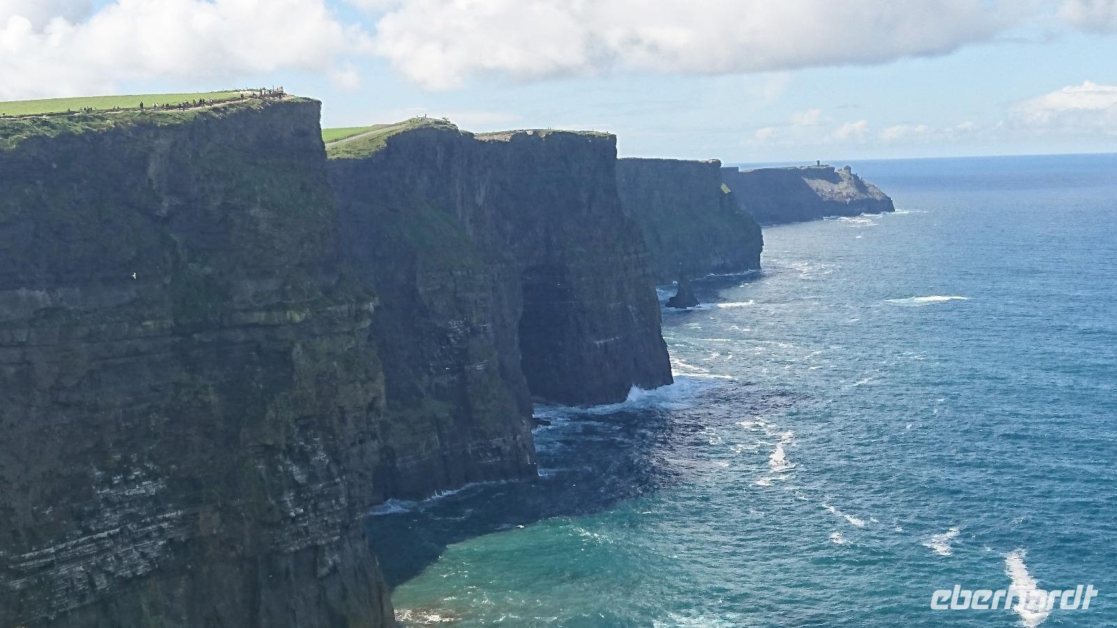 Steine, Steine, nichts als Steine. Das könnte man sagen. Zwischen all den vielen Steinplatten wuchsen jedoch die unterschiedlichsten, zum teil heute eher in Asien oder Afrika angesiedelten Pflanzen. Die letzte Eiszeit brachte vieles davon mit und so konnte der Burren über die Jahrtausende seine besondere Art entwickeln. Die Megalithvölker kannten ihn auch und so besuchten wir heute Vormittag den großen Dolmen von Poulnabrona, der noch größer war, als das Hauptgrab in Carrowmore. Die große Frage ist heute noch für viele Wissenschaftler, wie damalige Völker solch große Steinplatten so weit und vor allem so hoch bewegen konnten. Einige kennen Erklärungen, die mit exoterrestrischen Raumfahrern zu tun haben sollen, aber ganz genau kann all das heute niemand weder in die eine noch in die andere Richtung beweisen. So steht er halt dort in der Landschaft als großes Überbleibsel er Geschichte und großes Fragezeichen der Wissenschaft. Etwas genauer zur Entstehung sind die heutigen Erklärungen zu den Cliffs of Moher, die wir im Anschluss besuchten. Bei gutem Wetter und hervorragender Sicht konnten wir nicht nur die imposanten Klippen unterhalb der Siedlung eines alten Megalith-Häuptlings bewundern, sondern wer gute Augen hatte, erkannte sogar in den Klippen die Papageientaucher-Kolonie. Einfach toll! Später ging es weiter gen Süden nach Bunratty und damit zu einem heute vollständig renovierten und rekonstruierten, wieder zeitgemäß ausgestatteten Castle. Die Führung darin war etwas wunderlich, da unser Schlossführer gerade Deutsch lernte und uns mit seiner Aussprache einige Rätsel aufgab. Aber jeder muss lernen und Stefan konnte uns anschließend noch einiges genauer erklären, ehe wir uns den ums Castle angelegten Folk park anschauten, in dem Häuser aus verschiedenen Westküstengegenden Irlands aus dem 18. und 19. Jahnhundert originalgetreu wieder aufgebaut wurden, in denen wir Gewerke und Wohnstätten betrachten konnten und so noch einmal mehr einen Eindruck von der intakten, wenn auch ärmlichen Lebensweise der Iren in den letzten Jahrhunderten sammelten, ehe wir am Abend nach Tralee zu unserem nächsten Hotel fuhren, wo wir die Zimmer bezogen und unser Abendessen einnahmen, dann noch ein paar Schritte in den Ort oder zum nächsten Pub gingen, ehe wir uns für den kommenden Tag ausruhten.