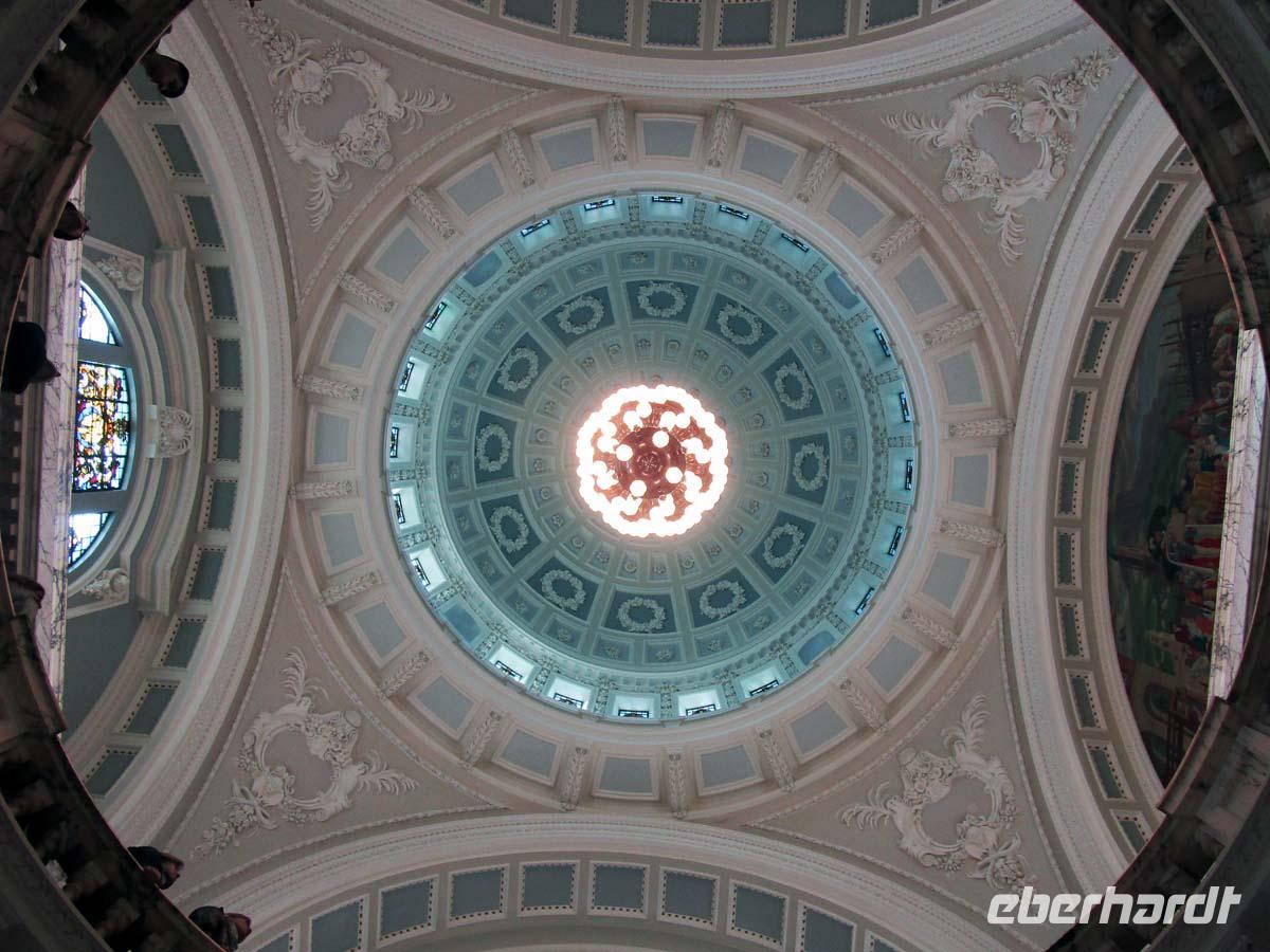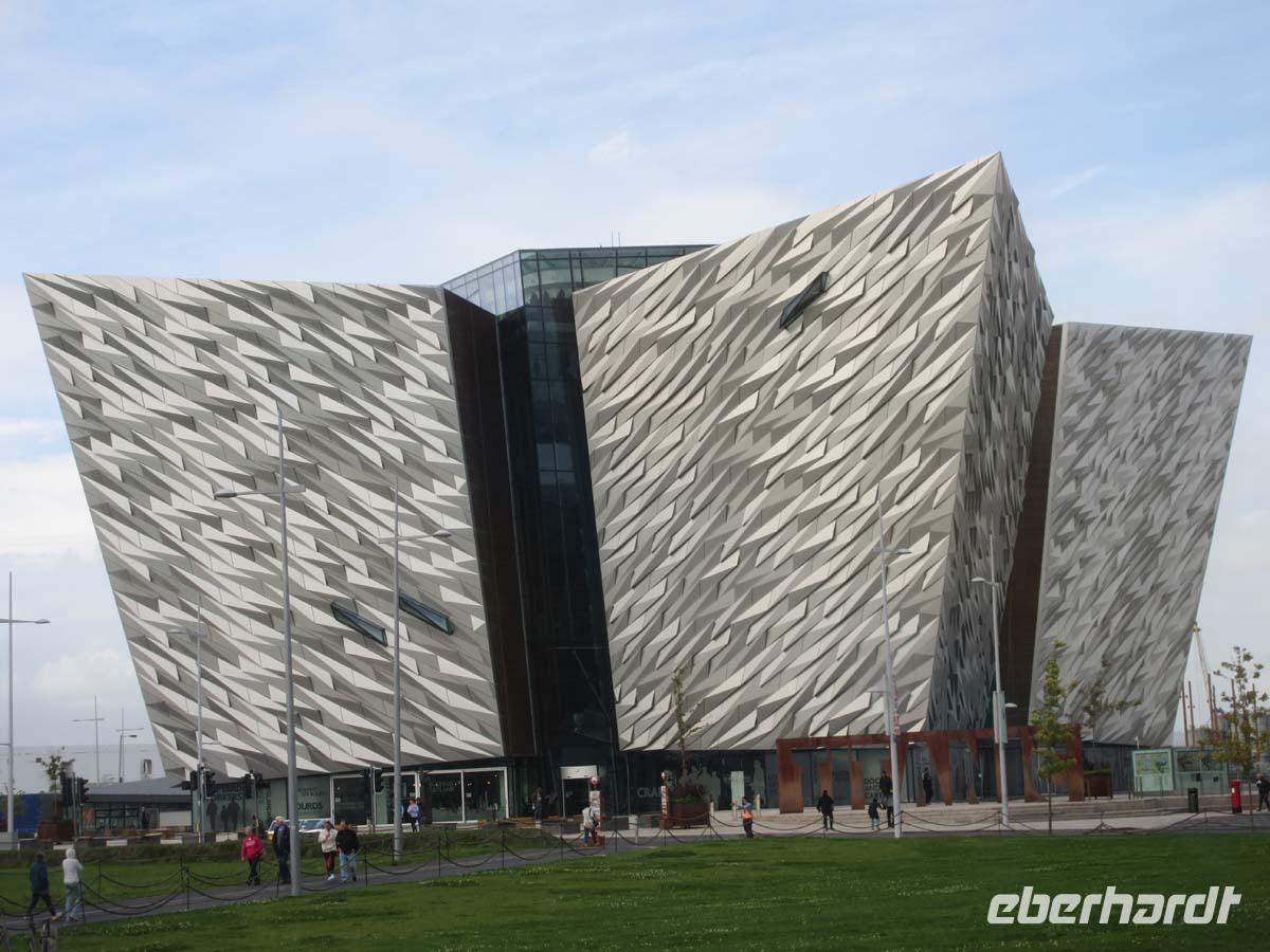 Dann sind wir in Belfast, der Stadt, wo die Troubles, also der Nordirlandkonflikt zwischen 1969 und 1998 am heftigsten wüteten. Die so genannten Peace Lines, also Friedenslinien verdienen ihren Namen nicht, denn sie trennen brutal die katholischen von den protestantischen Vierteln. Nordirland hat Wunden, die noch lange nicht verheilt sind. Unsere örtl. Reiseleitung Bibi holt aber auch die schönen Seiten der Stadt hervor und wir entdecken die viktorianischen Ecken der Stadt. Vor allem beim Bau der City Hall 1905 hat man nicht am Pfund gespart. Überbordender Stuck und feinster Carrara Marmor, sowie teure bemalte Fenster sollen zeigen, wie reich und wirtschaftlich groß Belfast damals war. Belfast hat auch ein historisches Zentrum, durch welches uns Bibi zu Fuß durch z. T. enge Gassen mit vielen historischen Pubs führt. Und wir stoßen immer wieder auf Relikte die zeigen, daß Belfast nicht nur eine Werften-, sondern vor allem auch eine Stadt der Leinenproduktion war, die viel Geld in die Kassen spülte. Am Lagan, der die Stadt durchfließt sehen wir auch den schiefen Turm von Belfast, den Albertturm aus viktorianischer Zeit, dessen Spitze 1,25 m aus dem Lot ragt. Die Queens Universität (Gründung durch Queen Victoria) ist nicht nur in der Architektur im Neo- Tudorstil bedeutsam, sondern auch auf wissenschaftlicher Ebene. Es ist eine richtige Eliteuni und für ein Semester Medizinstudium zahlt man schon mal 36000 Pfund. Da ist aber Wohnung und Essen noch nicht dabei. Den Abschluß macht auf unserer Stadtrundfahrt das Titanicmuseum. Das Schiff lief hier 1912 vom Stapel. Die mit glänzenden Aluplatten verkleidete Fassade des vierzackigen Sternenbaus läuft in ihren Zacken in genau denselben Proportionen aus (Höhe und Neigungswinkel) wie das Schiff.