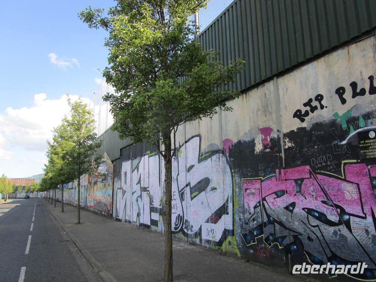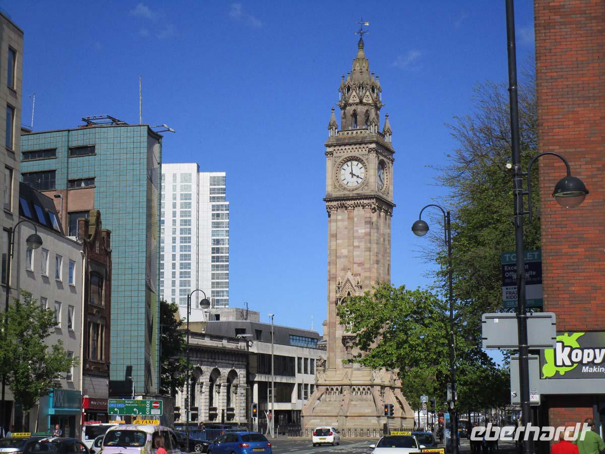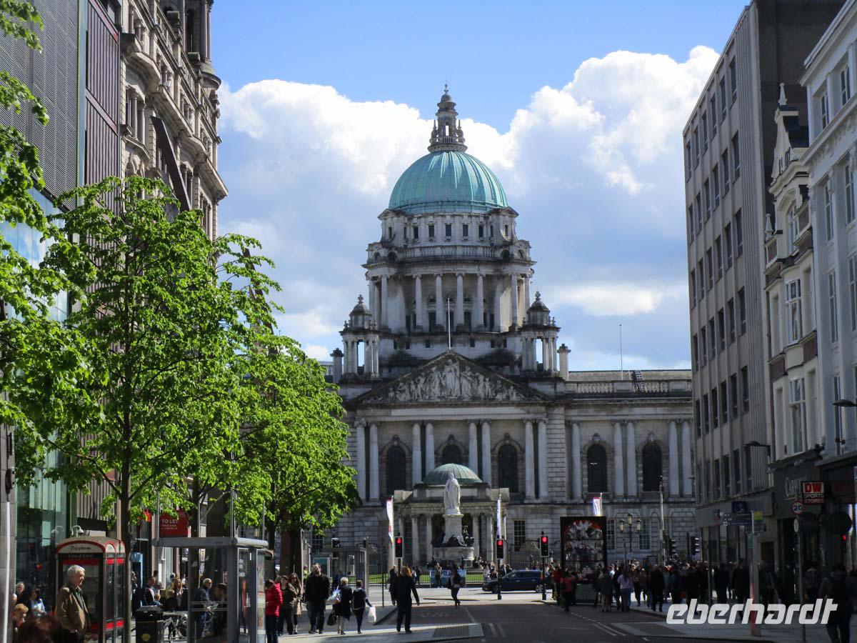 Auf der direkten Reise in die Nordirische Kapitale merken wir kaum, wie wir von der Republik Irland nach Nordirland, also ins vereinigte Königreich überwechseln. Eine Grenze ist nicht zu bemerken. Nur sind plötzlich die Entfernungen in Meilen anstatt Kilometern ausgeschildert.