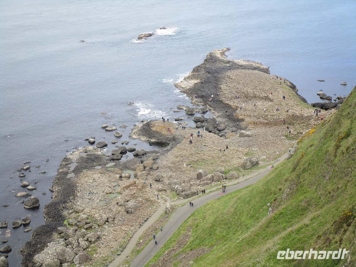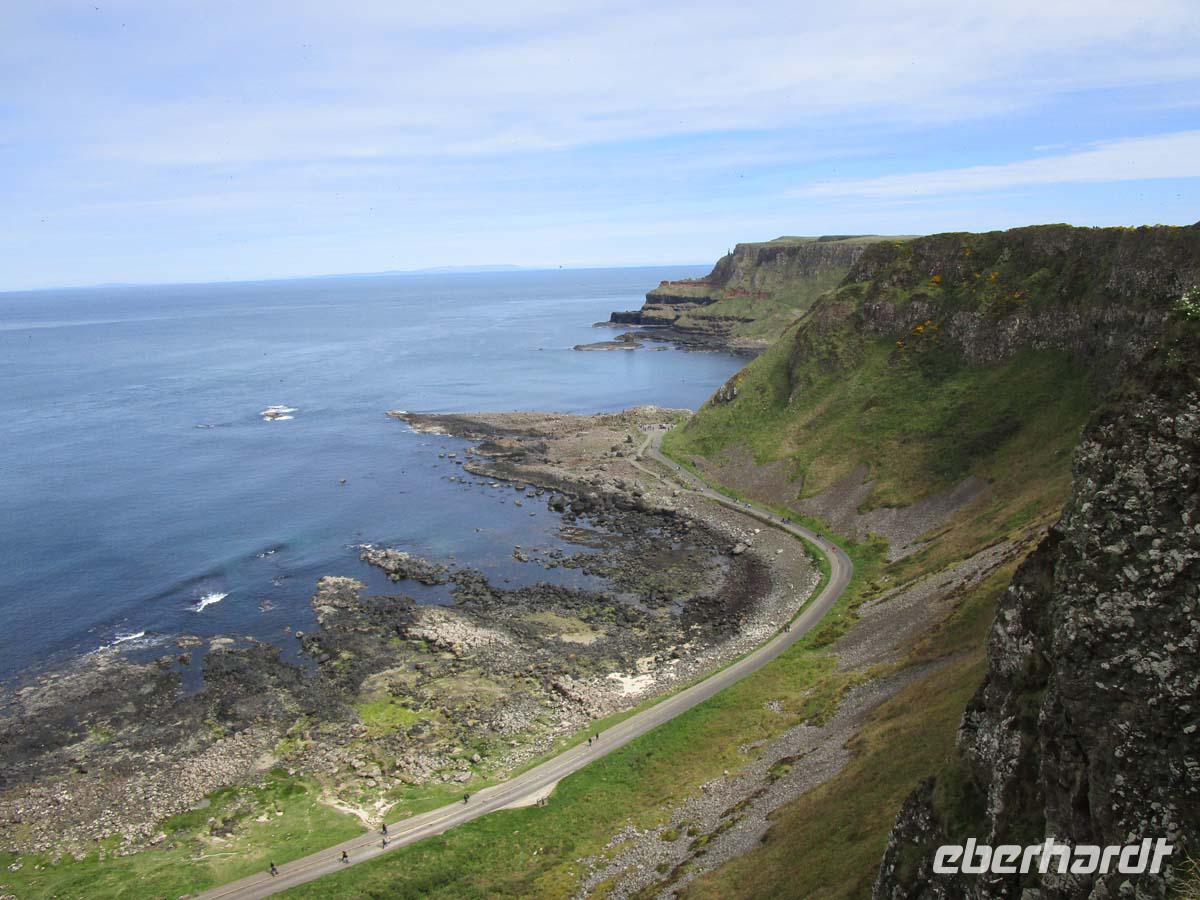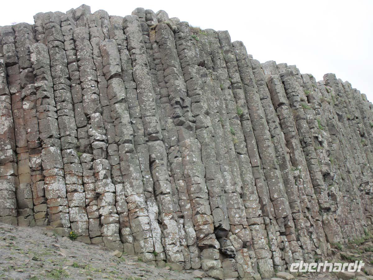 Wir begeben uns heute auf unsere Tour an der Nordirischen Küste entlang. Zunächst ein kurzer Stop am mächtigen normannischen Castel von Carrikfergus, wo Wilhelm III. von Oranien (Protestant) landete, um den letzten Stuart Jakob II. (Katholik) zu besiegen, was am River Boyle 1690 auch gelang. Einen kurzen Stop legen wir in Carnlough ein, wo ein kleiner Laden salziges Seaweed zum roh essen anbietet. Auch die legendäre Fudge, cremiges Karamel in Bonbonform wird verkostet. Was am Ortseingang wie ein Stadtttor aussieht, ist in Wirklichkeit eine Brücke für die Loren, welche auf Schienen die Kalksteine aus den Steinbrücken bis in den Hafen auf die Schiffe rollten. Von einem weiteren Aussichtspunkt blicken wir bis nach Schottlands Mull of Kintyre hinüber und sehen unter uns die Carrick-a-Rede rope bridge, die einen kleinen Felsen mit dem Festland verbindet. Doch das Highlight ist der Giants Causeway, ein aus 6-8 eckigen Basaltlavasteinen geformtes Naturwunder. Ein Riese soll diesen Fußweg bis nach Schottland gebaut haben, um sich mit einem anderen zu duellieren. In der Tat ist diese Formation auch in Schottland in kleinerer Form noch zu sehen. Geologen sagen jedoch, dass es sich um Reste der Kaldera eines riesigen Vulkanes handelt, dessen letzte Eruption vor 60 Millionen Jahren diese Basaltsäulen aus sehr langsam erkalteter Lava hinterließ. Nach einem Fotostop am Dunluce Castel, einem der größten mittelalterlichen Burganlagen Gesamtirlands spazieren wir in Derry zunächst über die komplett erhaltene Stadtmauer und an der anglikanischen Kathedrale vorbei. Nach einem Blick auf die Bogside, dem Viertel wo 1972 der berüchtigte bloody Sunday stattfand gehen wir über den zentralen Platz der Stadt wo sich das älteste moderne Kaufhaus der Welt, nämlich Austins aus dem Jahr 1830 befand. Den Abschluß bildet ein Besuch der altehrwürdigen Guild Hall mit ihren beeindruckenden Glasfenstern und der imposanten Haupthalle. Weil noch ein wenig Zeit ist, legen wir eine Besichtigung eines der typischen, bis in die Eisenzeit zurückreichenden steinernen Ringforts ein. Grianan Ailligh liegt hoch auf einem Berg mit guter Sicht sowohl auf Derry im Osten, als auch auf den Lough Swilly mit der Insel Inch im Nordwesten. Es liegt schon in der Republik Irland. Die Grenze zu Großbritannien existiert quasi nicht. Es gibt auch keine Kontrollen. Und so reisen wir ungehindert in unser Hotel in Letterkenny, wo schon ein gutes Abendmenü auf uns wartet.