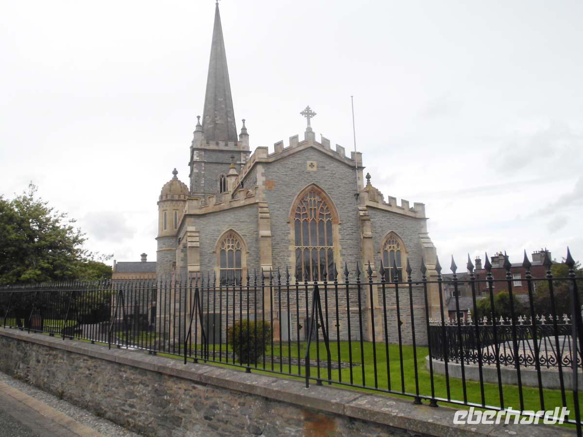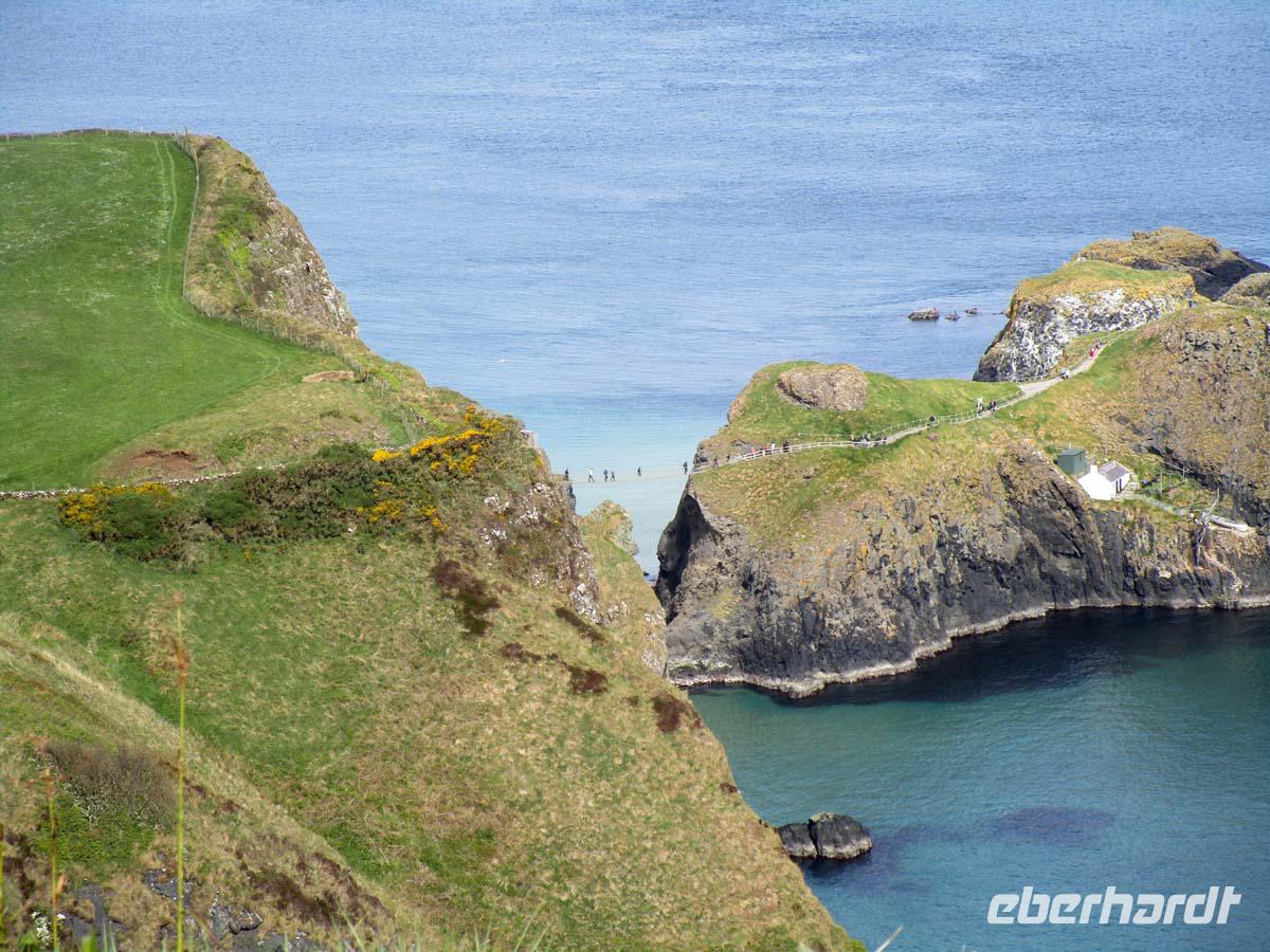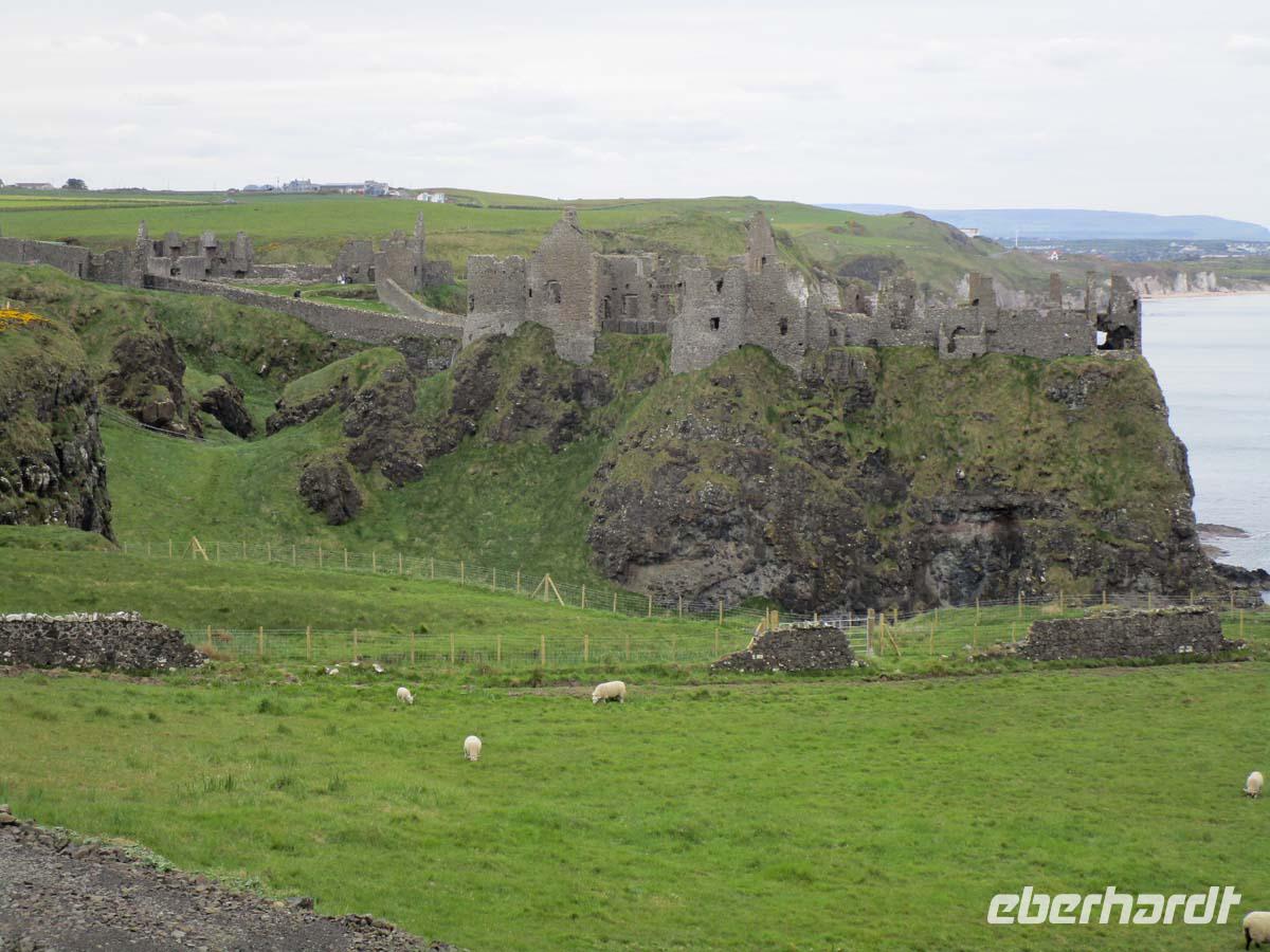 Wir begeben uns heute auf unsere Tour an der Nordirischen Küste entlang. Zunächst ein kurzer Stop am mächtigen normannischen Castel von Carrikfergus, wo Wilhelm III. von Oranien (Protestant) landete, um den letzten Stuart Jakob II. (Katholik) zu besiegen, was am River Boyle 1690 auch gelang. Einen kurzen Stop legen wir in Carnlough ein, wo ein kleiner Laden salziges Seaweed zum roh essen anbietet. Auch die legendäre Fudge, cremiges Karamel in Bonbonform wird verkostet. Was am Ortseingang wie ein Stadtttor aussieht, ist in Wirklichkeit eine Brücke für die Loren, welche auf Schienen die Kalksteine aus den Steinbrücken bis in den Hafen auf die Schiffe rollten. Von einem weiteren Aussichtspunkt blicken wir bis nach Schottlands Mull of Kintyre hinüber und sehen unter uns die Carrick-a-Rede rope bridge, die einen kleinen Felsen mit dem Festland verbindet. Doch das Highlight ist der Giants Causeway, ein aus 6-8 eckigen Basaltlavasteinen geformtes Naturwunder. Ein Riese soll diesen Fußweg bis nach Schottland gebaut haben, um sich mit einem anderen zu duellieren. In der Tat ist diese Formation auch in Schottland in kleinerer Form noch zu sehen. Geologen sagen jedoch, dass es sich um Reste der Kaldera eines riesigen Vulkanes handelt, dessen letzte Eruption vor 60 Millionen Jahren diese Basaltsäulen aus sehr langsam erkalteter Lava hinterließ. Nach einem Fotostop am Dunluce Castel, einem der größten mittelalterlichen Burganlagen Gesamtirlands spazieren wir in Derry zunächst über die komplett erhaltene Stadtmauer und an der anglikanischen Kathedrale vorbei. Nach einem Blick auf die Bogside, dem Viertel wo 1972 der berüchtigte bloody Sunday stattfand gehen wir über den zentralen Platz der Stadt wo sich das älteste moderne Kaufhaus der Welt, nämlich Austins aus dem Jahr 1830 befand. Den Abschluß bildet ein Besuch der altehrwürdigen Guild Hall mit ihren beeindruckenden Glasfenstern und der imposanten Haupthalle. Weil noch ein wenig Zeit ist, legen wir eine Besichtigung eines der typischen, bis in die Eisenzeit zurückreichenden steinernen Ringforts ein. Grianan Ailligh liegt hoch auf einem Berg mit guter Sicht sowohl auf Derry im Osten, als auch auf den Lough Swilly mit der Insel Inch im Nordwesten. Es liegt schon in der Republik Irland. Die Grenze zu Großbritannien existiert quasi nicht. Es gibt auch keine Kontrollen. Und so reisen wir ungehindert in unser Hotel in Letterkenny, wo schon ein gutes Abendmenü auf uns wartet.
