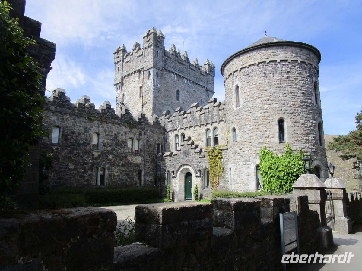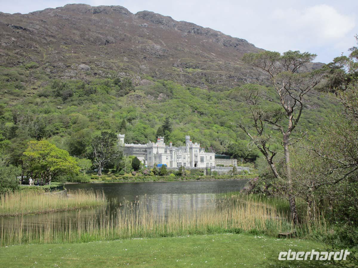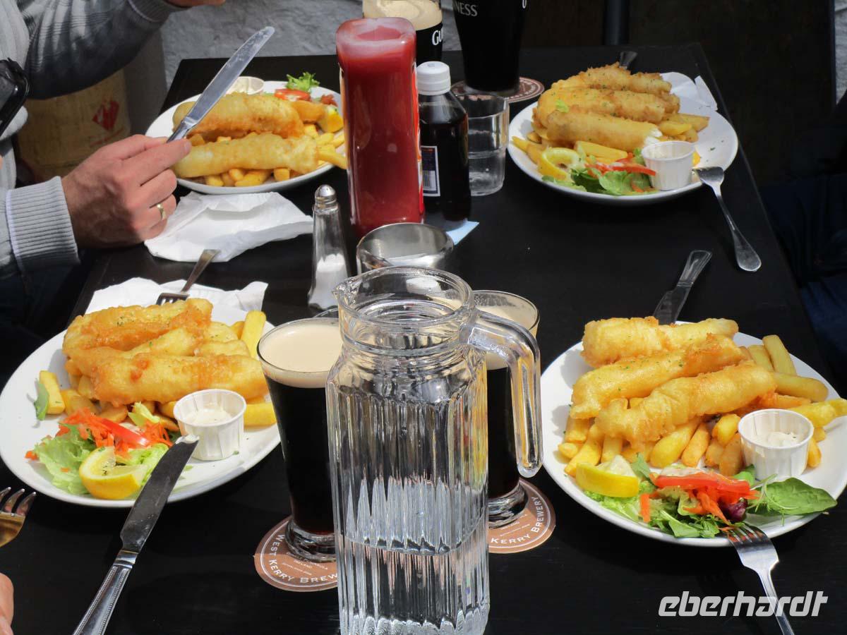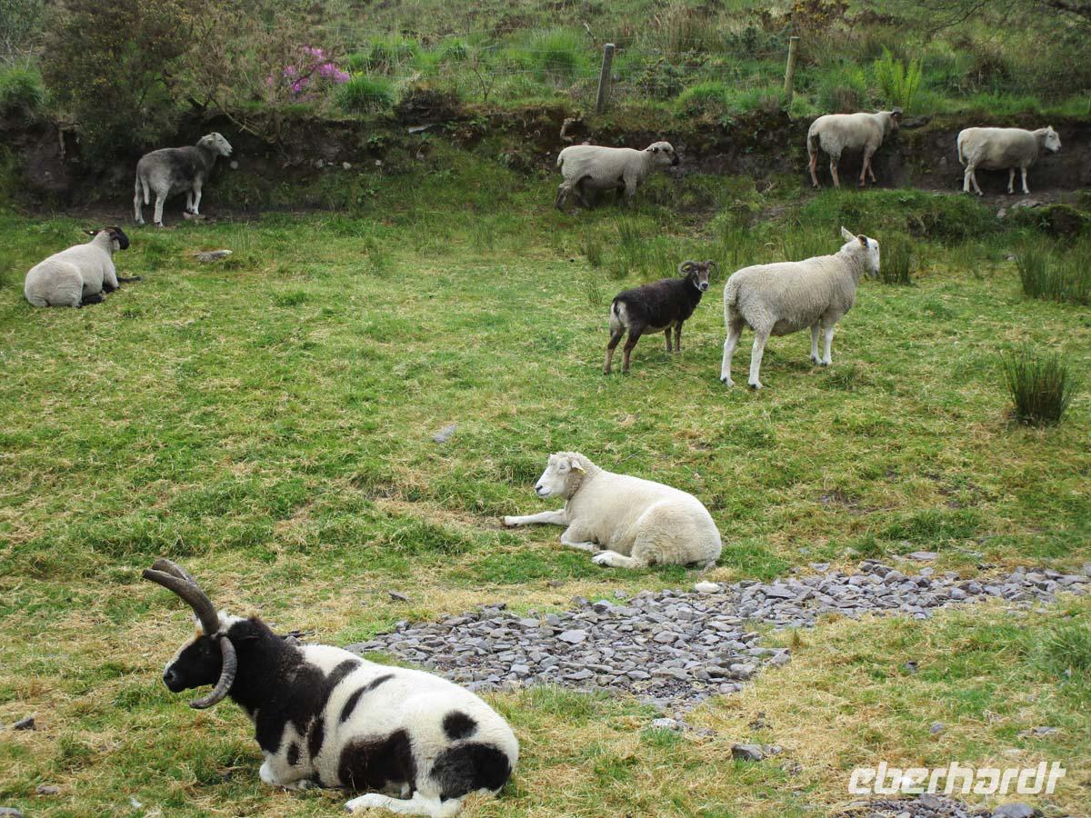 Wilde Moore, bezaubernde Hügellandschaften und wunderbare Aussichten auf die Küste der Iveragh Halbinsel bieten sich uns heute. In Kilorglin fahren wir bei feuchtem am Denkmal für King Phuk vorbei. Dieser Ziegenbock wird seit der Zeit Oliver Cromwells, als ca. 1650 für drei Tage zum König der Stadt gewählt, während ganz nebenbei ein großer Viehmarkt stattfindet. Danach erzählt uns ein Schäfer von seiner Arbeit mit Schafen und Hunden, den so genannten Border Collies. Er zeigt uns, wie seine Hunde auf die Signale mit Stimme und Pfeife reagieren und führt uns zudem noch die verschiedensten Schafsrassen vor. Hinter Cahersiveen besuchen wir ein zweites Ringfort mit Namen Cahergal, welches aus der Eisenzeit stammt. Von hier aus haben wir eine wunderbare Aussicht auf die Turmburg Ballycarbery Castle direkt vor dem Wasser. In Cahersiveen sehen wir die einzige Kirche, die einem Laien gewidmet ist, nämlich Daniel o Connell, dem Freiheitskämpfer aus dem beginnenden 19. Jh., welcher später Oberbürgermeister von Dublin wurde. Mit seinem Geburtshaus direkt an der Nationalstraße ging man hingegen nicht so pfleglich um. Es bietet sich uns als notdürftig gesicherte Ruine dar. Nach einem Stop in Waterville, wo schon Charlie Chaplin gerne logierte, überqueren wir den Coomakista Pass. Unsere Mittagspause legen wir im kleinen Städtchen Sneem ein, in dem es guten Irish Coffee und auch so manch leckeres zum Mittag zu essen gibt. Weit können wir auch vom Aussichtspunkt Ladies View im Killarney Nationalpark schauen. Eine Aussicht, die schon Königin Viktoria mit ihren Hofdamen im 19. Jahrhundert genoss. Gegen Ende des Rings of Kerry lädt noch der Torc Waterfall in der Nähe von Muckross House zu einem Spaziergang ein. Der Weg führt durch einen verwunschenen Wald mit dick bemoosten, uralten Eichen. Bevor wir uns zurück nach Tralee begeben, lassen wir uns Muckross Castle nicht entgehen. Von außen sehen wir ein riesiges Landhaus im neogotischen Stil. Es ist das vierte, welches sich die Familie Herbert auf ihrem 4000 ha großen Areal hat errichten lassen. Seit 1730 war diese dort ansässig. Der jetzige Bau wurde 1843 fertig. Aber als sich Königin Victoria 1861 zu einem Besuch ankündigte, übernahm sich der Besitzer mit Anbauten und Parkerweiterungen finanziell dermaßen, daß dies letztlich zum Ruin der Familie Herbert führte. Aber auch deswegen können wir heute einen riesigen und wunderschönen Landschaftspark im englischen Stil eintrittsfrei genießen, der die Keimzelle des Killarney Nationalparks bildete. Durch Killarney reisen wir zurück nach Tralee wo uns das Abendmenü erwartet.
