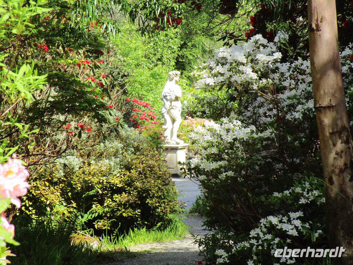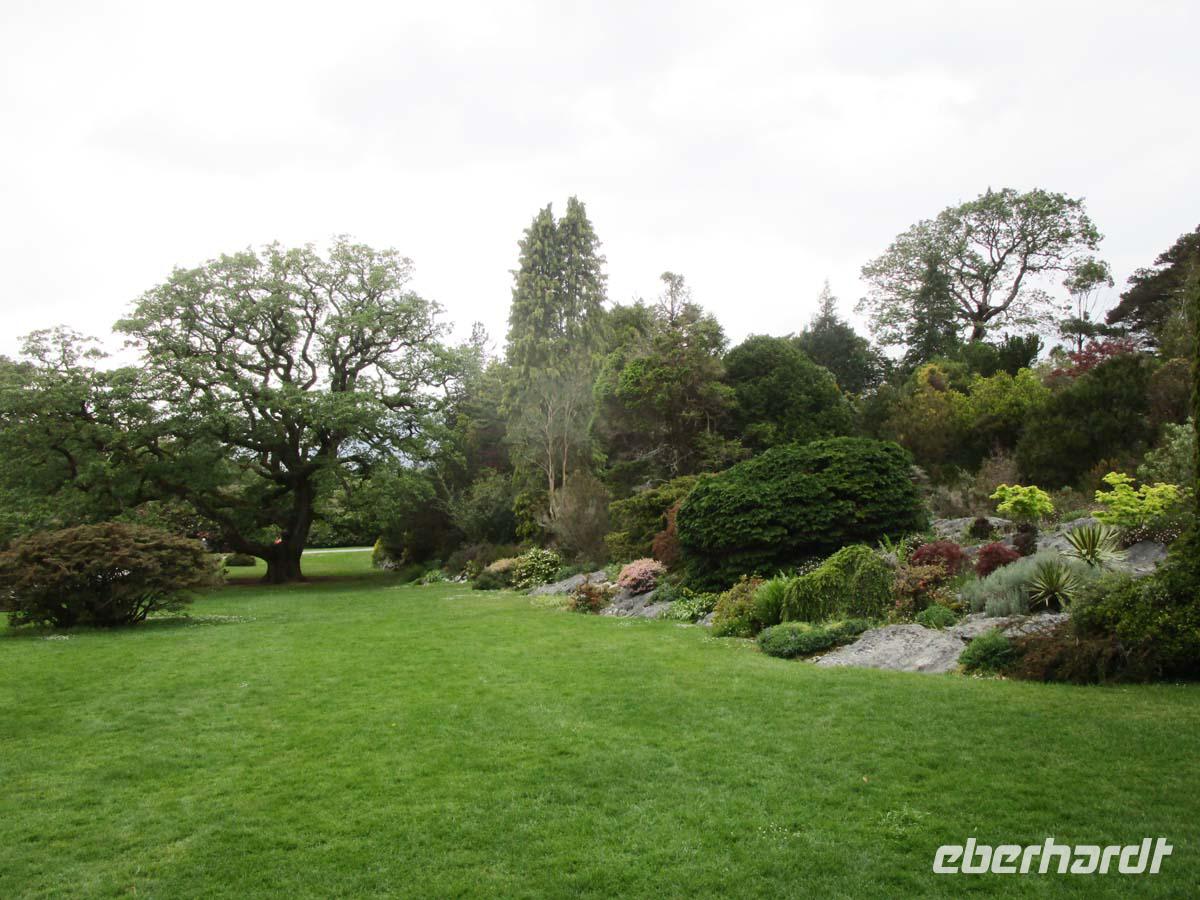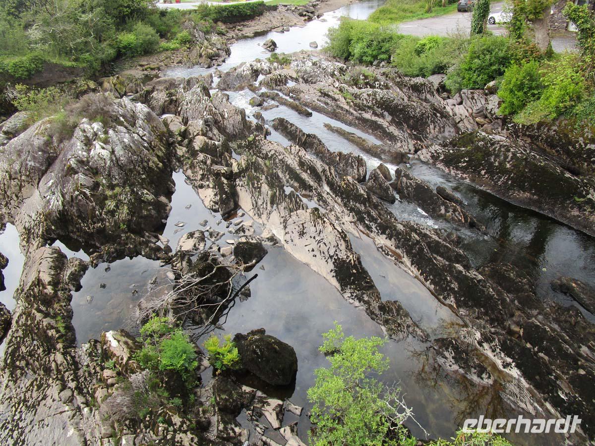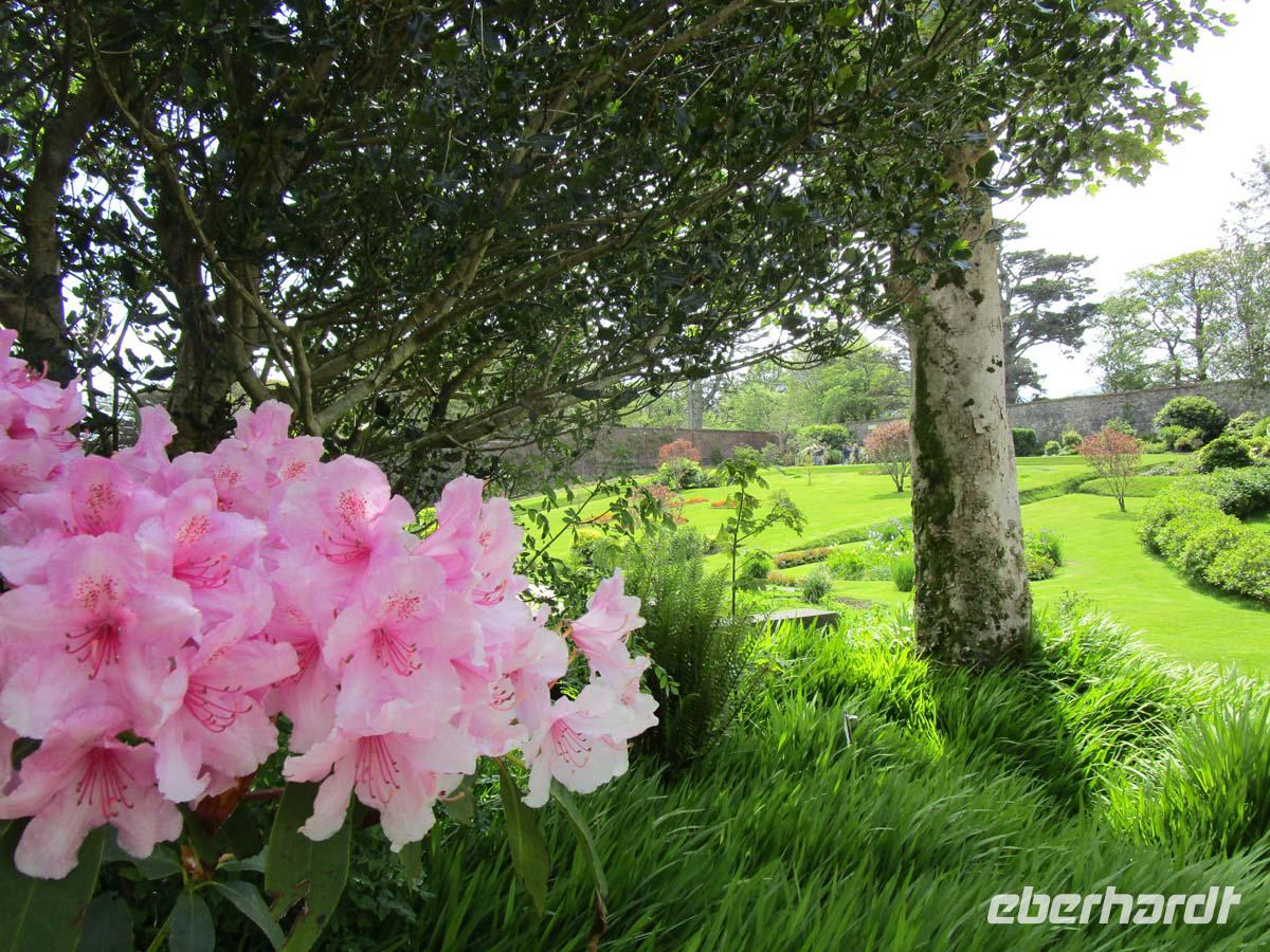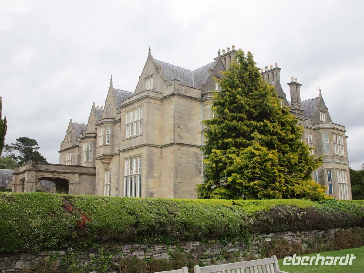 Wilde Moore, bezaubernde Hügellandschaften und wunderbare Aussichten auf die Küste der Iveragh Halbinsel bieten sich uns heute. In Kilorglin fahren wir bei feuchtem am Denkmal für King Phuk vorbei. Dieser Ziegenbock wird seit der Zeit Oliver Cromwells, als ca. 1650 für drei Tage zum König der Stadt gewählt, während ganz nebenbei ein großer Viehmarkt stattfindet. Danach erzählt uns ein Schäfer von seiner Arbeit mit Schafen und Hunden, den so genannten Border Collies. Er zeigt uns, wie seine Hunde auf die Signale mit Stimme und Pfeife reagieren und führt uns zudem noch die verschiedensten Schafsrassen vor. Hinter Cahersiveen besuchen wir ein zweites Ringfort mit Namen Cahergal, welches aus der Eisenzeit stammt. Von hier aus haben wir eine wunderbare Aussicht auf die Turmburg Ballycarbery Castle direkt vor dem Wasser. In Cahersiveen sehen wir die einzige Kirche, die einem Laien gewidmet ist, nämlich Daniel o Connell, dem Freiheitskämpfer aus dem beginnenden 19. Jh., welcher später Oberbürgermeister von Dublin wurde. Mit seinem Geburtshaus direkt an der Nationalstraße ging man hingegen nicht so pfleglich um. Es bietet sich uns als notdürftig gesicherte Ruine dar. Nach einem Stop in Waterville, wo schon Charlie Chaplin gerne logierte, überqueren wir den Coomakista Pass. Unsere Mittagspause legen wir im kleinen Städtchen Sneem ein, in dem es guten Irish Coffee und auch so manch leckeres zum Mittag zu essen gibt. Weit können wir auch vom Aussichtspunkt Ladies View im Killarney Nationalpark schauen. Eine Aussicht, die schon Königin Viktoria mit ihren Hofdamen im 19. Jahrhundert genoss. Gegen Ende des Rings of Kerry lädt noch der Torc Waterfall in der Nähe von Muckross House zu einem Spaziergang ein. Der Weg führt durch einen verwunschenen Wald mit dick bemoosten, uralten Eichen. Bevor wir uns zurück nach Tralee begeben, lassen wir uns Muckross Castle nicht entgehen. Von außen sehen wir ein riesiges Landhaus im neogotischen Stil. Es ist das vierte, welches sich die Familie Herbert auf ihrem 4000 ha großen Areal hat errichten lassen. Seit 1730 war diese dort ansässig. Der jetzige Bau wurde 1843 fertig. Aber als sich Königin Victoria 1861 zu einem Besuch ankündigte, übernahm sich der Besitzer mit Anbauten und Parkerweiterungen finanziell dermaßen, daß dies letztlich zum Ruin der Familie Herbert führte. Aber auch deswegen können wir heute einen riesigen und wunderschönen Landschaftspark im englischen Stil eintrittsfrei genießen, der die Keimzelle des Killarney Nationalparks bildete. Durch Killarney reisen wir zurück nach Tralee wo uns das Abendmenü erwartet.