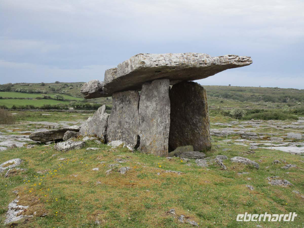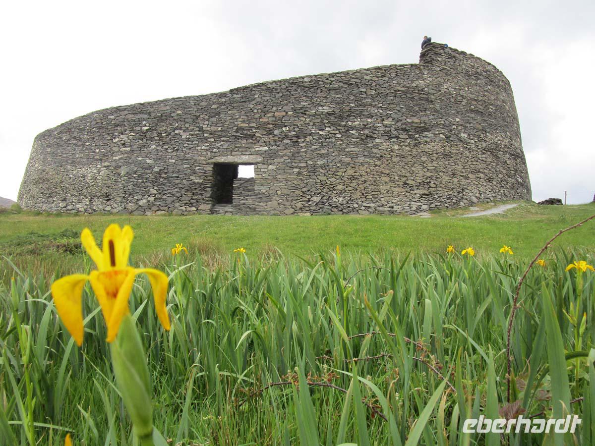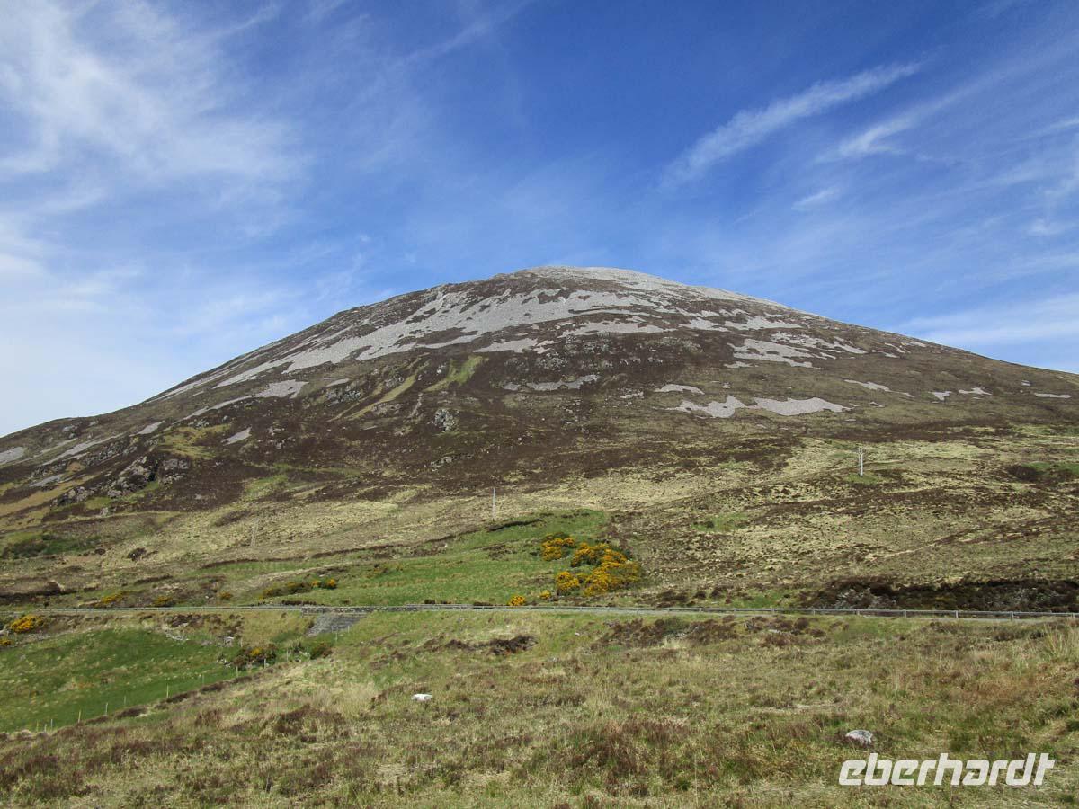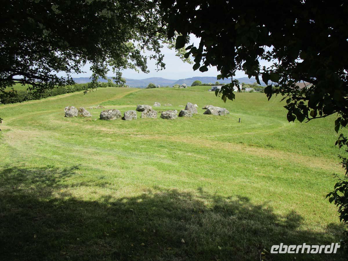Heute besuchen wir zuerst die kleine Stadt Donegal, welche dem County ihren Namen gegeben hat. Dabei hat sie nicht mal 3000 Einwohner und ist auch nicht die Hauptstadt der Grafschaft. Das ist Lifford. Dafür ist sie aber sehr gut zu überblicken. Vom dreieckigen Hauptplatz, dem Diamond gehen drei Straßen ab. An einer liegt neben der Touristinformation der Friedhof mit den Resten der alten Abtei aus dem Jahr 1474, an der anderen das Donegal Castle, einem Sitz der o´Donells, ebenfalls aus dem 15. Jh. Dazwischen pittoresk bemalte Häuschen, deren Läden zum Flanieren einladen. Den nächsten Stop machen in Drumcliff im County Sligo. Das Dorf würde kein Mensch kennen, wenn hier nicht der erste Literaturnobelpreisträger Irlands begraben worden wäre. W.B. Yeats bekam ihn 1923 für die literarische Umsetzung der irischen Probleme mit England und als wichtigster Vertreter der so genannten irischen Renaissance in der Literatur. Er starb zwar in Frankreich, wollte jedoch immer unterhalb des Ben Bulben, einem richtigen, mit der Mythologie Irlands eng verbundenen Tafelberg begraben sein. Doch nun besuchen wir eines der größten Megalithgräberfelder Irlands: Carrowmore. Die Großsteingräber aus dem 5. -4. Jahrtausend vor Christus nehmen allesamt Bezug auf das größte Grab der Anlage, einen riesigen Cairn, was soviel wie Steinhaufen bedeutet. Unter diesem befindet sich, gut gegraben und rekonstruiert die Grabkammer aus mächtigen Steinen. Einen guten Blick hat man von hier aus auch auf den Berg Knocknarea, auf dessen Spitze sich der größte Megalithgrabhügel Irlands befindet.
