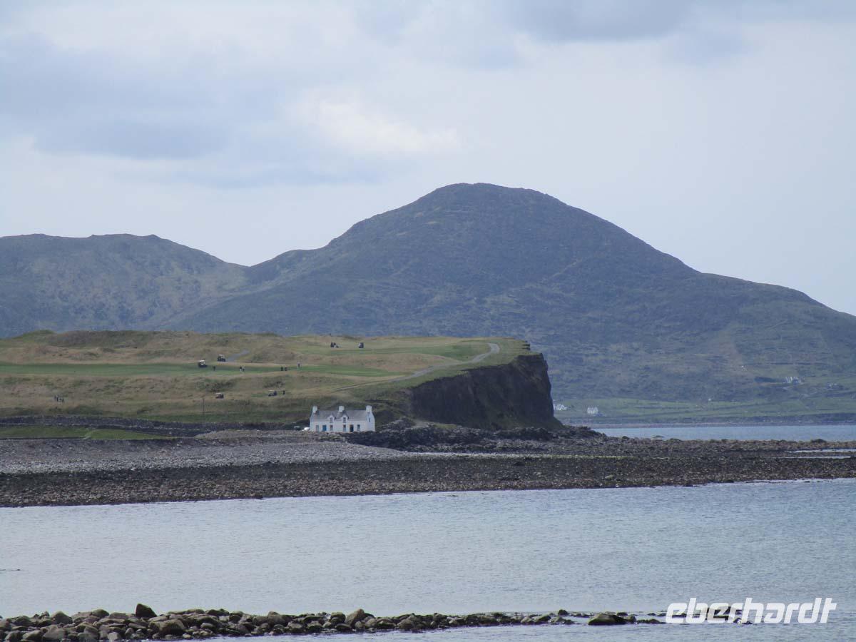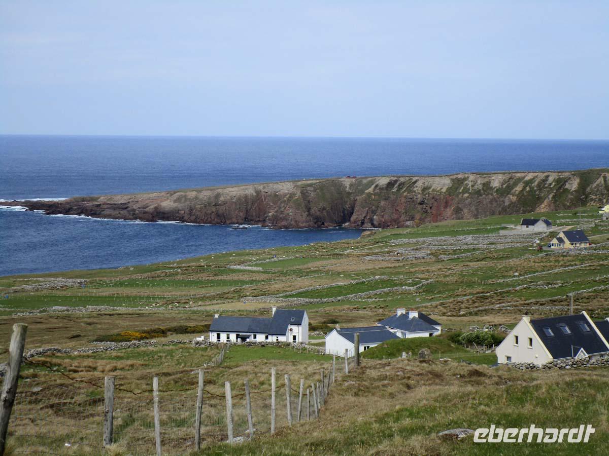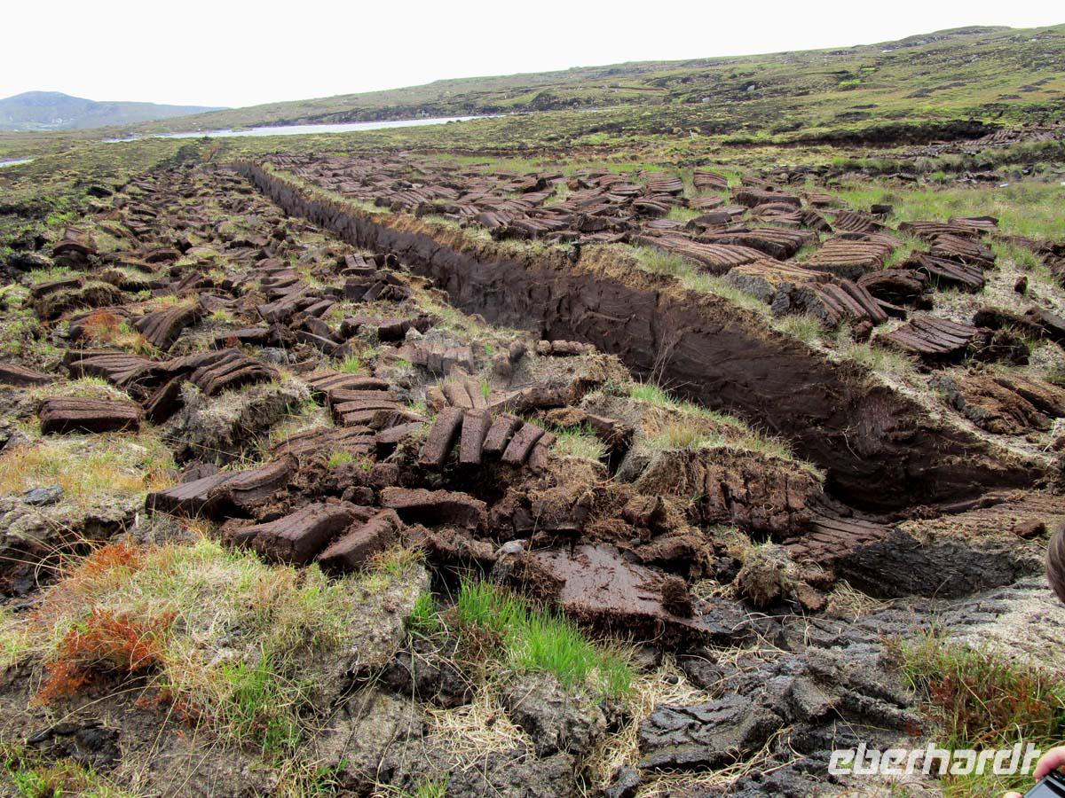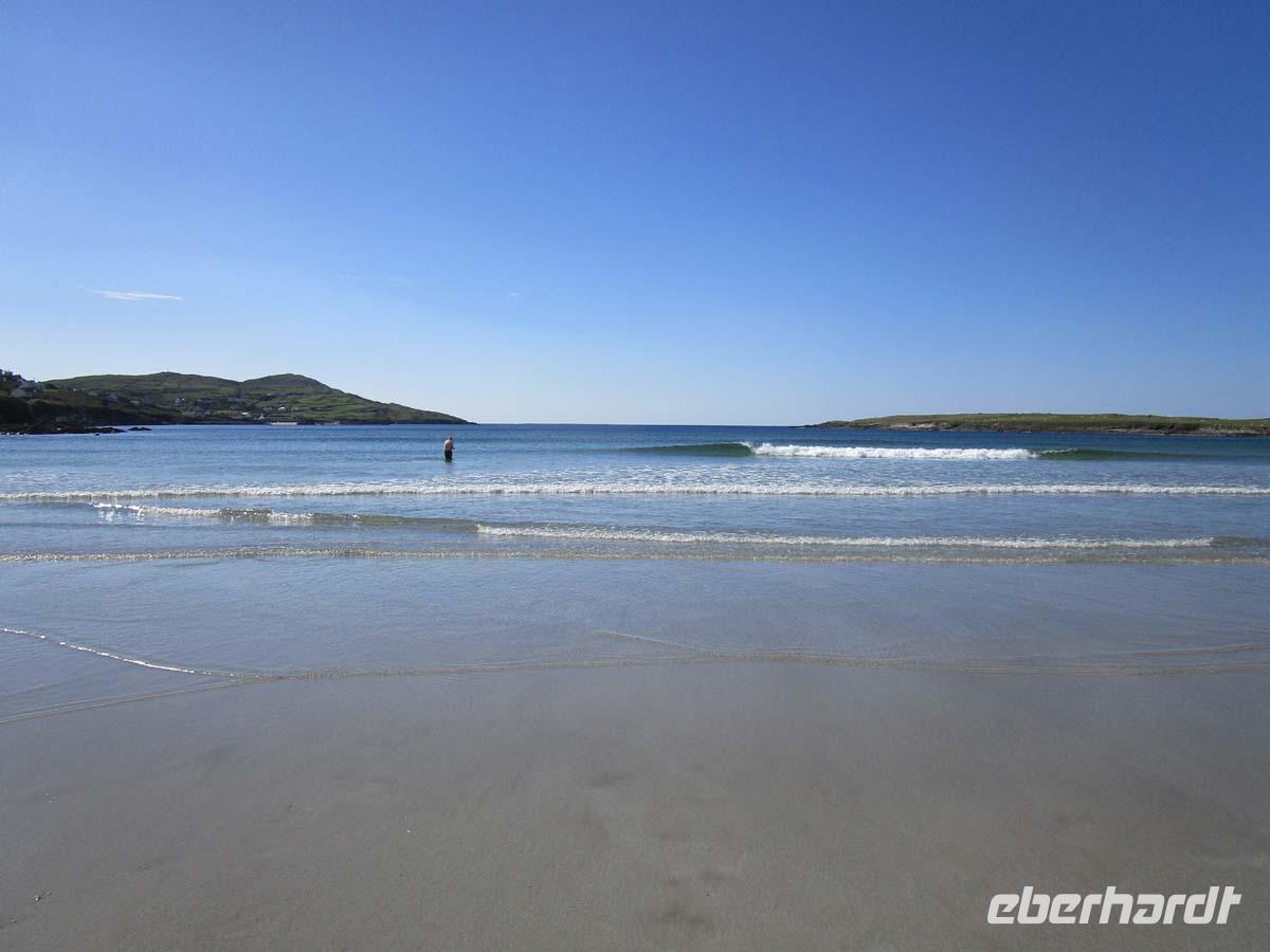 Zunächst steht heute der Glenveagh Nationalpark auf dem Programm. Die Weichseleiszeit hat im Nationalpark ihre Spuren hinterlassen. Überall liegen große Findlinge herum, welche das 2 km dicke Eis hierhin geschoben hat. Dazwischen hat sich eine mächtige Torfschicht gebildet, die nun von Heidekraut überwuchert ist. Mitten drin liegt wie in einer Oase in einem wunderschönen Park das gleichnamige Schloß welches an viktorianischem Flair nichts zu wünschen übrig lässt. Und der Garten erst: Verschiedene Themen werden gärtnerisch umgesetzt (Toskana, Landschaft, Kräuter usw.) Liegt das viktorianische Schloss doch in einer richtigen Sonnenfalle mit romantischem Blick auf den Loch Veagh. Auch Jehudi Menachem und Greta Garbo waren hier oft zu Gast. Nachdem wir oberhalb von Moneymore am höchsten Berg des Nationalparks, dem Mount Errigal stoppten, reisen wir zu einem wilden Aussichtspunkt am Wild Atlantik Way namens Bloody Foreland. Dieser trägt seinen Namen wegen der rotglühend aussehenden Felsen bei Sonnenuntergang. Nach einer kundigen in Augenscheinnahme eines frischen Torfstiches erreichen wir die kleine Stadt Dungloe, wo wir unser Mittagessen einnehmen. Es ist der Hauptort der Landschaft The Rosses im äußersten Nordwesten Irlands, dessen Bewohner sich durch einen eigenen Dialekt, eigene Gebräuche und auch sonst etwas vom Rest der Bevölkerung abheben. Auch eines der größten Folkfestivals Irlands findet hier statt, auf dem jährlich die beste Sängerin, die „Mary of Dungloe" gekrönt wird. Wir sind mitten in einem Gaeltachtgebiet. Hier ist die irische Sprache noch lebendig. Geradezu karibisches Flair umfängt uns am feinsandigen, 2 km weiten Strand Portnoo Beach bei Narin, wo die meisten von uns die Füße in den Atlantik halten. Zurück reisen wir im Süden des Nationalparks am Loch Finn vorbei. Am späten Nachmittag sind wir wieder in Letterkenny, und genießen das Abendmenue meist mit Krabbencocktail und Lammkeule.