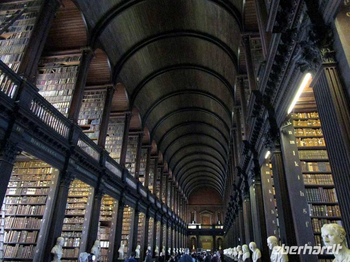 Schön ist es, noch fast den gesamten Tag in Dublin zu verbringen. Nach dem Frühstück stürzen sich alle in die quirlige Metropole und gehen zu den Dingen, die wir während der Stadtrundfahrt mitunter nur im Vorbeifahren gesehen haben. Etliche zieht es zum Guinnes Storehouse, aber der Eintritt von 25 Euro ist dann doch recht abschreckend. Andere entscheiden sich ad hoc für das weltberühmte Book of Kells aus dem 9. Jh. Es liegt in der historischen Bibliothek des Trinity College. Wir haben Glück und es hat sich am Eingang noch keine Warteschlange gebildet. Auch die benachbarte Nationalgalerie wartet mit Schätzen auf. Rembrandt, Tizian, Tintoretto, Vermeer, Pechstein, Monet etc. gibt es hier kostenlos zum Bestaunen.