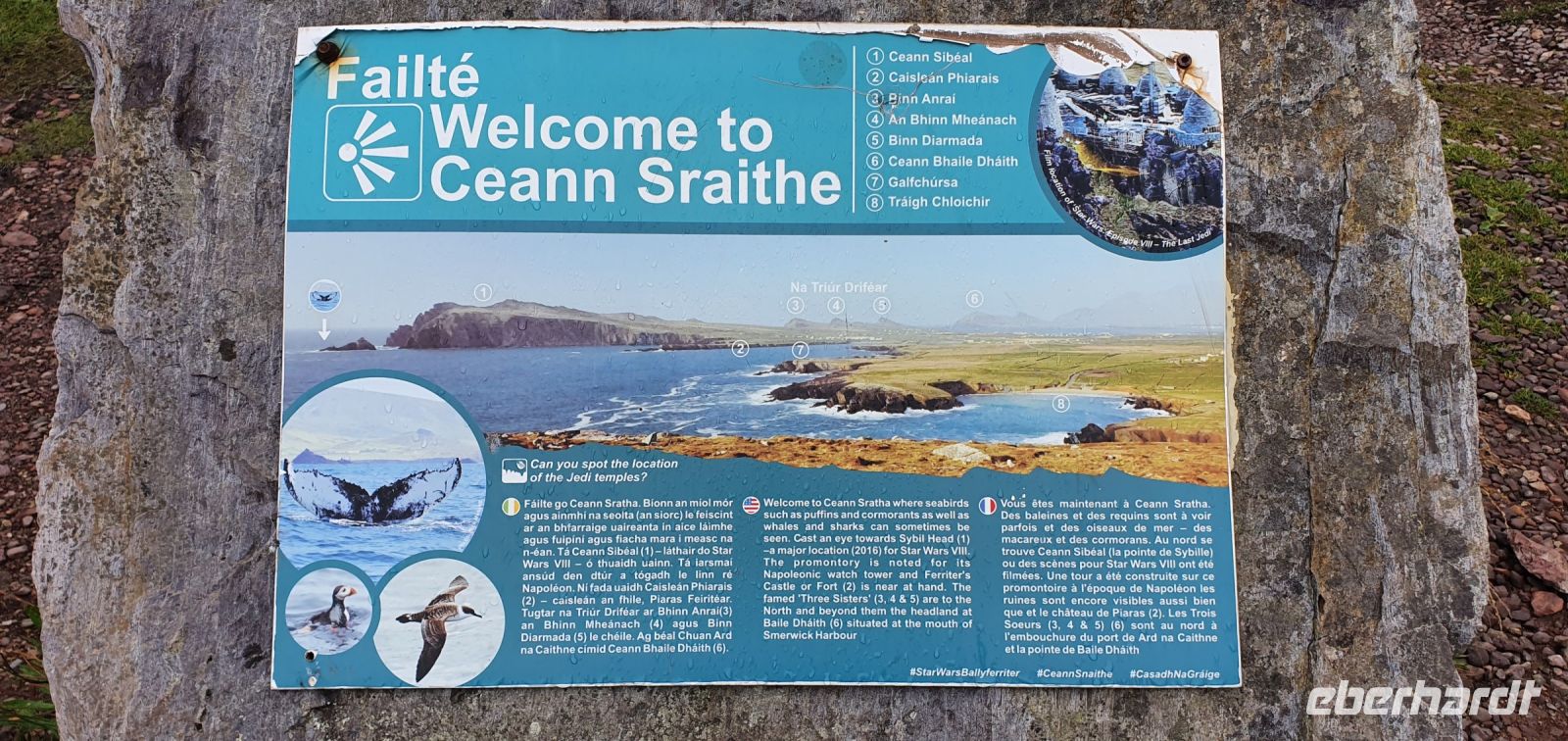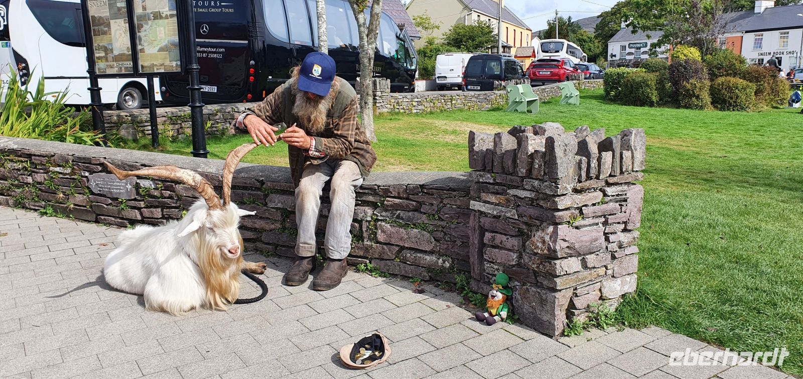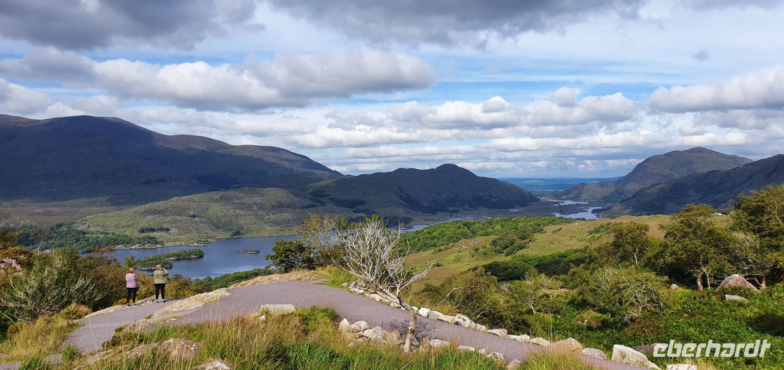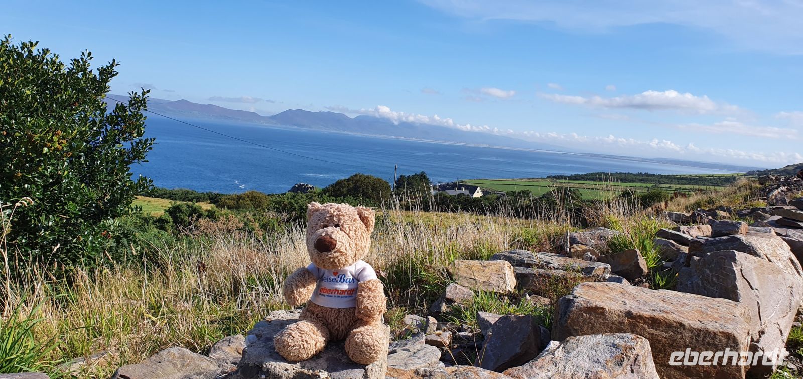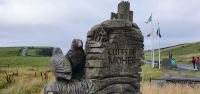 Heute lockt der berühmte Ring of Kerry. Via Castlemain geht es zunächst durch Killorglin. Hier steht an der Brücke ein ganz besonderes Denkmal: für Puck- den Ziegenbock! Einmal im Jahr wird tatsächlich ein wilder Ziegenbock für 3 Tage zum König gekrönt und Puck Fair gefeiert. Am Aussichtspunkt am River Caragh werden wir von Bauern mit ihrem Esel und Hündchen und einem Antik-Stand erwartet. Wir sind schon ziemlich weit oben und nur langsam hebt sich hier der Morgennebel. So zaubert er wundervolle Bilder in die Landschaft. In Kells schließlich erwartet uns Brendan mit seinen Hütehunden. Er demonstriert uns unterhaltsam, wie die Hunde die Schafe punktgenau zum Ziel bringen. Wir genießen die Sonne und sie Aussicht auf die Bucht bevor es weitergeht. Wir folgen dem Wild Atlantic Way und machen einen besonderen Stopp: am Skellig Chocolate Shop. Hier wird diese Köstlichkeit hergestellt, wir können verschiedene Geschmacksrichtungen probieren und natürlich landet etliches davon in unseren Taschen. Einige von uns spazieren hinunter zum Strand und ganz Mutige baden auch. Skellig Michael- die Inseln im Atlantik wurden auch durch die Star Wars Saga berühmt, die hier teilweise verfilmt wurden. Sie geben der Schokolade übrigens ihren Namen. Unsere Fahrt führ uns weiter nach Waterville. Auch hier ein ganz besonderes Denkmal: Charlie Chaplin. Er hat diesen Ort geliebt und kam oft zur Sommerfrische hierher. Ihm folgten bald viele Stars und Sternchen Hollywoods. Wir können unsere Mittagspause hier verbringen, bummeln an der Promenade oder am Ufer der Bucht. Wir folgen der Küstenlinie und stoppen natürlich am Chom a Chiste Aussichtspunkt. 3 Inseln erheben sich im Altlantik- der Bulle, die Kuh und das Kalb genannt- nach den hier vorbeiziehenden Walen. Immer wieder haben wir auf der Fahrt wunderschöne Ausblicke auf das Land und das Meer. In Sneem stoppen wir wieder für einen kleinen Rundgang. Viele spazieren zur Brücke über den Sneem, spektakulär rauscht der Fluss hier über Felsen und Steine. Der bunte Marktplatz lädt zum Bummeln ein und auch das Eis schmeckt. Unser Eberhardt- Reisebär bekommt einen neuen Freund: Ein Bär mit grünem Pullover und weißen Lämmern drauf :-) Weiter geht es entlang der Küstenstraße bis Kenmare und zurück ins Landesinnere. Hier in den Bergen gibt es einen Aussichtspunkt, der Ladys View genannt wird. Königin Victoria war hier mit ihren Hofdamen und sie sollen ob der Schönheit des Ortes hoch entzückt gewesen sein. Auch wir genießen den Blick auf die Seen und ein von mir heimlich vorbereitetes Picknick: Käse aus der Region mit Trauben, Brot, Tomaten und natürlich Keksen. Am späten Nachmittag erreichen wir den Torc Wasserfall. Ein kurzer Spaziergang und schon stehen wir davor. Idyllisch stürzt hier das Wasser aus mehr als 50 Metern Höhe hinunter. Über Killarney geht es schließlich zurück zum Hotel und ein leckeres Abendessen beschließt diesen schönen Tag
