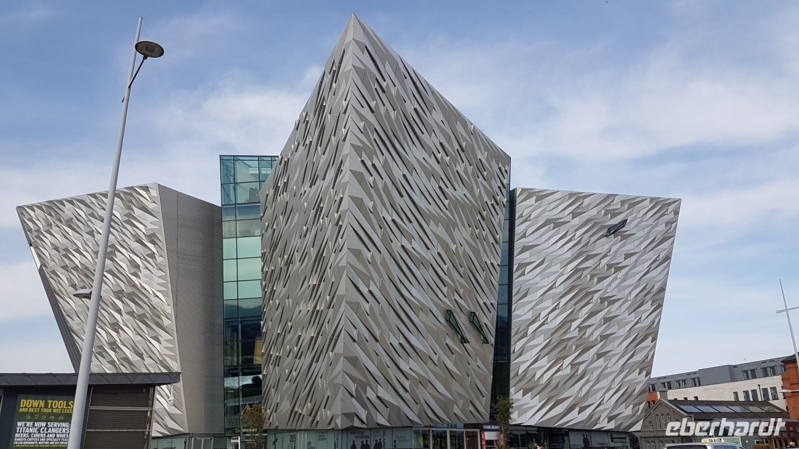 Bereits am frühen Morgen begann unsere Reise. Wir flogen von verschiedenen Flughäfen in Richtung Dublin. Dort trafen fast alle Gäste zusammen und unsere Reise auf der irischen Insel konnte beginnen. Nur der Flug aus München hatte so viel Verspätung, dass eine Dame unserer Reisegruppe mit dem Taxi direkt ins Hotel in Belfast gefahren wurde. Unser Busfahrer Viktor erwartete uns bereits am Flughafen. Unsere Koffer wurden in den Bus geladen und los ging die Fahrt nach Nordirland. In Belfast, der nordirischen Hauptstadt, hatten wir eine Stadtrundfahrt. Bibi zeigte uns die Universität, das Opernhaus, die Mauern von Belfast, die City Hall und das Titanic Quartier mit Titanic Museum und den riesigen Kränen von Harland & Wolff. Am frühen Abend erreichten wir unser Hotel Radisson Blu in Belfast. Wir ließen uns ein leckeres Abendessen schmecken und ruhten uns bald danach aus von der Anreise.