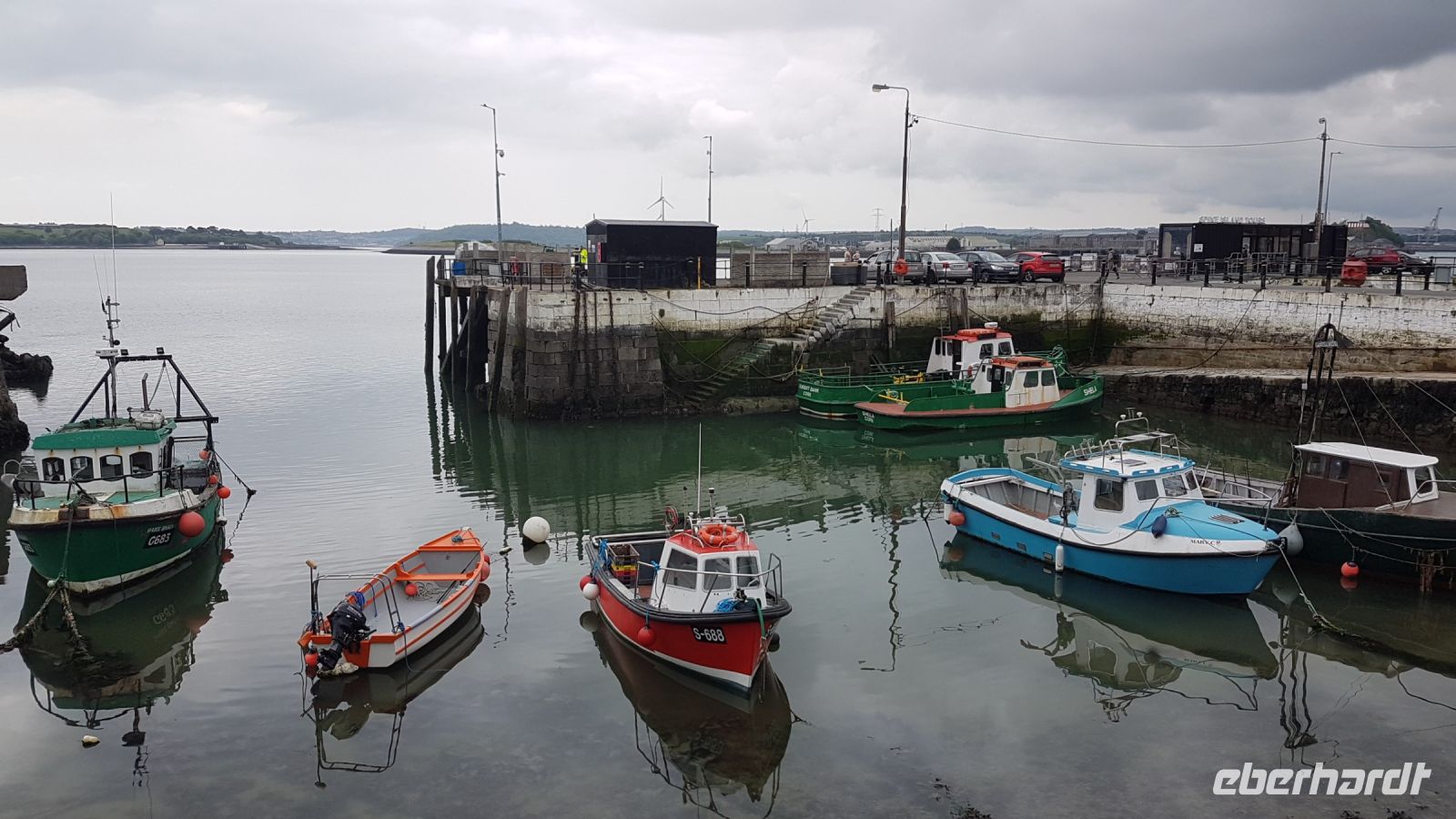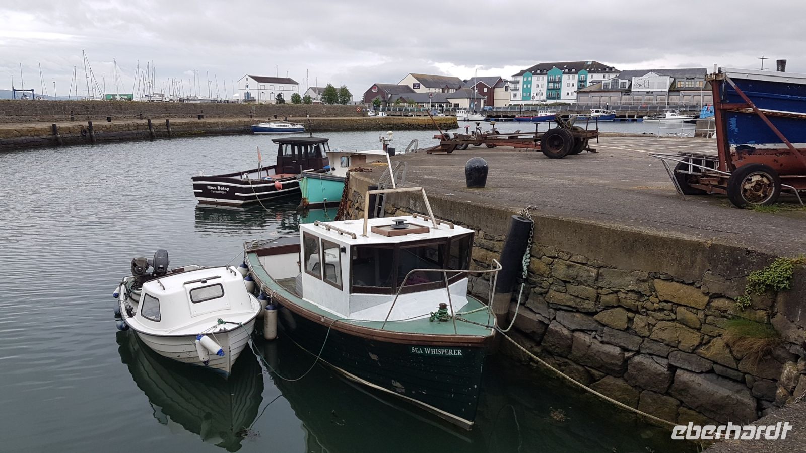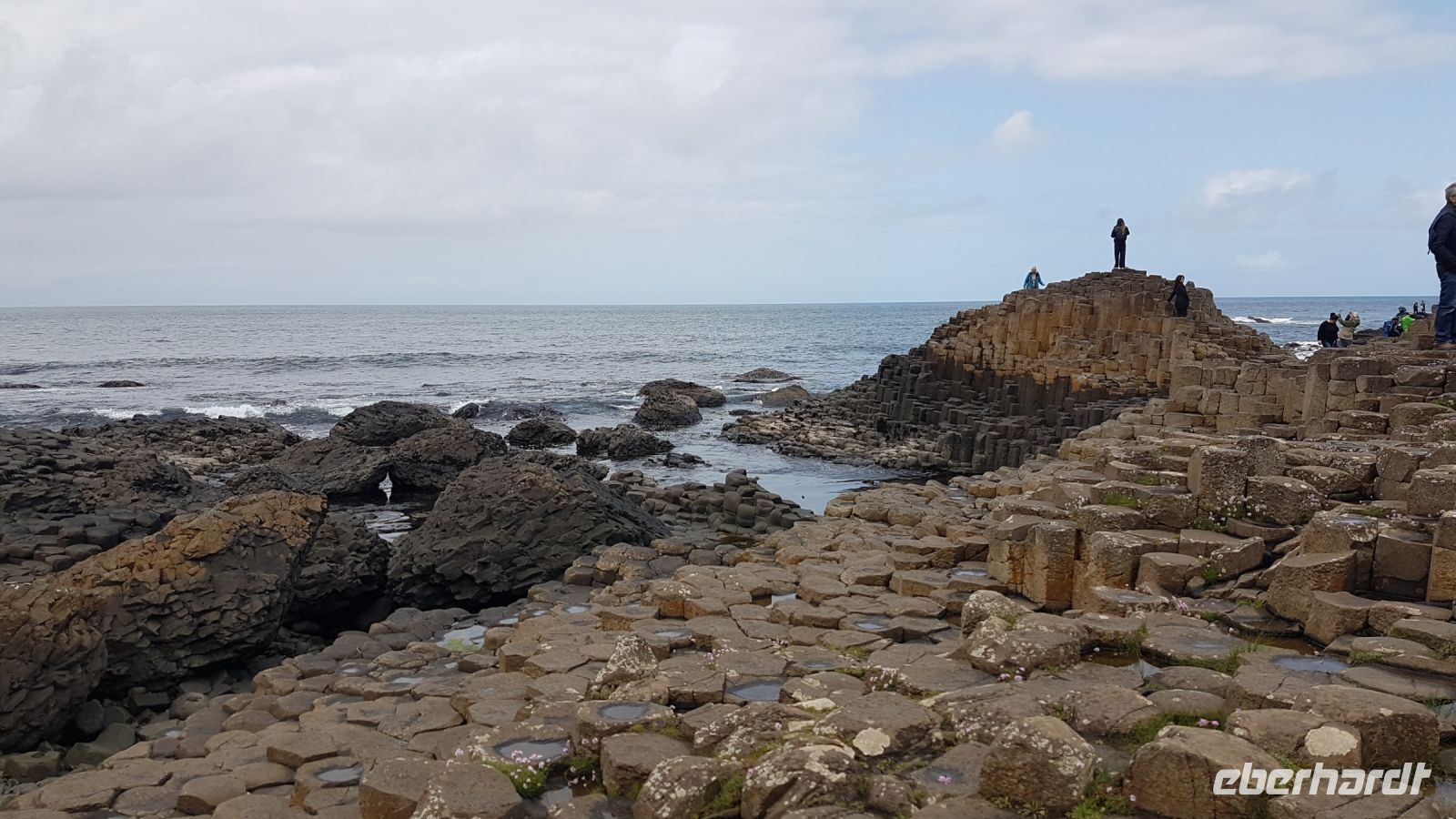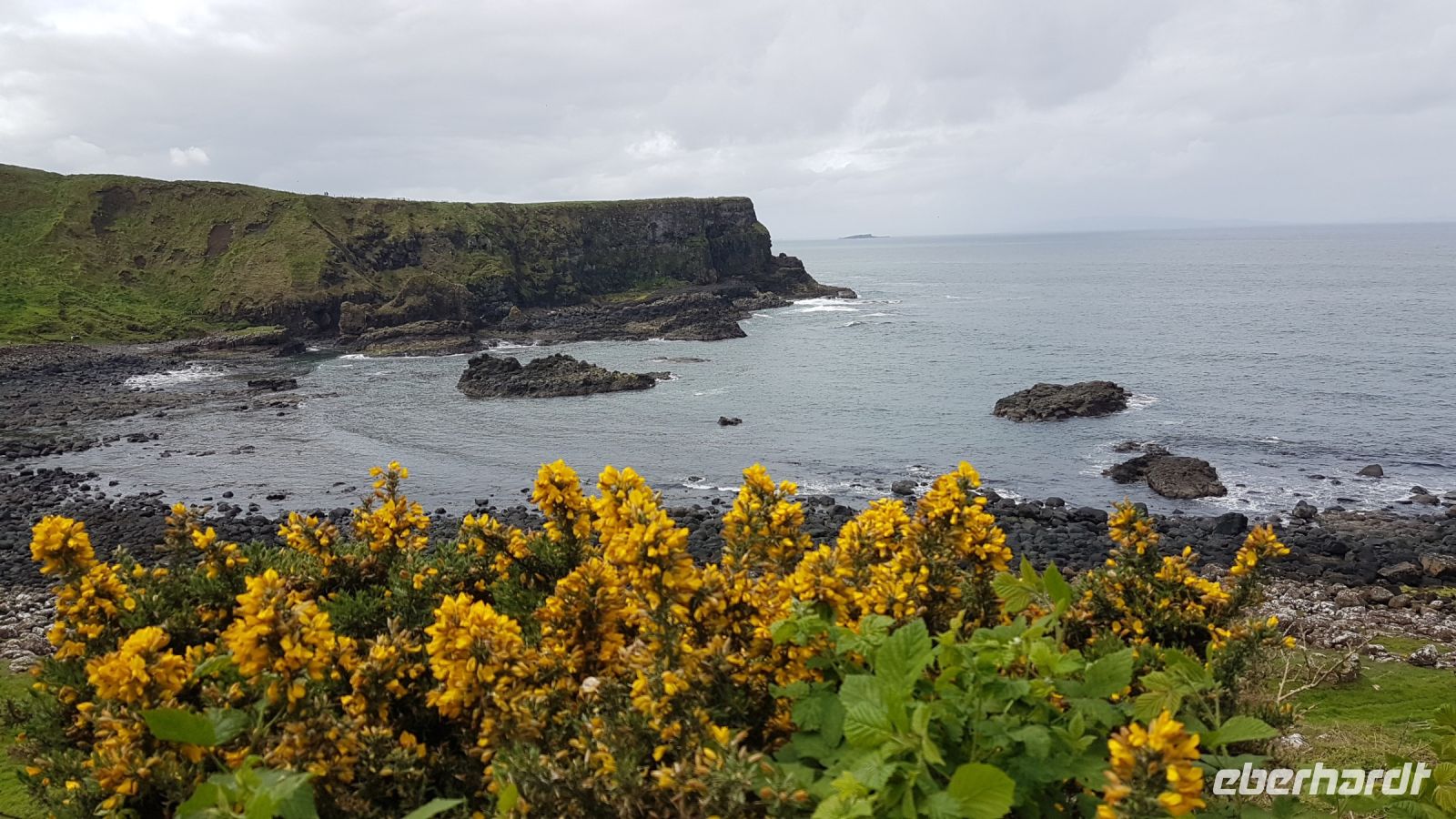 Nicht lange nach unserer Abfahrt vom Hotel erreichten wir Carrickfergus. Hier stoppte unser Bus für ein paar schöne Fotos vom Castle im Ort, das sich an einem kleinen Hafen befindet. Danach begann unsere herrliche Fahrt entlang der Antrim Coast Road. Das ist eine Küstenstraße, die uns an Sandstränden, Klippen und vom Meer umtosten Felsen entlang führt. In Carnlough legten wir einen Stopp ein und fotografierten den örtlichen Fischereihafen. Bald erreichten wir eine der bekanntesten Sehenswürdigkeiten Nordirlands. Am Giant's Causeway sahen wir die vor 60 Millionen Jahren entstandenen zumeist sechseckigen Basaltsäulen. Wir kletterten auf diesem Wunder der Natur umher, das seit 1986 zum Unesco Weltkulturerbe gehört. Nach unserem Aufenthalt hier bei ziemlich gutem Wetter bestiegen wir wieder unseren Bus und fuhren dann nach Derry / Londonderry, die letzte Stadt in Nordirland, bevor wir wieder in die Republik Irland hereinfahren würden.