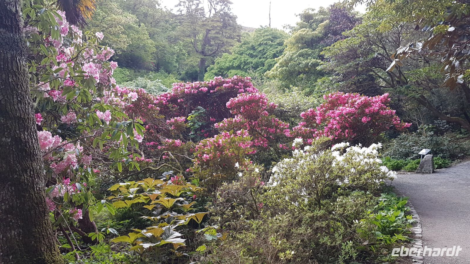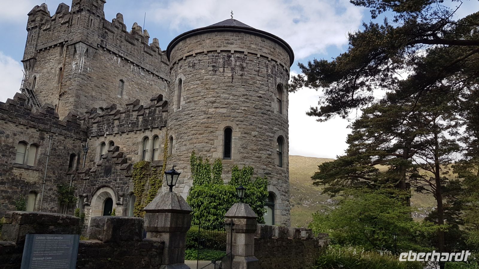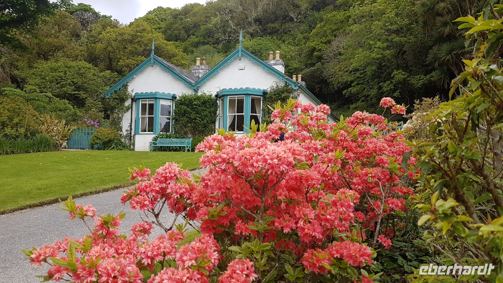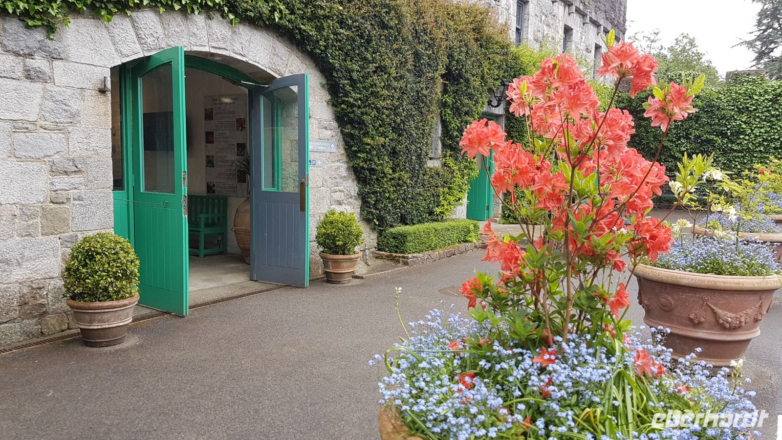 Zunächst sahen wir einen Film über die Entstehung des Nationalparks und vor allem über die Erbauer und Besitzer des Castles, das sich inmitten von rauer und karger Berglandschaft am idyllischen Ufer des Veagh Sees befindet. Es ist ein im Stil der schottischen Aristokratie errichtetes Schloss, es diente einst als Jagdschloss. Wir spazierten durch herrlich angelegte Gärten, einige Gäste wandelten in den stilvoll eingerichteten Räumen von Glenveagh Castle. Wir staunten über üppig blühende Rhododendren und genossen den beruhigenden Blick über den See, der sich zu Füßen des kleinen Schlosses erstreckt.