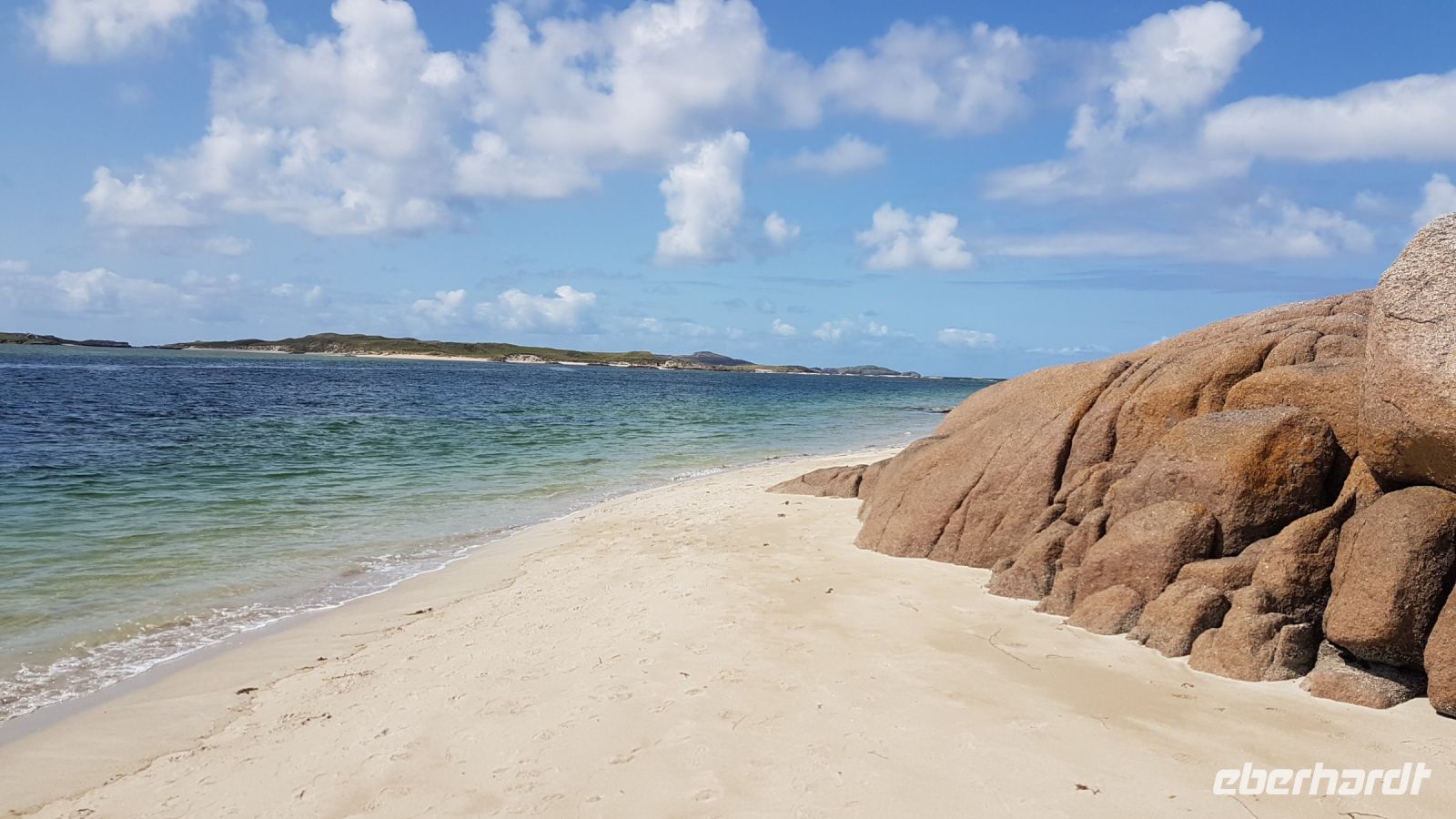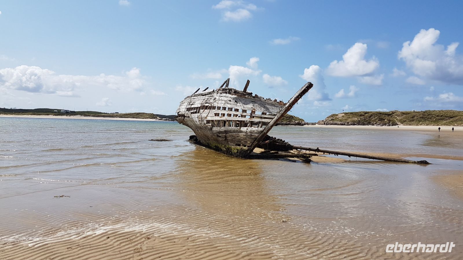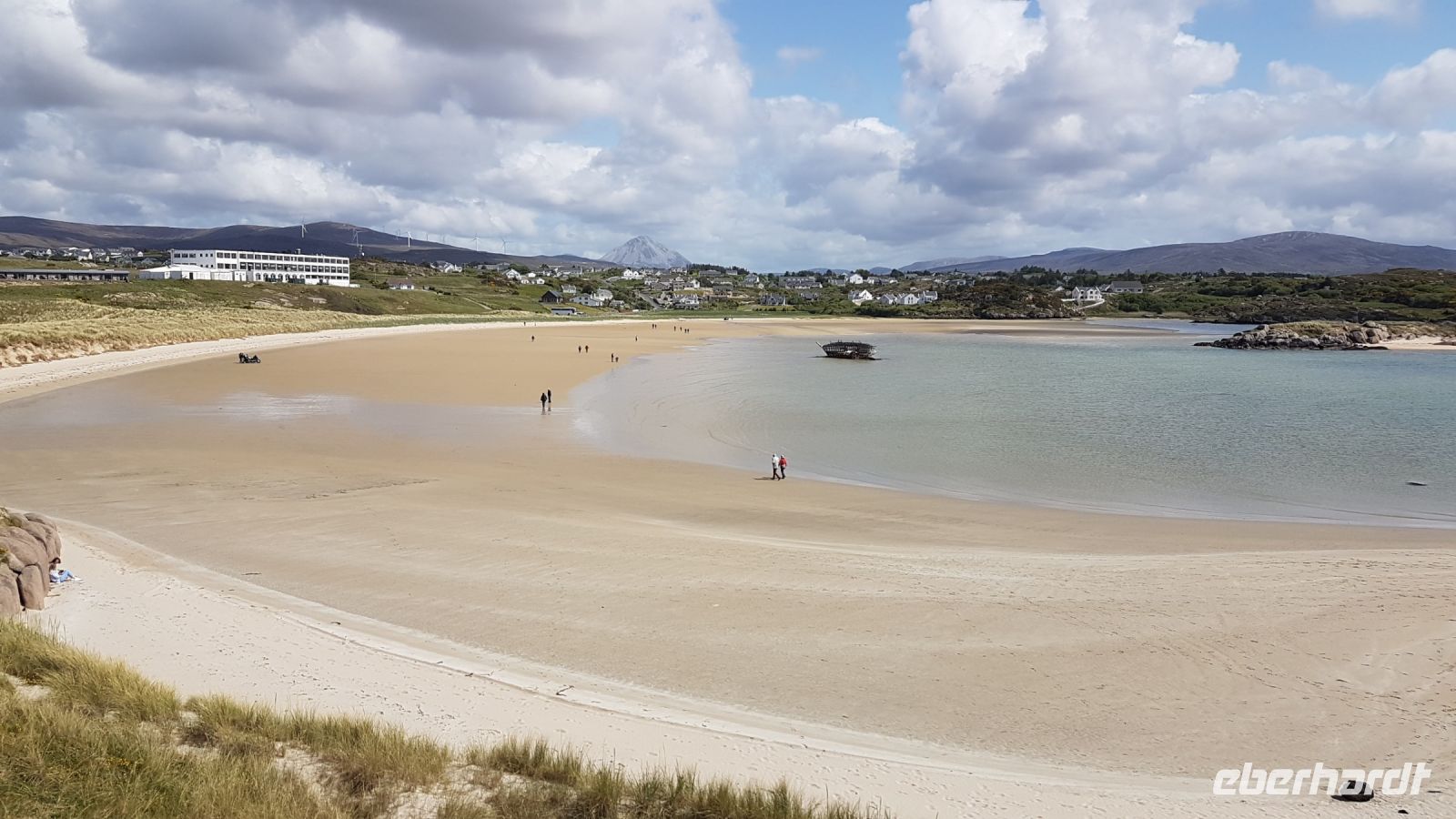 Nach diesem wunderschönen Besuch hieß es Abschied nehmen, wir verließen den Nationalpark, um das County Donegal zu erkunden. Zunächst fuhren wir Richtung Westen, bis wir die berühmte Küstenstraße „Wild Atlantik Way" erreichten. Unterwegs hielten wir mehrere Male an, um die beeindruckende Natur im Foto festzuhalten: von Gletschern geformte weite Täler, karg bewachsene imposante Berge, alte Kirchen und hübsche Dörfer. Aber auch breite Sandstrände konnten wir entdecken. An einem davon, Bunbeg Beach, verbrachten wir eine erholsame Stunde bei wunderbarem Wetter. Nach diesem erlebnisreichen und beeindruckenden Ausflug erreichten wir am frühen Abend wieder unser Hotel. Wir ließen uns das Abendessen schmecken und den Tag gemütlich ausklingen.