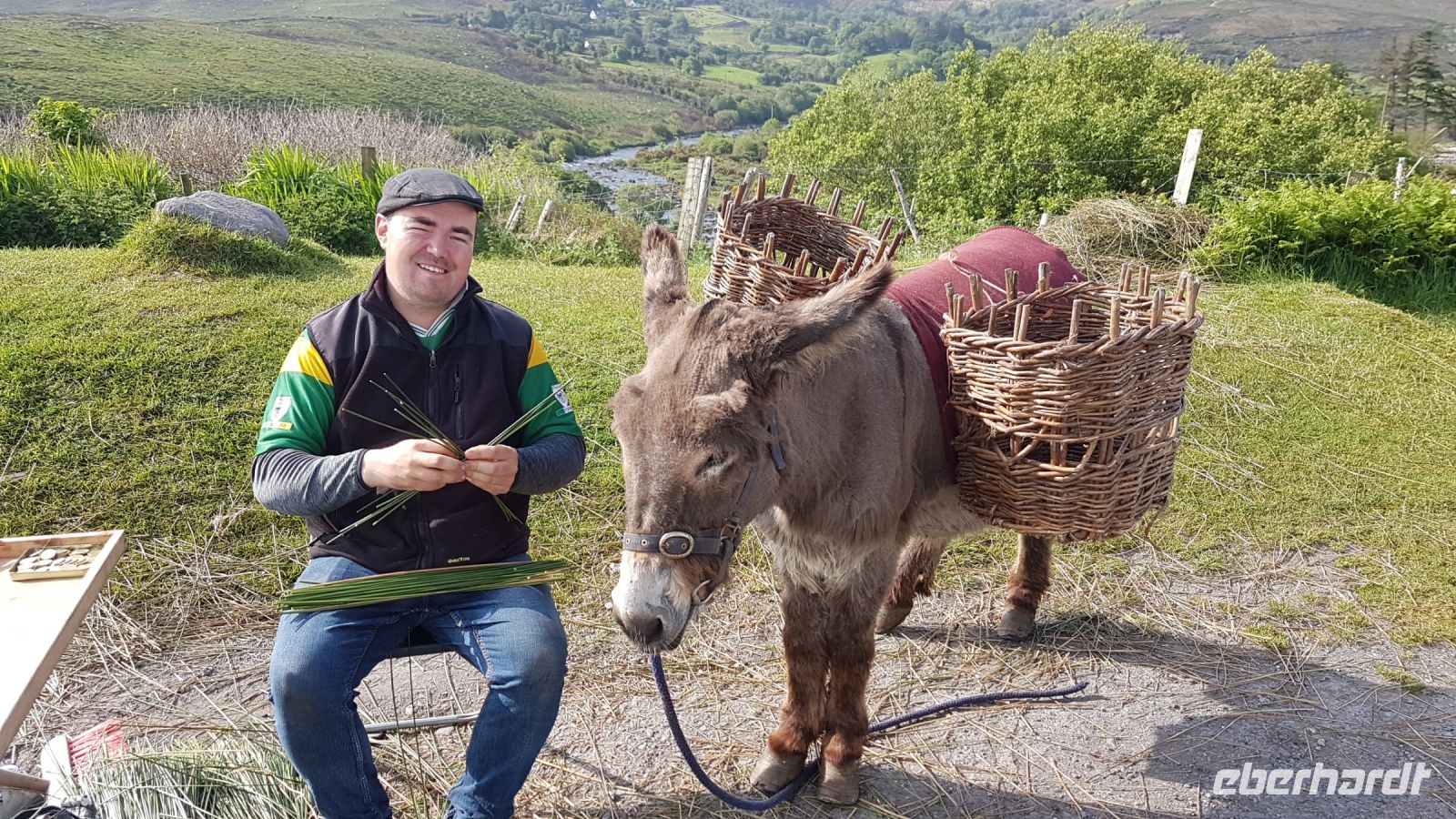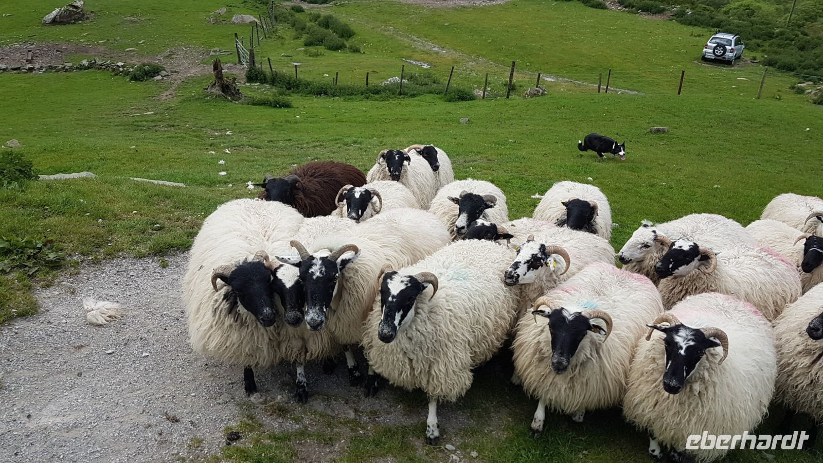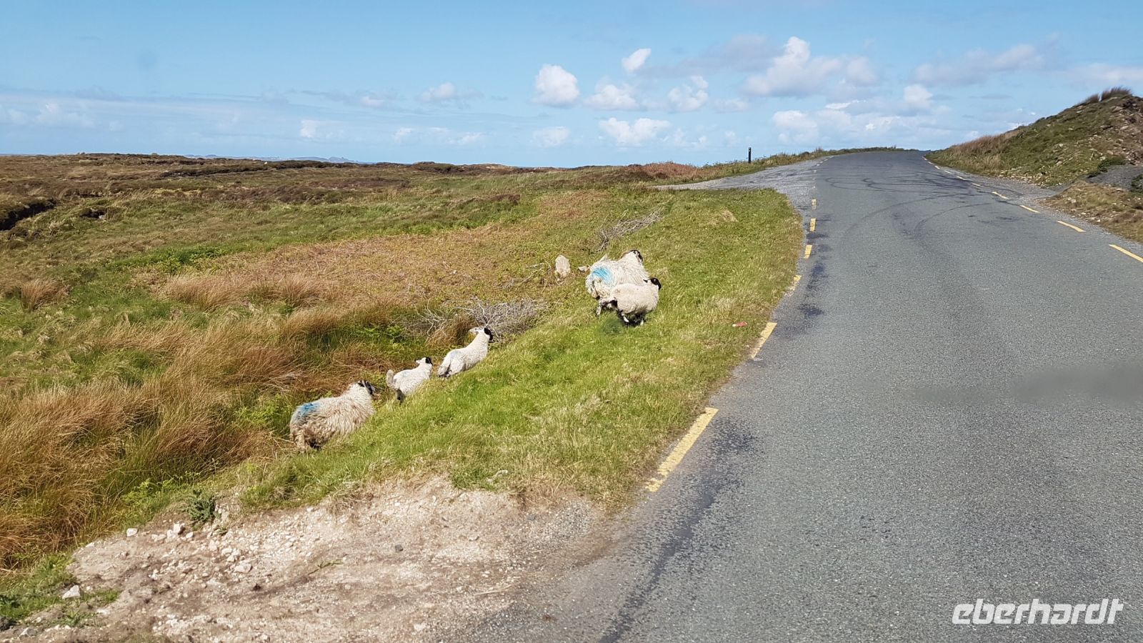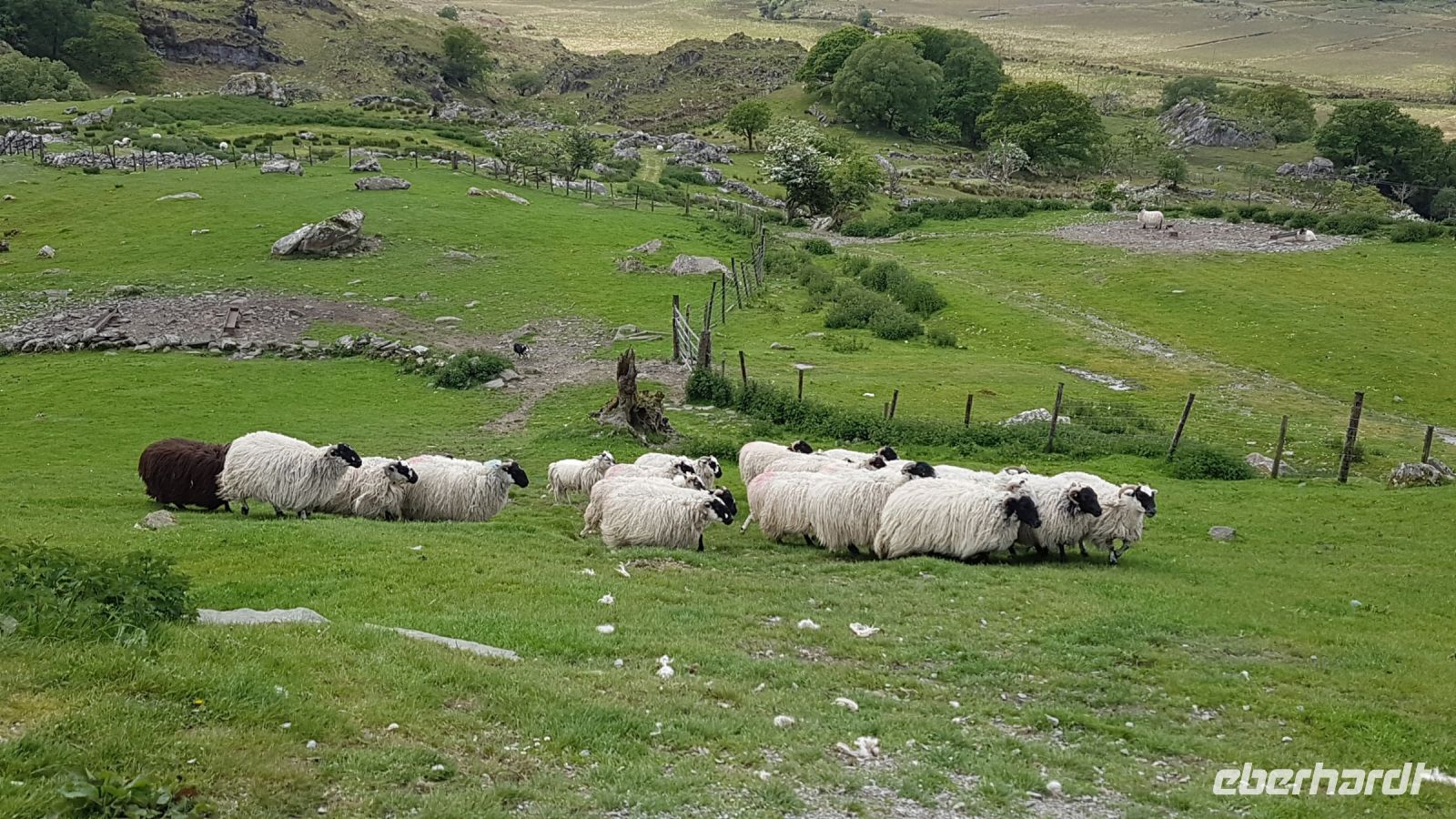 Auf unserem weiteren Weg entlang des Rings of Kerry genossen wir den ein oder anderen wunderbaren Blick über eine Bucht im Atlantik. Unsere Mittagspause verbrachten wir in Sneem. Das ist ein farbenfroh gestaltetes Dorf mit zahlreichen hübschen Geschäften und Cafés. Der Ort ist zweigeteilt durch einen Fluss, über den eine schöne alte Steinbrücke führt. Der nächste Programmpunkt heute war der Besuch der Kissane Schaffarm. Bei einer Vorführung demonstrierte uns der Schäfer, wie ein Bordercollie eine Gruppe Schafe in die gewünschte Richtung treiben kann. Wir erfuhren viele interessante Details aus der Arbeit des Schäfers. Beim letzten Fotostop am Ladies View hatten wir einen herrlichen Ausblick auf die Seen im Killarney Nationalpark. In diesem Park befinden sich zahlreiche alte Eichenbäume.
