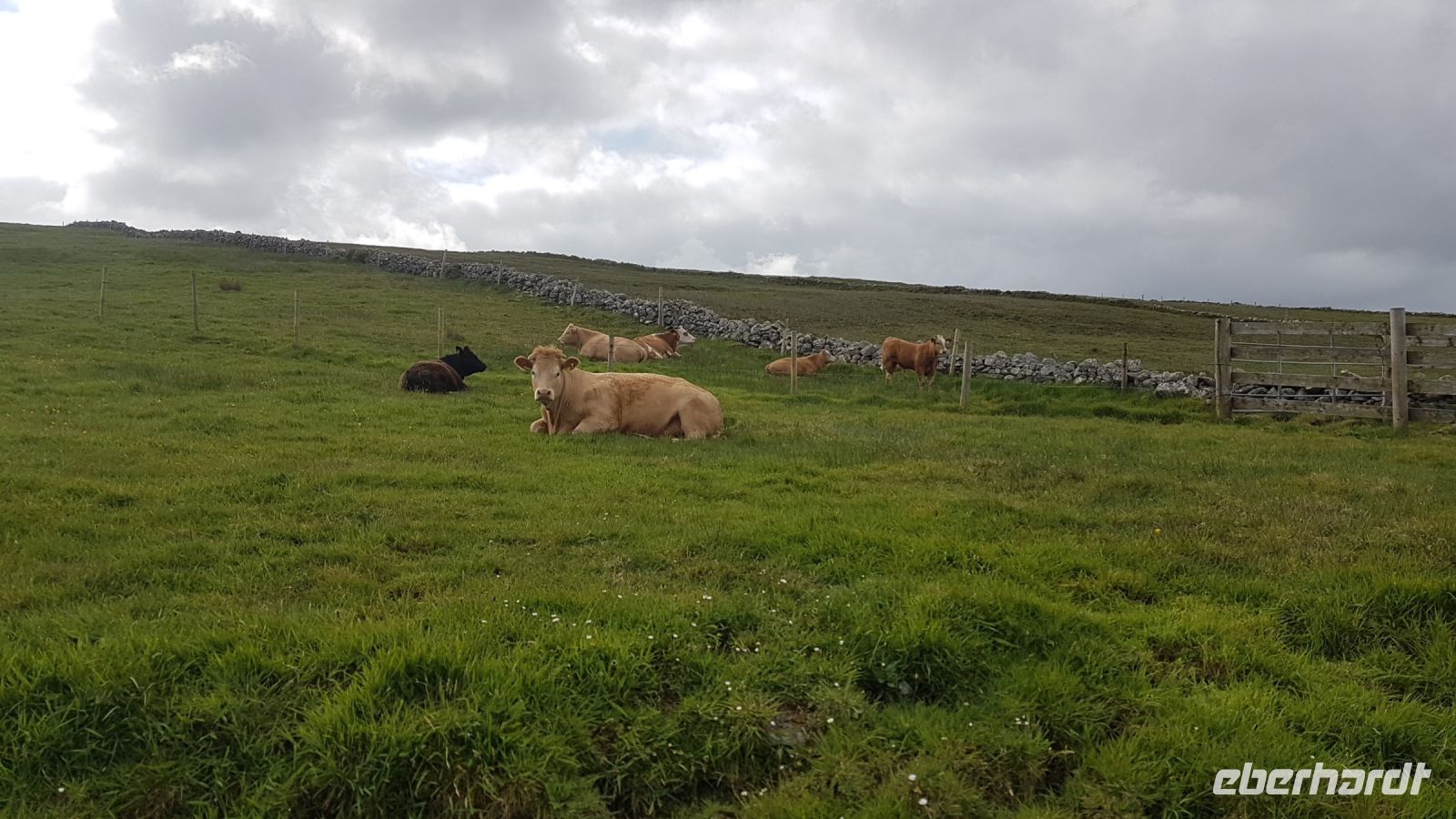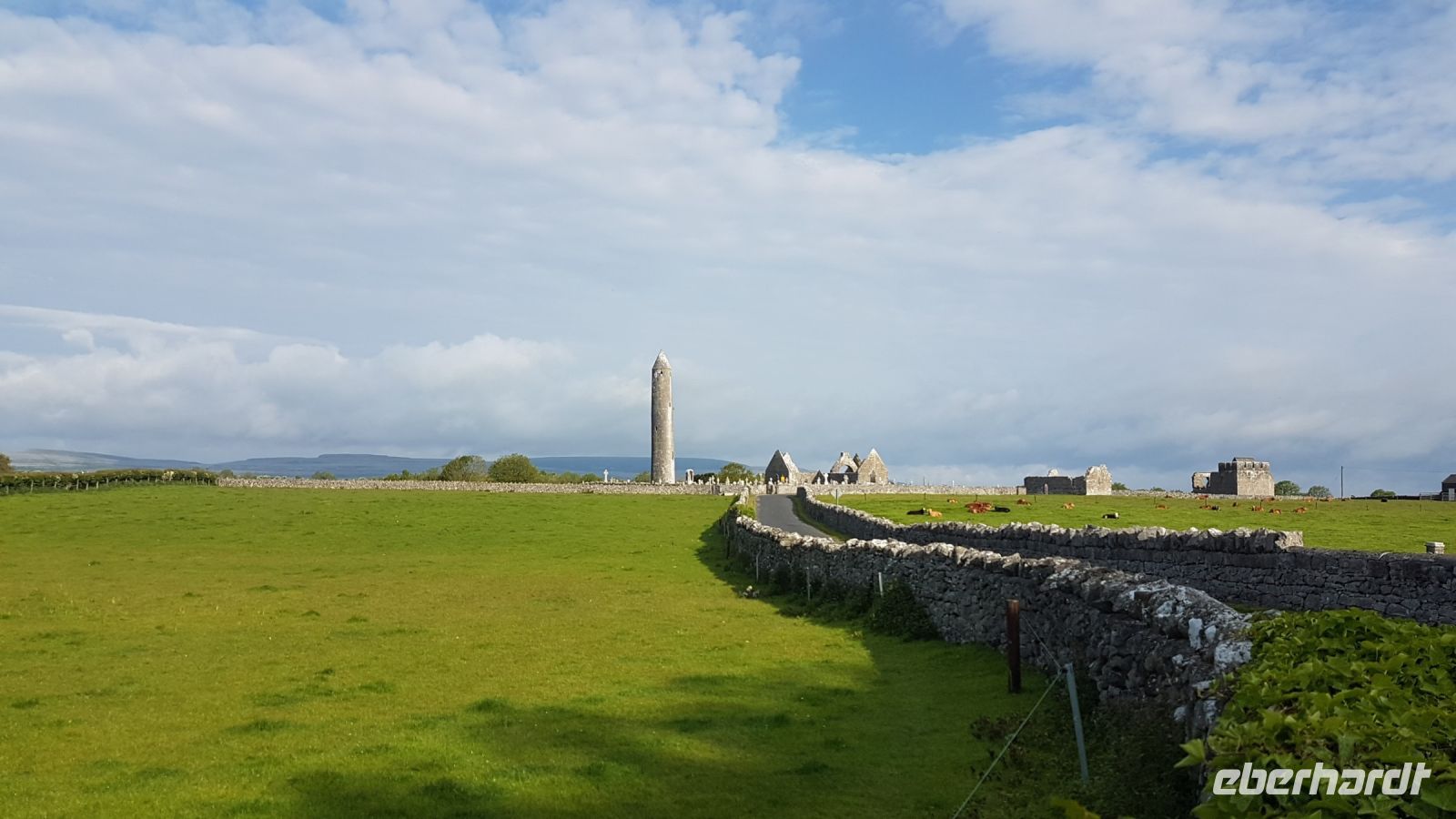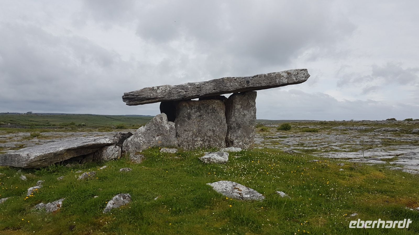 Der Morgen empfing uns mit Sonnenschein, wir verließen Gort und fuhren in Richtung Westen, um zum Burren zu gelangen. Der Burren ist eine Karstlandschaft. Flache Kalksteinplatten bedecken das Gelände, manchmal hatten wir das Gefühl, in einer Mondlandschaft zu stehen. Prähistorische Monumente gibt es zahlreich in dieser einzigartigen Gegend. So hielten wir an am sogenannten Mühlsteintor, dem Poulnabrone Dolmen mitten im Burren. Wir staunten über die frühzeitlichen Menschen, die dieses Steingebilde vor etwa fünfeinhalb Tausend Jahren errichtet haben sollen.