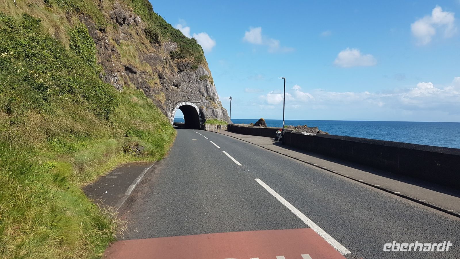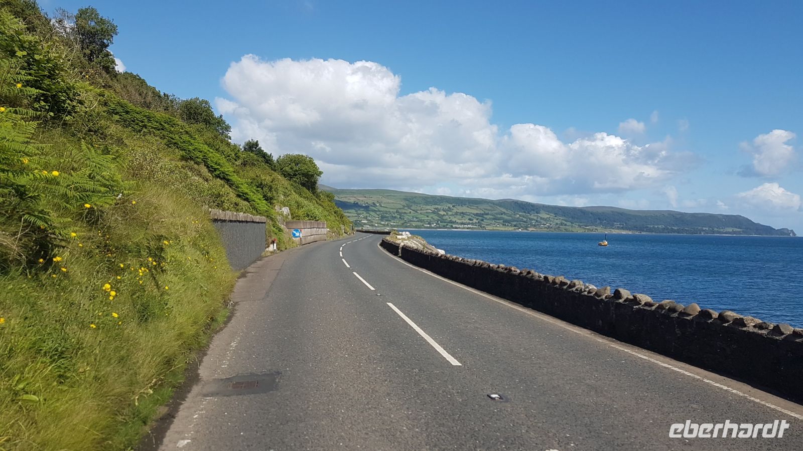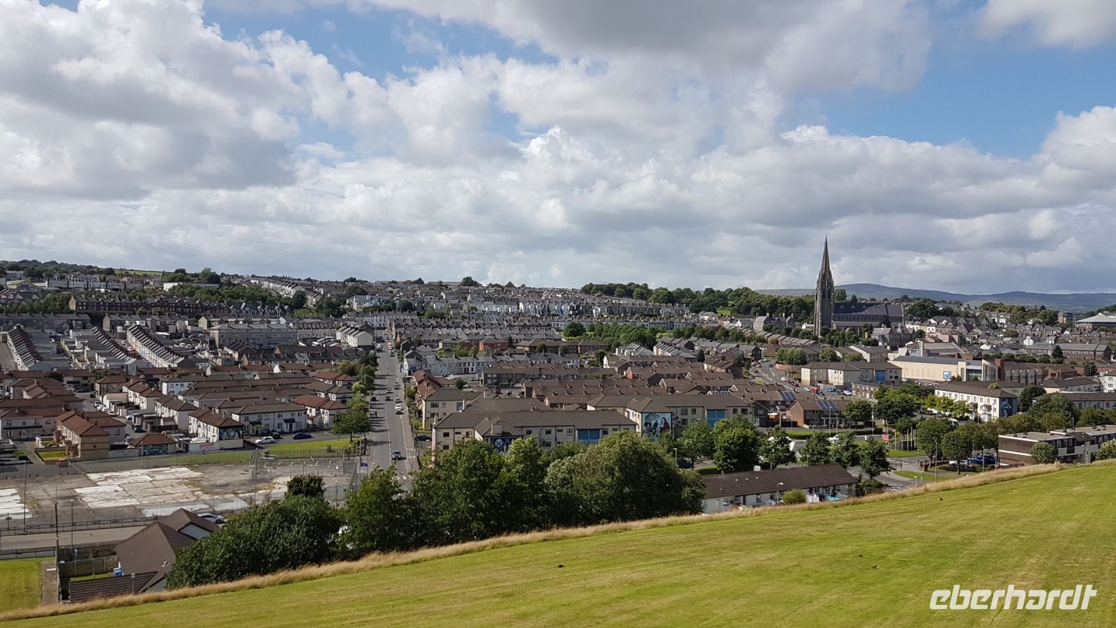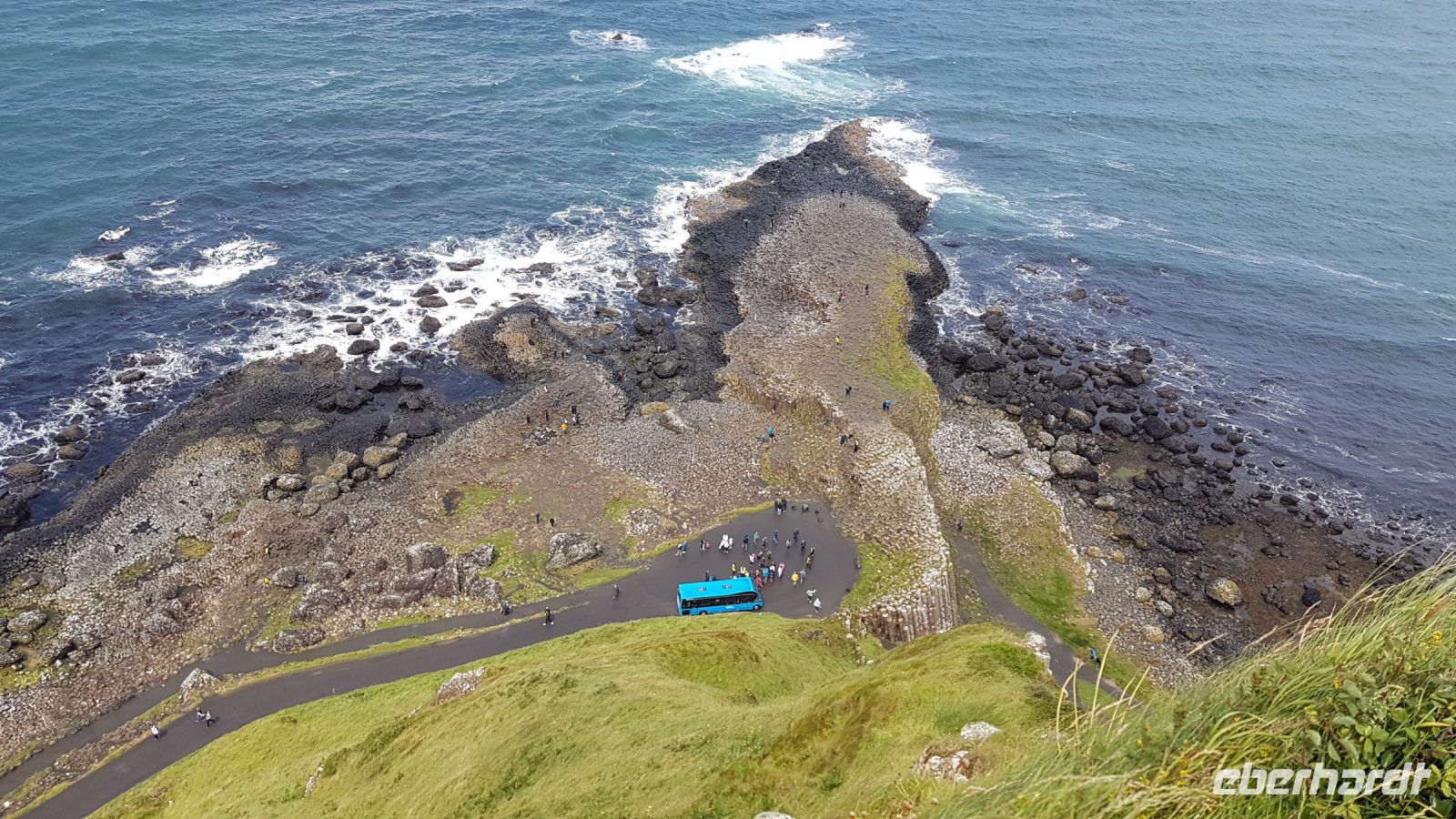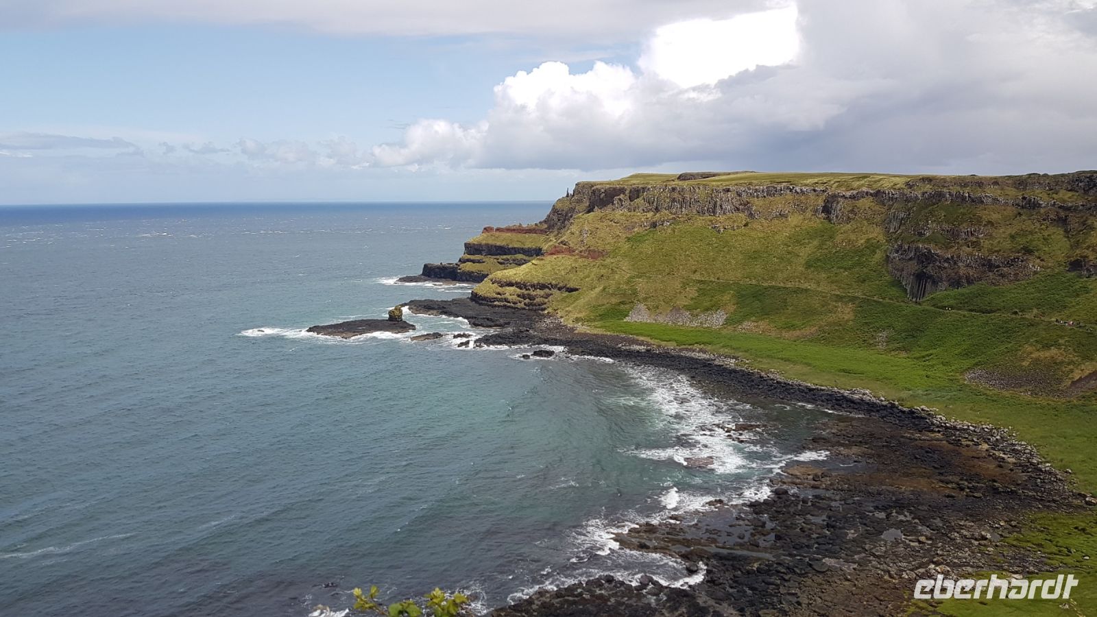 Nicht lange nach unserer Abfahrt vom Hotel erreichten wir Carrickfergus. Hier stoppte unser Bus für ein paar schöne Fotos vom Castle im Ort, das sich an einem kleinen Hafen befindet. Danach begann unsere herrliche Fahrt entlang der Antrim Coast Road. Das ist eine Küstenstraße, die uns an Sandstränden, Klippen und vom Meer umtosten Felsen entlang führt. In Carnlough legten wir einen Stopp ein und fotografierten den kleinen Hafen. Bald erreichten wir eine der bekanntesten Sehenswürdigkeiten Nordirlands. Am Giant's Causeway besuchten wir die vor 60 Millionen Jahren entstandenen zumeist sechseckigen Basaltsäulen. Wir kletterten auf diesem Wunder der Natur umher, das seit 1986 zum Unesco Weltkulturerbe gehört. Während unseres Aufenthaltes hier erwischte uns ein heftiger aber kurzer Regenguss. Glücklicherweise kam die Sonne danach wieder hervor und trocknete unsere nasse Kleidung. Am Nachmittag bestiegen wir wieder unseren Bus und fuhren dann nach Derry / Londonderry, die letzte Stadt in Nordirland, bevor wir wieder in die Republik Irland hereinfahren würden. In dieser Stadt sind die blutigen Konflikte zwischen Protestanten und Katholiken noch gut in Erinnerung, zahlreiche Wandbilder und auch Monumente erinnern an diese schreckliche Zeit. Aber Derry / Londonderry heißt auch The Walled Town, weil das Zentrum komplett von einer noch intakten Stadtmauer eingeschlossen wird. Wir stiegen hinauf auf die Mauer und spazierten auf ihr entlang. Den Abend verbrachten wir im Station House Hotel in Letterkenny.