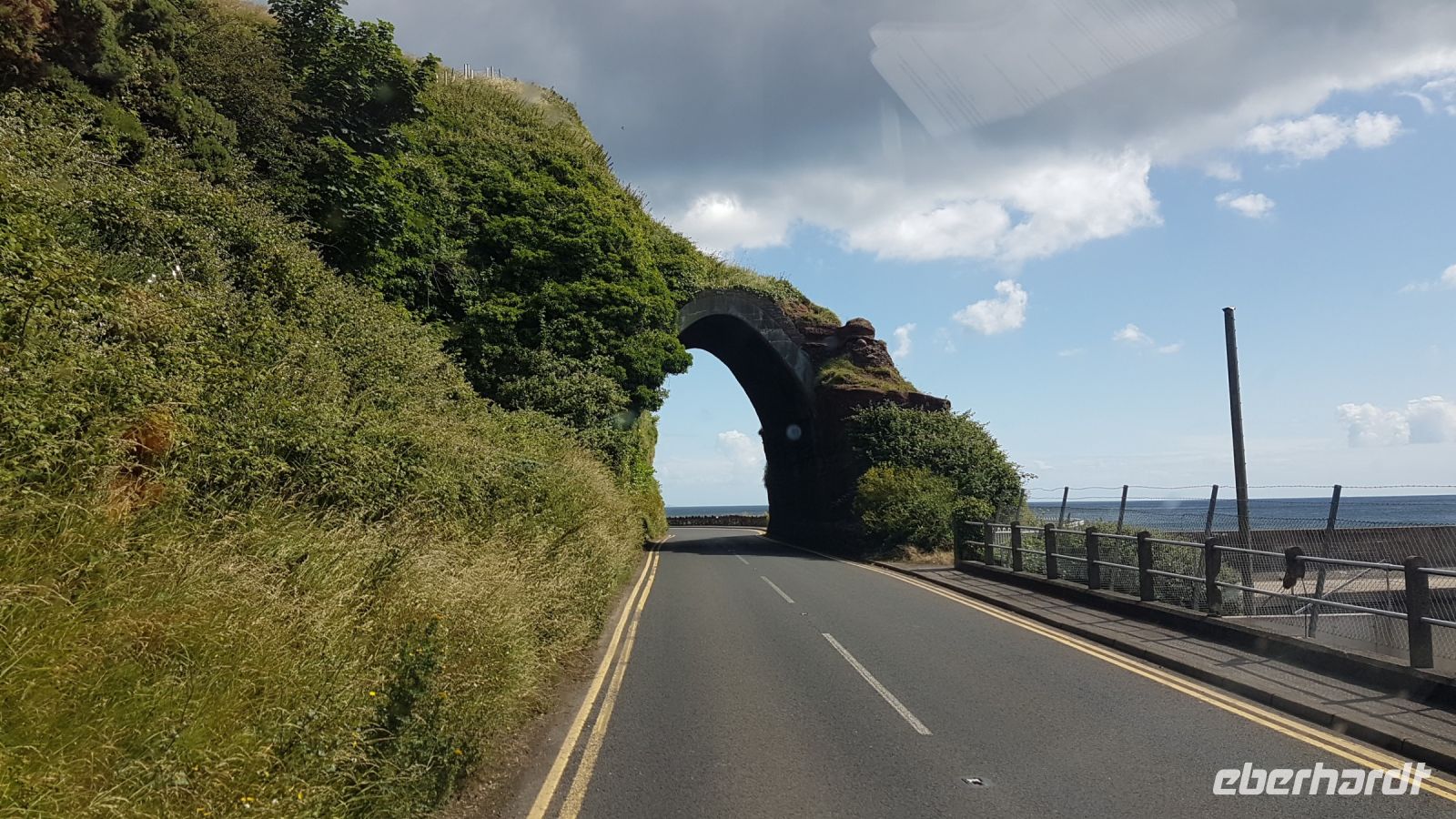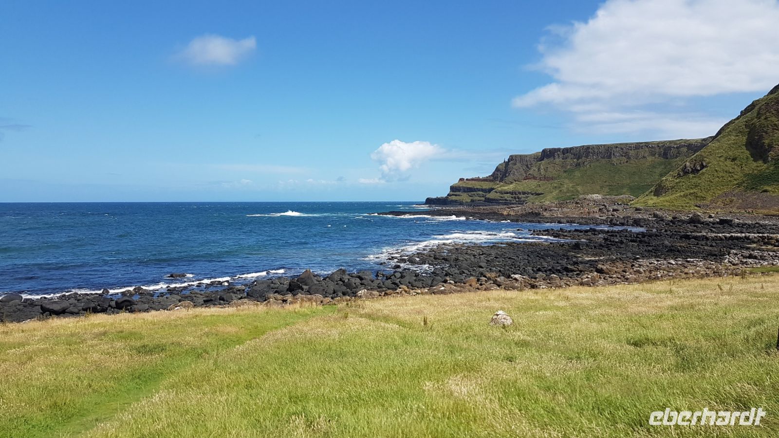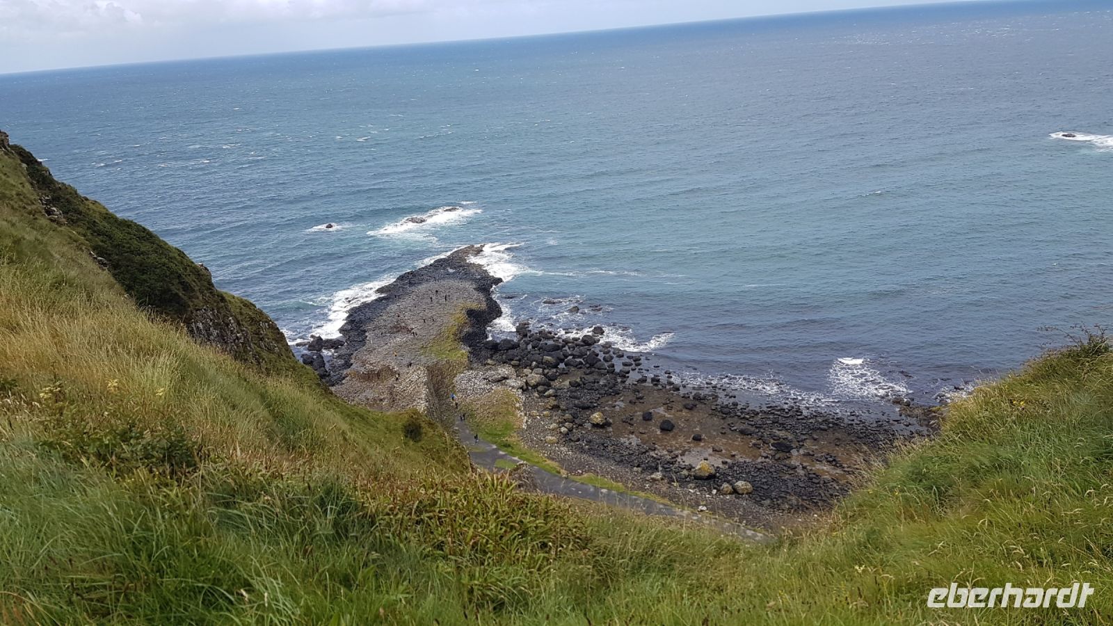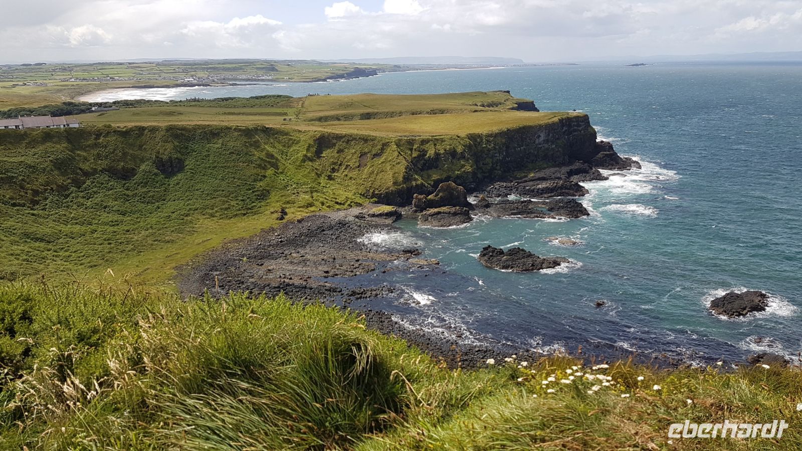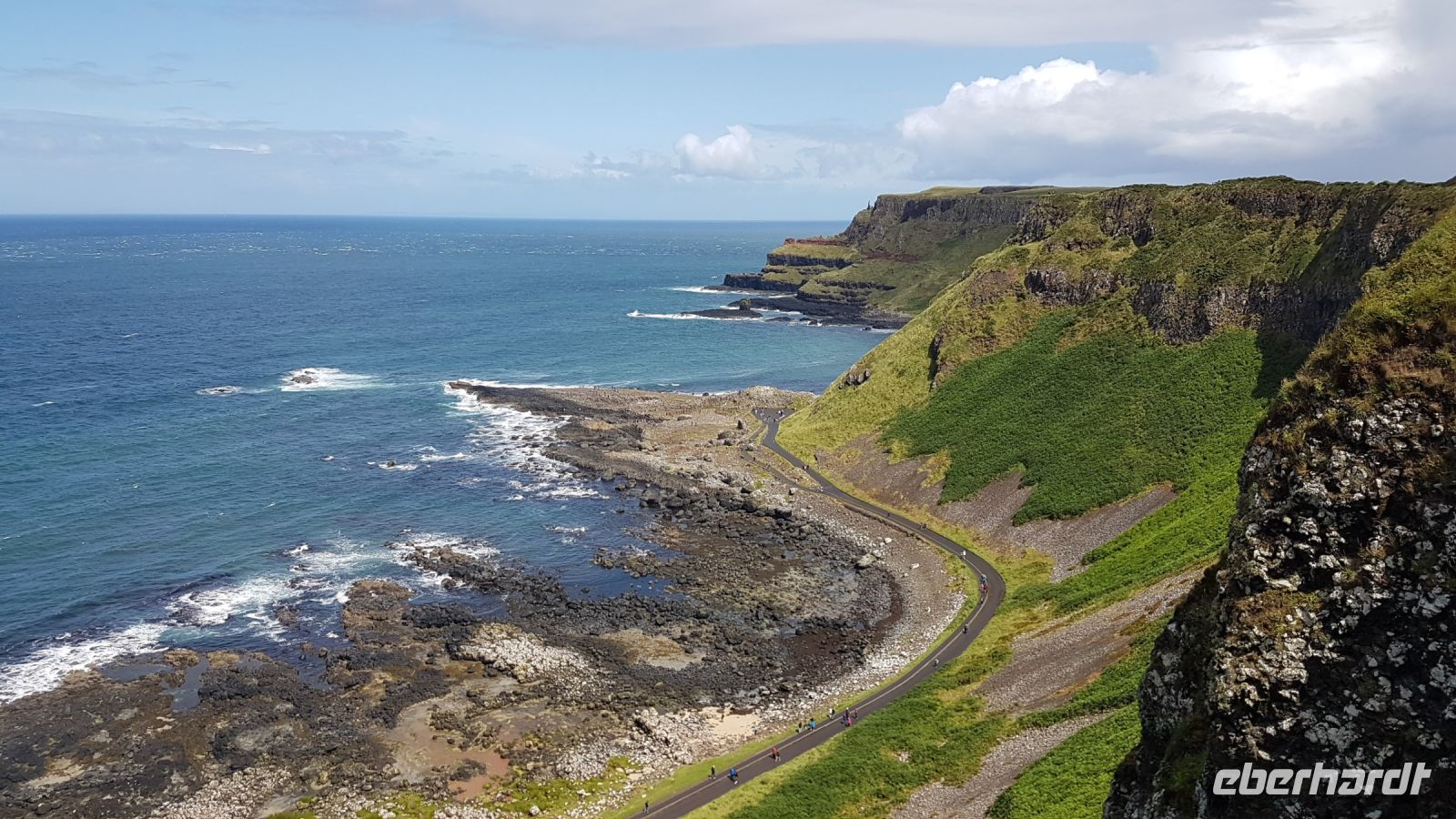 Nicht lange nach unserer Abfahrt vom Hotel erreichten wir Carrickfergus. Hier stoppte unser Bus für ein paar schöne Fotos vom Castle im Ort, das sich an einem kleinen Hafen befindet. Danach begann unsere herrliche Fahrt entlang der Antrim Coast Road. Das ist eine Küstenstraße, die uns an Sandstränden, Klippen und vom Meer umtosten Felsen entlang führt. In Carnlough legten wir einen Stopp ein und fotografierten den kleinen Hafen. Bald erreichten wir eine der bekanntesten Sehenswürdigkeiten Nordirlands. Am Giant's Causeway besuchten wir die vor 60 Millionen Jahren entstandenen zumeist sechseckigen Basaltsäulen. Wir kletterten auf diesem Wunder der Natur umher, das seit 1986 zum Unesco Weltkulturerbe gehört. Während unseres Aufenthaltes hier erwischte uns ein heftiger aber kurzer Regenguss. Glücklicherweise kam die Sonne danach wieder hervor und trocknete unsere nasse Kleidung. Am Nachmittag bestiegen wir wieder unseren Bus und fuhren dann nach Derry / Londonderry, die letzte Stadt in Nordirland, bevor wir wieder in die Republik Irland hereinfahren würden. In dieser Stadt sind die blutigen Konflikte zwischen Protestanten und Katholiken noch gut in Erinnerung, zahlreiche Wandbilder und auch Monumente erinnern an diese schreckliche Zeit. Aber Derry / Londonderry heißt auch The Walled Town, weil das Zentrum komplett von einer noch intakten Stadtmauer eingeschlossen wird. Wir stiegen hinauf auf die Mauer und spazierten auf ihr entlang. Den Abend verbrachten wir im Station House Hotel in Letterkenny.