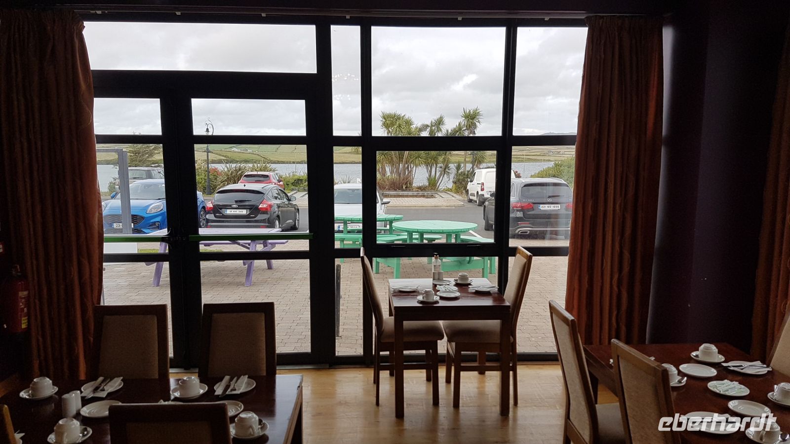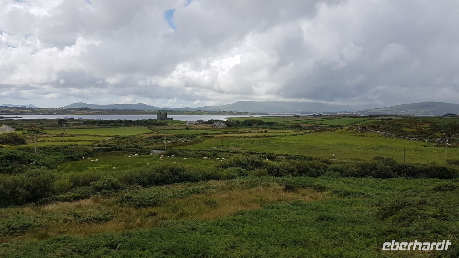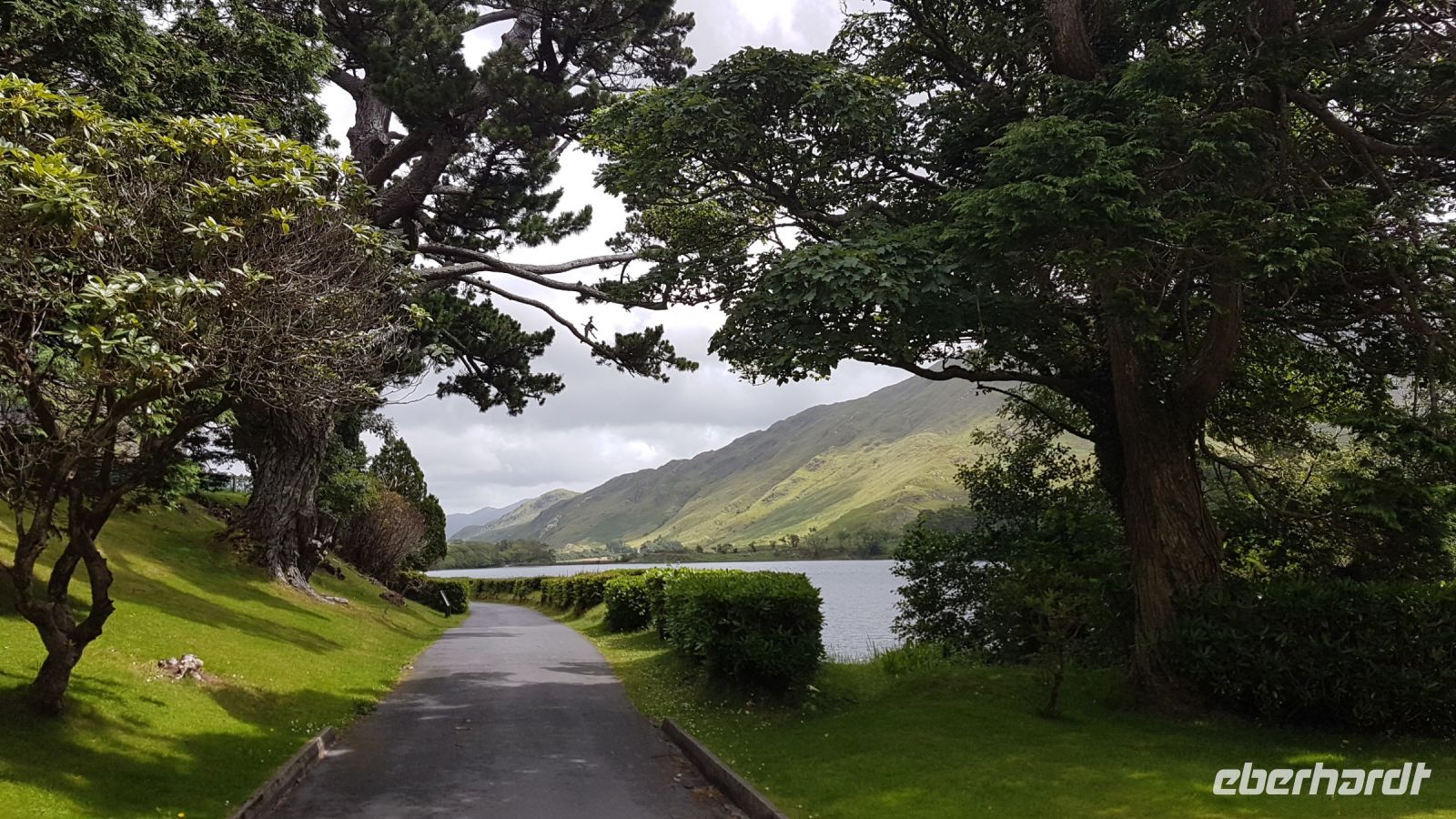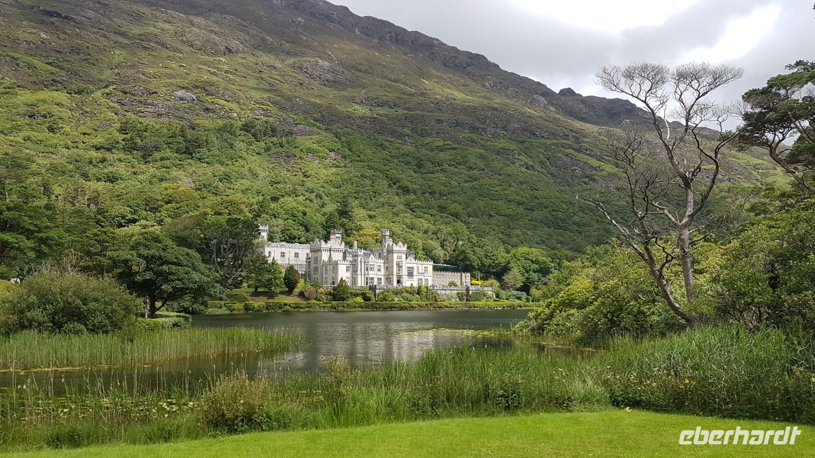 Heute erwartete uns ein Tag mit atemberaubender Landschaft. Doch am Morgen mussten wir zunächst feststellen, dass im Hotel der Strom ausgefallen war, und das nicht nur im Haus, sondern in der ganzen Gegend. In der Nacht hatte es gestürmt, und so waren wohl Teile des lokalen Stromnetzes beschädigt worden. Nach einem „kalten“ Frühstück ohne Kaffee, brachen wir dennoch wie geplant auf. Aber unser erster Halt führte uns in Salthill in ein Café, wo wir von unserer Reiseleiterin Connie erfuhren, dass uns Eberhardt TRAVEL auf unseren Morgenkaffee einlädt. So verbrachten wir eine gemütliche Pause mit Blick auf die Galway Bucht bei Kaffee, Cappuccino, Tee und anderen Getränken. Frisch gestärkt nach dieser Pause bestiegen wir wieder unseren Bus. Nicht weit mussten wir fahren und erreichten Connemara. Weite Gletschertäler werden umrahmt von mächtigen Bergen, die sich in den zahlreichen malerischen Seen spiegeln. An mehreren Stellen hielt unser Bus, damit wir besonders schöne Fotos von dieser beeindruckenden Landschaft machen konnten. Am Mittag erreichten wir schließlich Kylemore Abbey nicht weit vom Nationalpark Connemara entfernt. Das heutige Benediktinerinnenkloster war einst als Schloss direkt an einem Seeufer errichtet worden. Die Lage des Anwesens ist traumhaft. Wir genossen die herrlichen Ausblicke in eine atemberaubende Landschaft und einen Spaziergang im viktorianischen Walled Garden. Im Souvenirgeschäft werden auch Produkte aus hauseigener Herstellung angeboten, zum Beispiel Seifen und Schokolade. Am Abend ließen wir uns in unserem Hotel in Gort das Abendessen gemeinsam schmecken, danach bekamen alle als weitere kleine Geste wegen des Stromausfalls am Morgen einen Irish Coffee von unserem Reiseveranstalter spendiert.