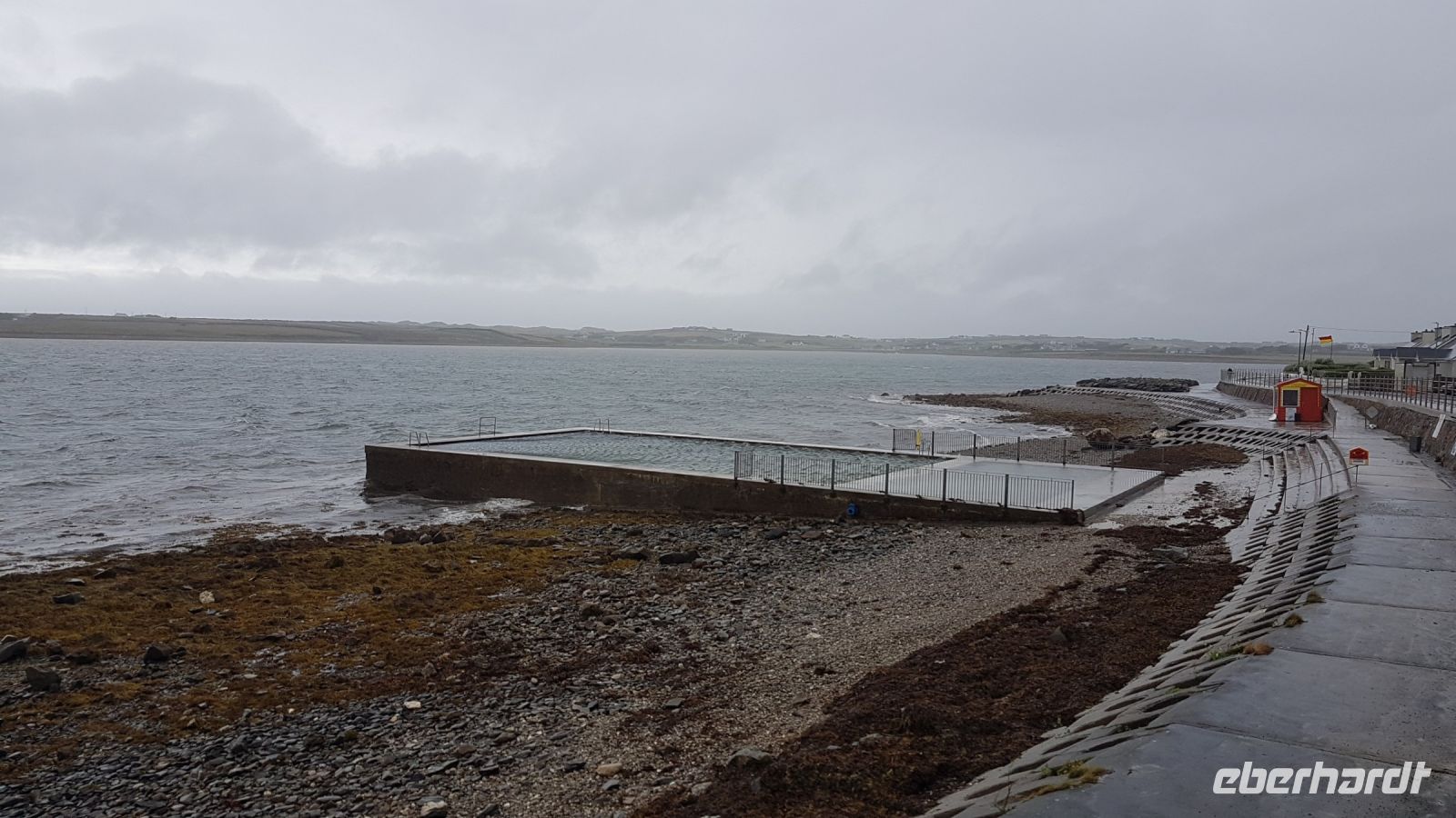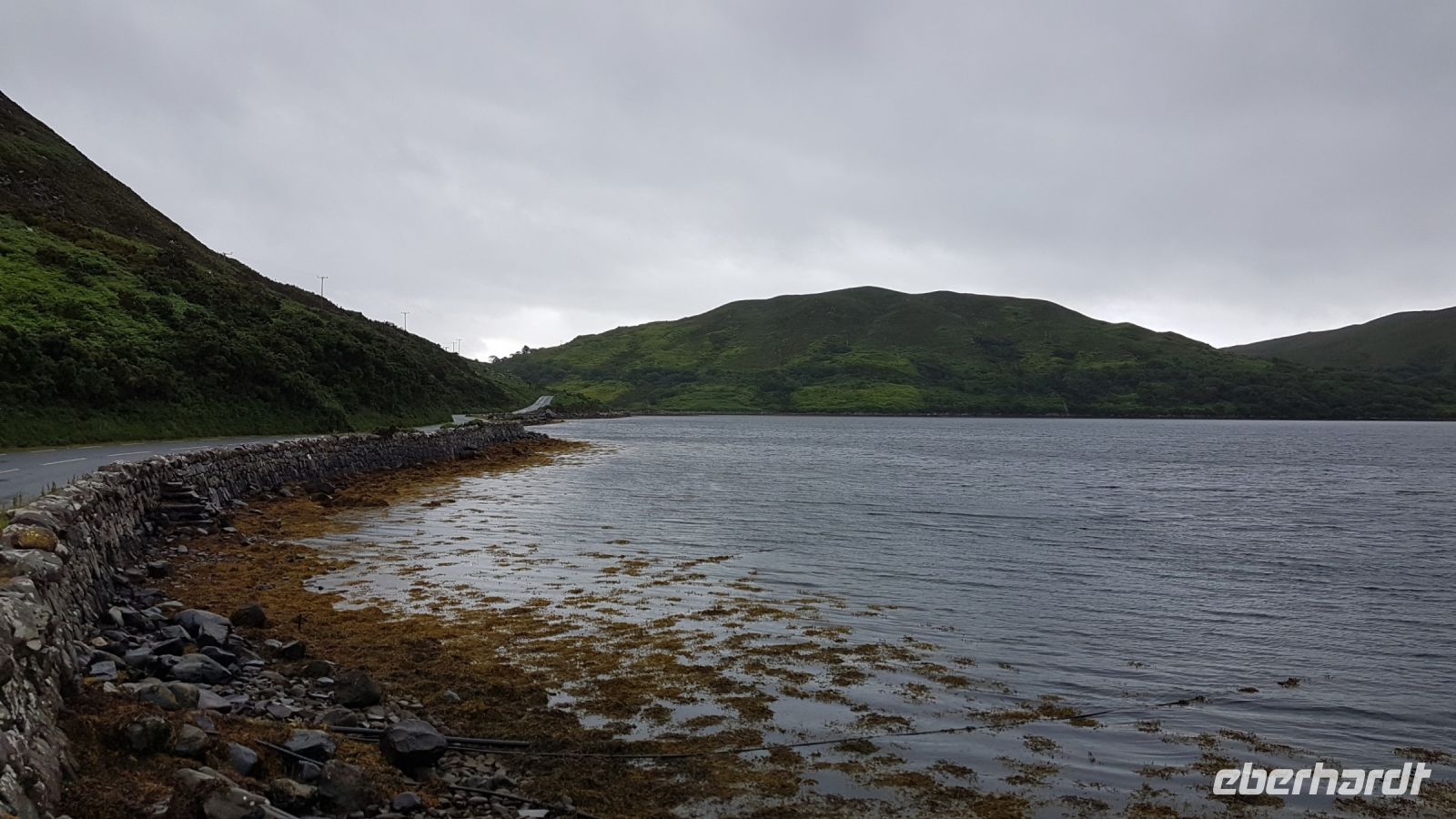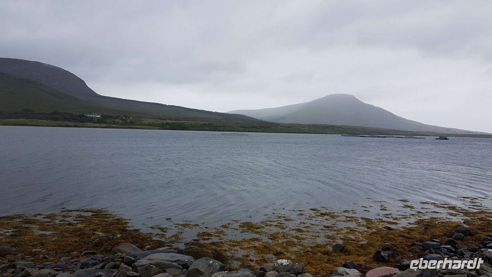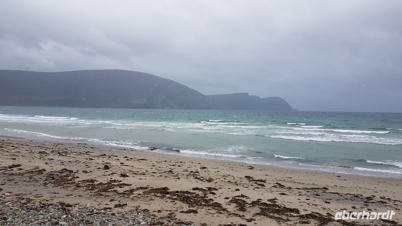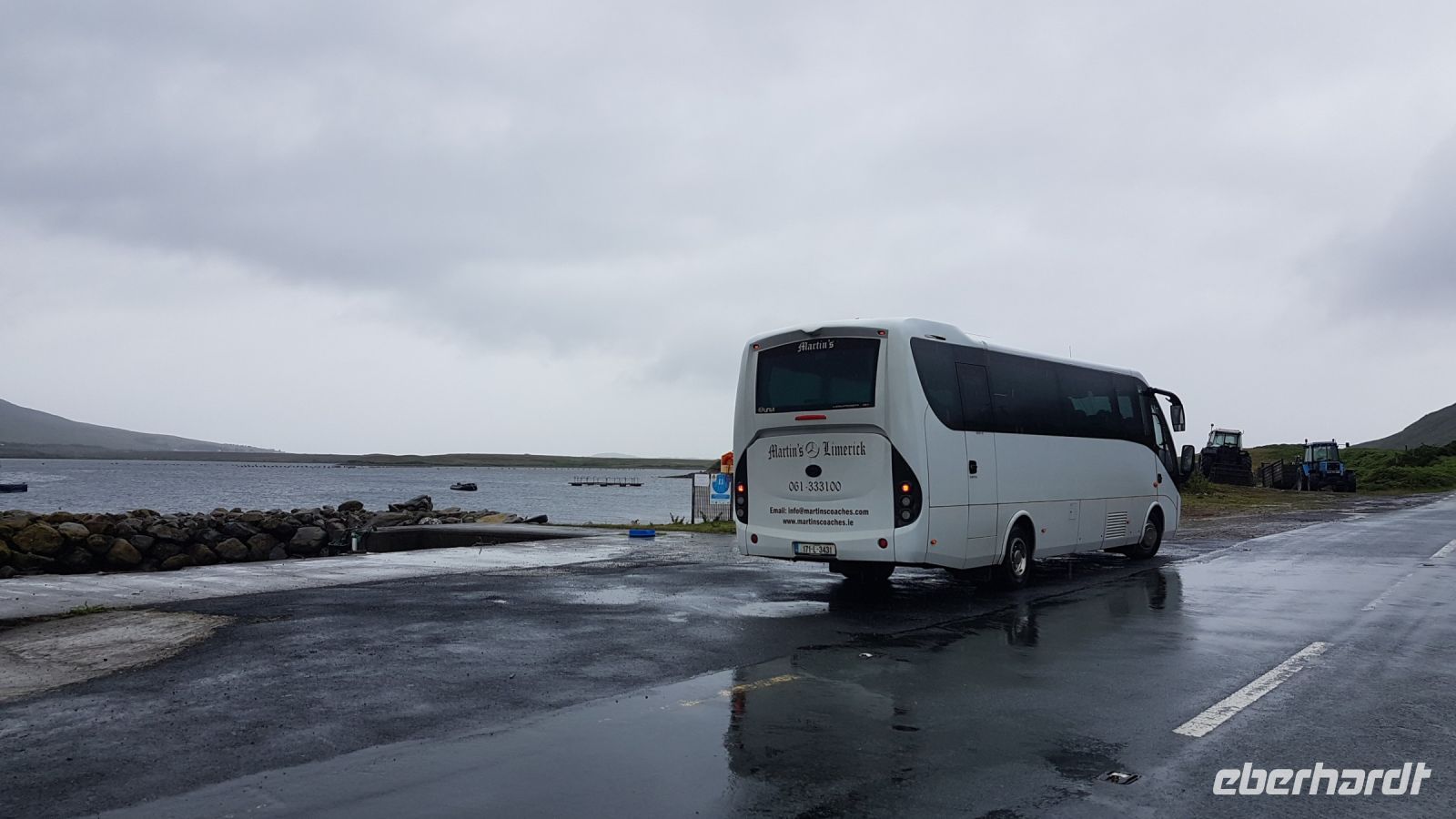 Bei Regenwetter brachen wir auf, um recht bald Achill Island zu erreichen, die größte Insel der Republik Irland. In Keel stiegen wir aus am Beehave Cafe, um dem Regen zu entkommen. Leider riss der Himmel erst am späten Nachmittag auf und der Regen begleitete uns den ganzen Tag über, so dass wir nur kurz den breiten Strand von Keel besuchen konnten. Als wir Keel verlassen wollten, mussten wir feststellen, dass unser Bus nicht mehr anspringen wollte. Nach einiger Wartezeit kam ein Mechaniker von einer lokalen Werkstatt und gab uns erst einmal Anlasshilfe. Unterwegs machten wir weitere Stops für Fotos und besuchten das Ballycroy Nationalparkzentrum. Hier erfuhren wir viele interessante Details zum Hochmoor hier, das zu den wenigen erhaltenen in Europa zählt. Auf dem Weg zum Hotel wurde unser Bus in Bangor für eine genauere Untersuchung in einer Werkstatt vorgestellt, wir besuchten während dessen den lokalen Pub The West End Bar, tranken das ein oder andere Guinness oder Tee mit Rum. Den restlichen Nachmittag hatten wir Freizeit, von unserem Broadhaven Hotel aus konnten wir einen Spaziergang zum kleinen Ortszentrum von Belmullet unternehmen oder eine lokale Besonderheit besichtigen: einen Tide-Pool direkt am Ufer des Atlantik. Den Abend verbrachten wir wieder bei einem gemeinsamen Abendessen in unserem Hotel.