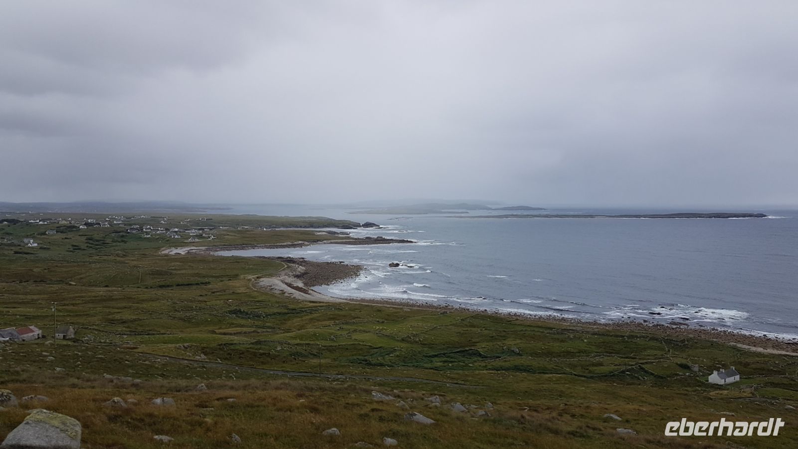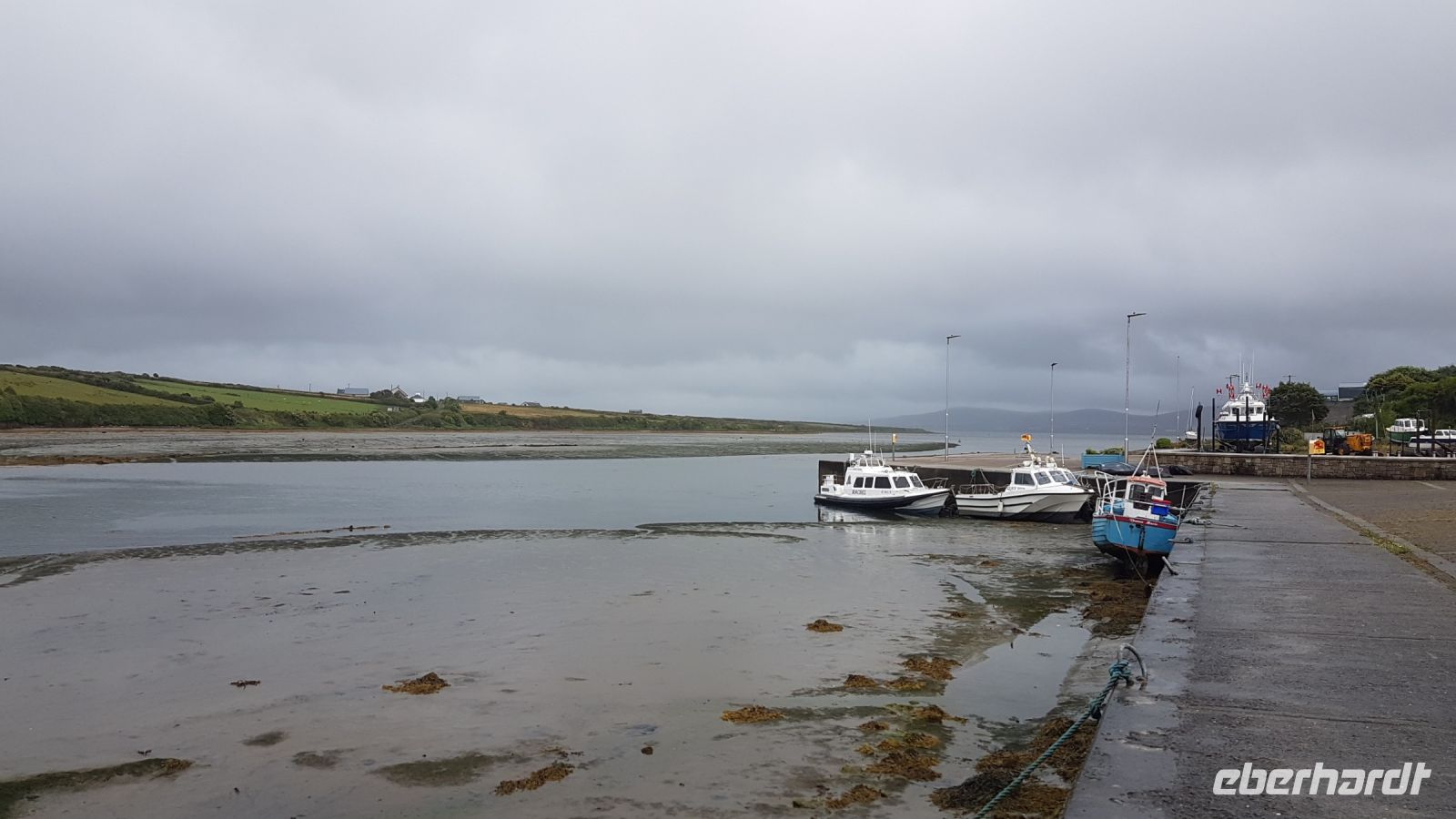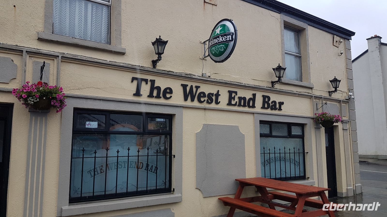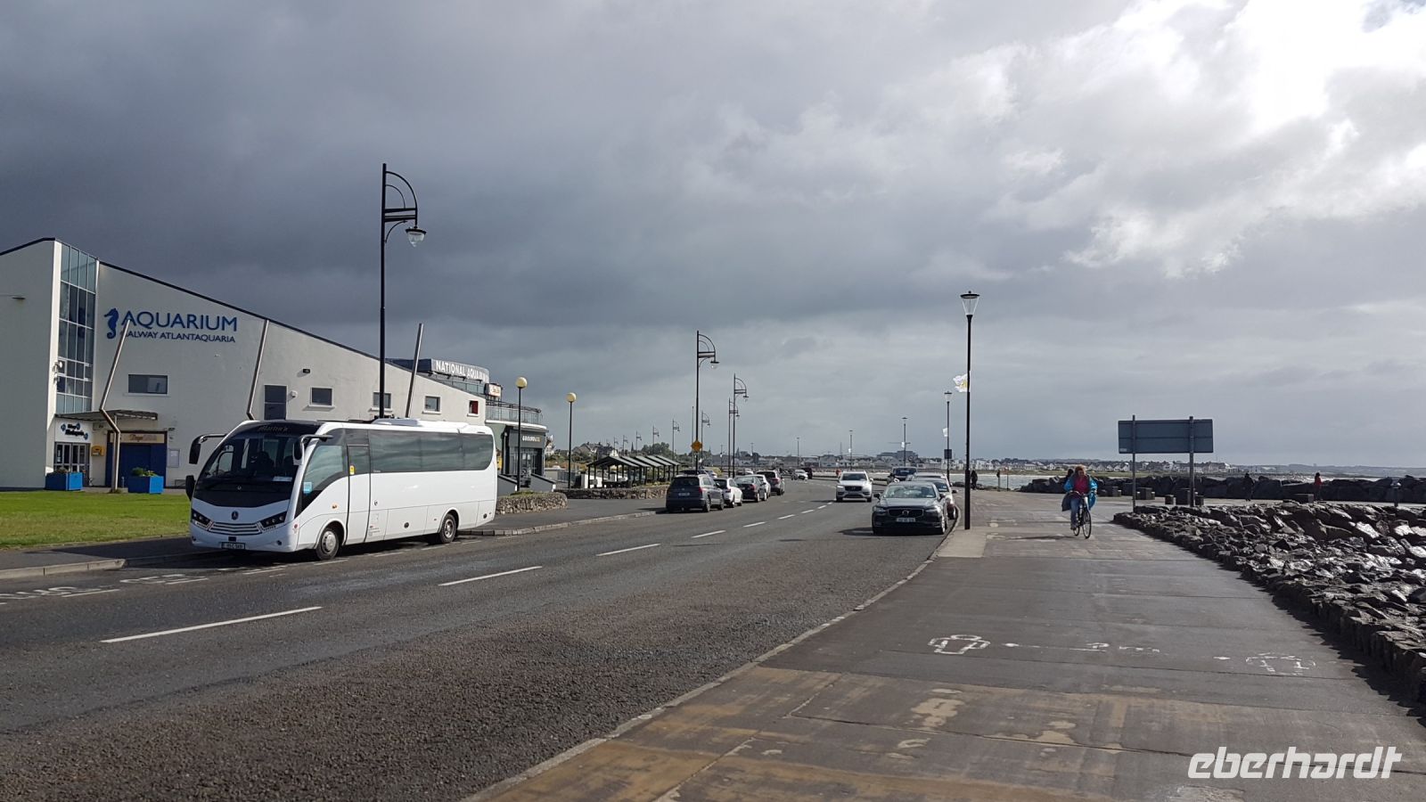 Bei Regenwetter brachen wir auf, um recht bald Achill Island zu erreichen, die größte Insel der Republik Irland. In Keel stiegen wir aus am Beehave Cafe, um dem Regen zu entkommen. Leider riss der Himmel erst am späten Nachmittag auf und der Regen begleitete uns den ganzen Tag über, so dass wir nur kurz den breiten Strand von Keel besuchen konnten. Als wir Keel verlassen wollten, mussten wir feststellen, dass unser Bus nicht mehr anspringen wollte. Nach einiger Wartezeit kam ein Mechaniker von einer lokalen Werkstatt und gab uns erst einmal Anlasshilfe. Unterwegs machten wir weitere Stops für Fotos und besuchten das Ballycroy Nationalparkzentrum. Hier erfuhren wir viele interessante Details zum Hochmoor hier, das zu den wenigen erhaltenen in Europa zählt. Auf dem Weg zum Hotel wurde unser Bus in Bangor für eine genauere Untersuchung in einer Werkstatt vorgestellt, wir besuchten während dessen den lokalen Pub The West End Bar, tranken das ein oder andere Guinness oder Tee mit Rum. Den restlichen Nachmittag hatten wir Freizeit, von unserem Broadhaven Hotel aus konnten wir einen Spaziergang zum kleinen Ortszentrum von Belmullet unternehmen oder eine lokale Besonderheit besichtigen: einen Tide-Pool direkt am Ufer des Atlantik. Den Abend verbrachten wir wieder bei einem gemeinsamen Abendessen in unserem Hotel.