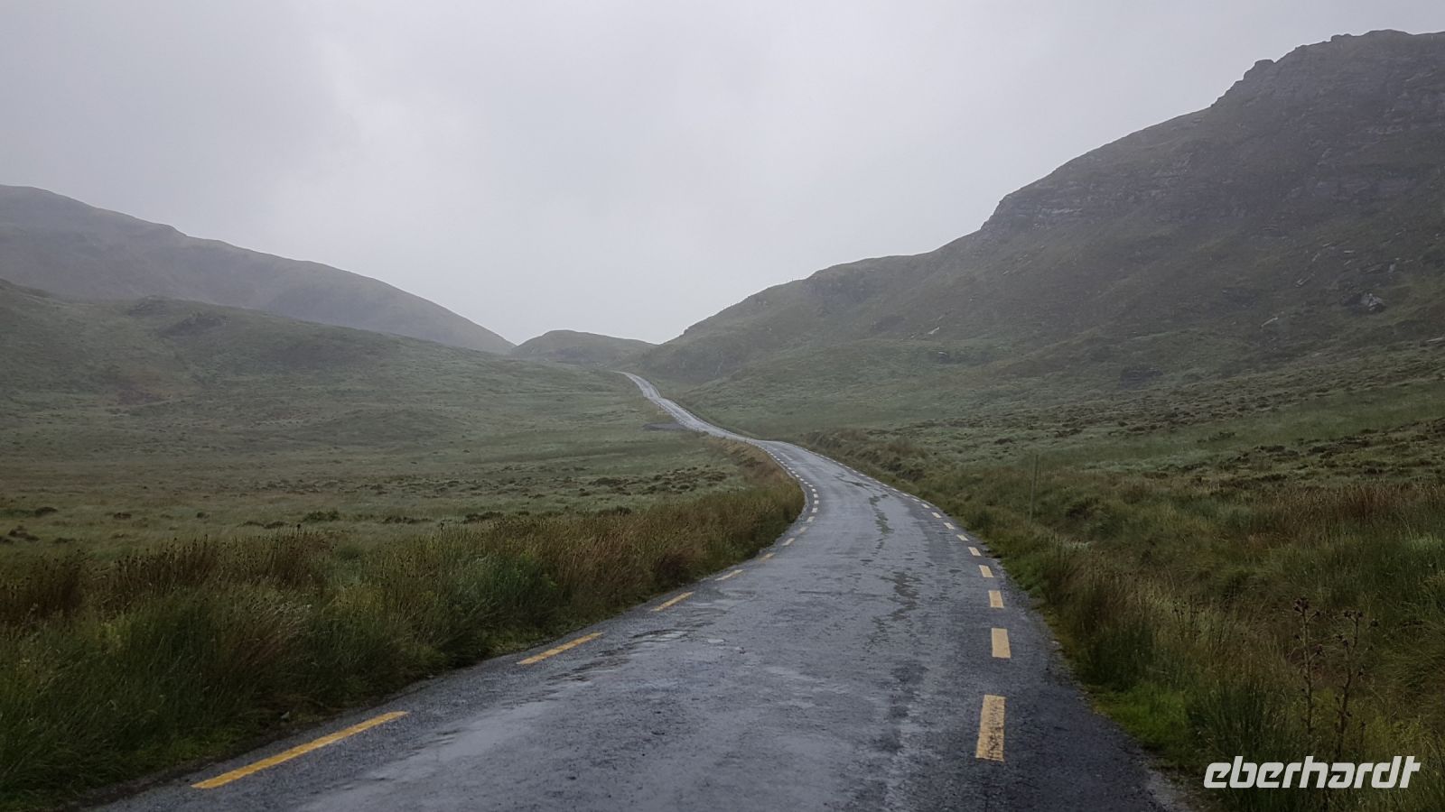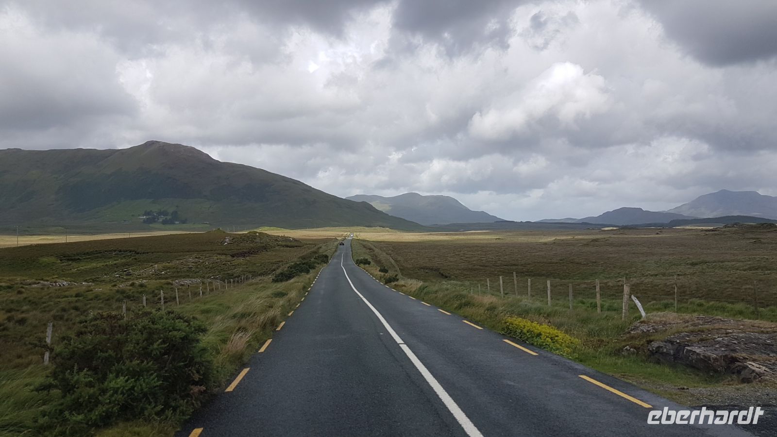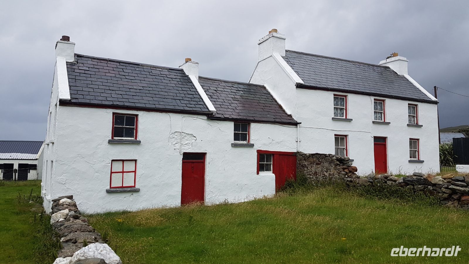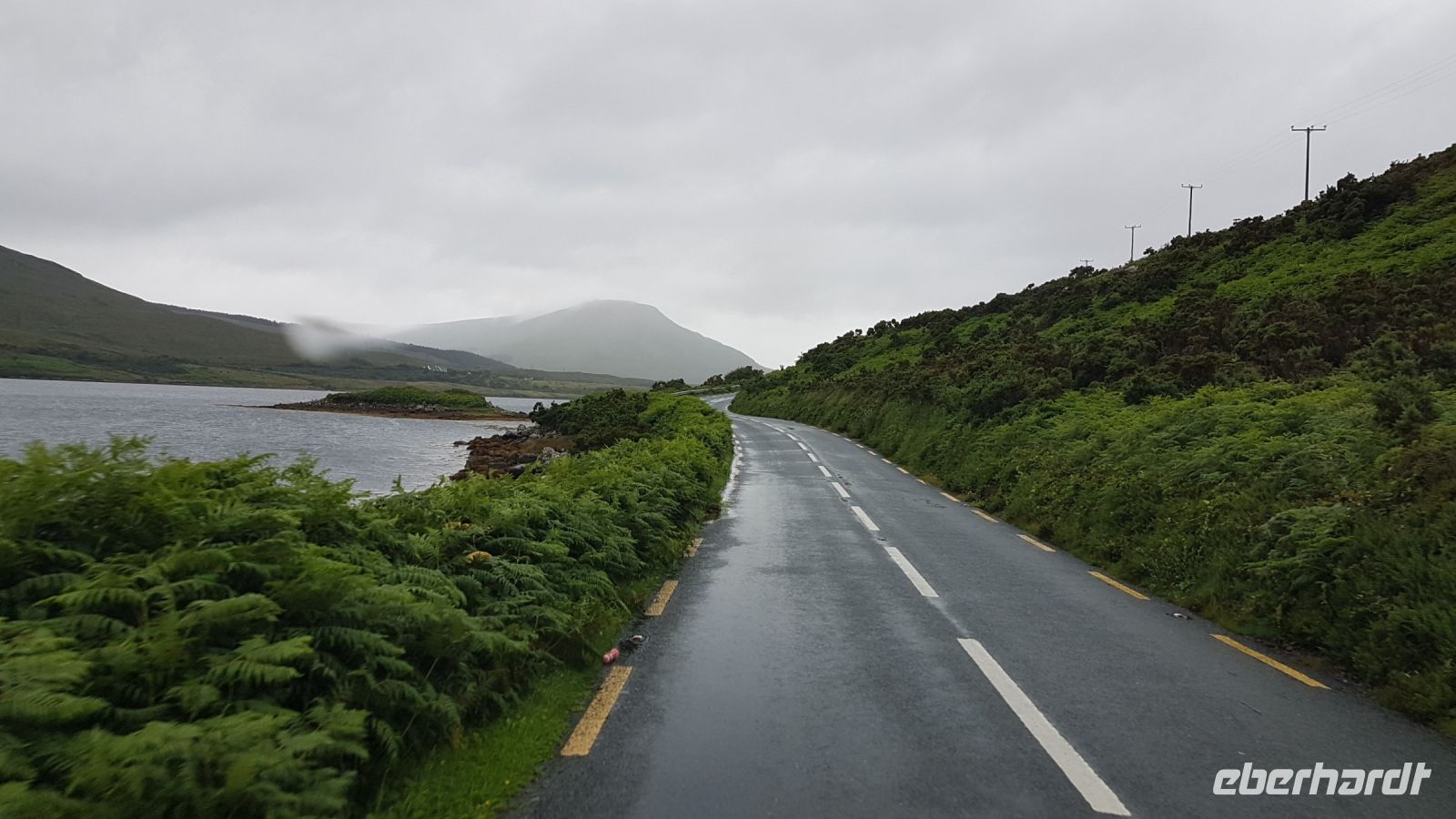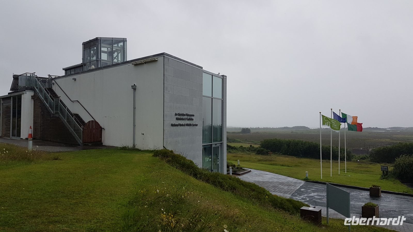 Bei Regenwetter brachen wir auf, um recht bald Achill Island zu erreichen, die größte Insel der Republik Irland. In Keel stiegen wir aus am Beehave Cafe, um dem Regen zu entkommen. Leider riss der Himmel erst am späten Nachmittag auf und der Regen begleitete uns den ganzen Tag über, so dass wir nur kurz den breiten Strand von Keel besuchen konnten. Als wir Keel verlassen wollten, mussten wir feststellen, dass unser Bus nicht mehr anspringen wollte. Nach einiger Wartezeit kam ein Mechaniker von einer lokalen Werkstatt und gab uns erst einmal Anlasshilfe. Unterwegs machten wir weitere Stops für Fotos und besuchten das Ballycroy Nationalparkzentrum. Hier erfuhren wir viele interessante Details zum Hochmoor hier, das zu den wenigen erhaltenen in Europa zählt. Auf dem Weg zum Hotel wurde unser Bus in Bangor für eine genauere Untersuchung in einer Werkstatt vorgestellt, wir besuchten während dessen den lokalen Pub The West End Bar, tranken das ein oder andere Guinness oder Tee mit Rum. Den restlichen Nachmittag hatten wir Freizeit, von unserem Broadhaven Hotel aus konnten wir einen Spaziergang zum kleinen Ortszentrum von Belmullet unternehmen oder eine lokale Besonderheit besichtigen: einen Tide-Pool direkt am Ufer des Atlantik. Den Abend verbrachten wir wieder bei einem gemeinsamen Abendessen in unserem Hotel.