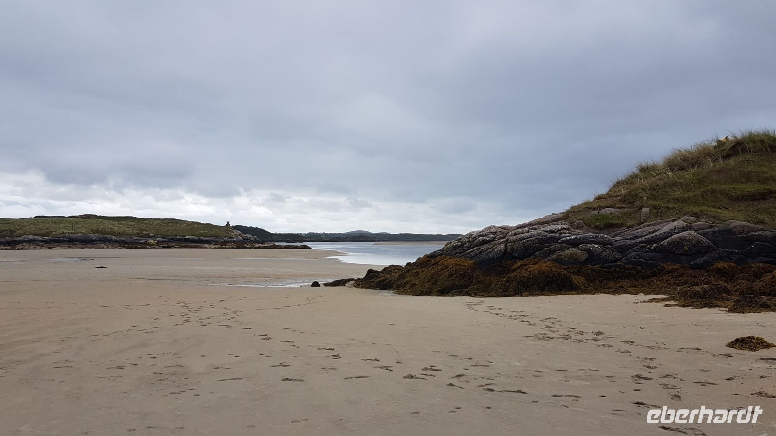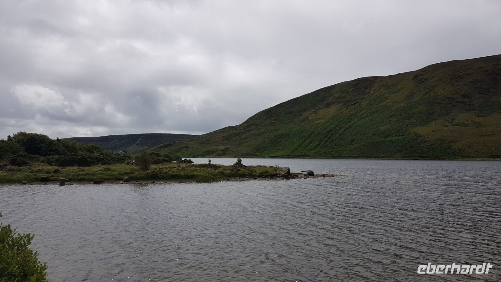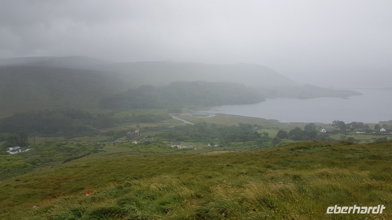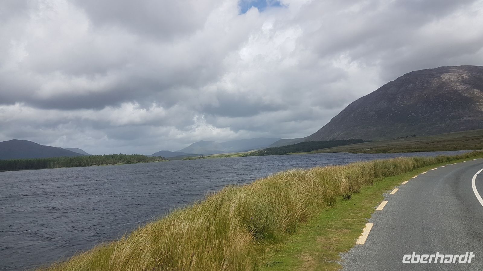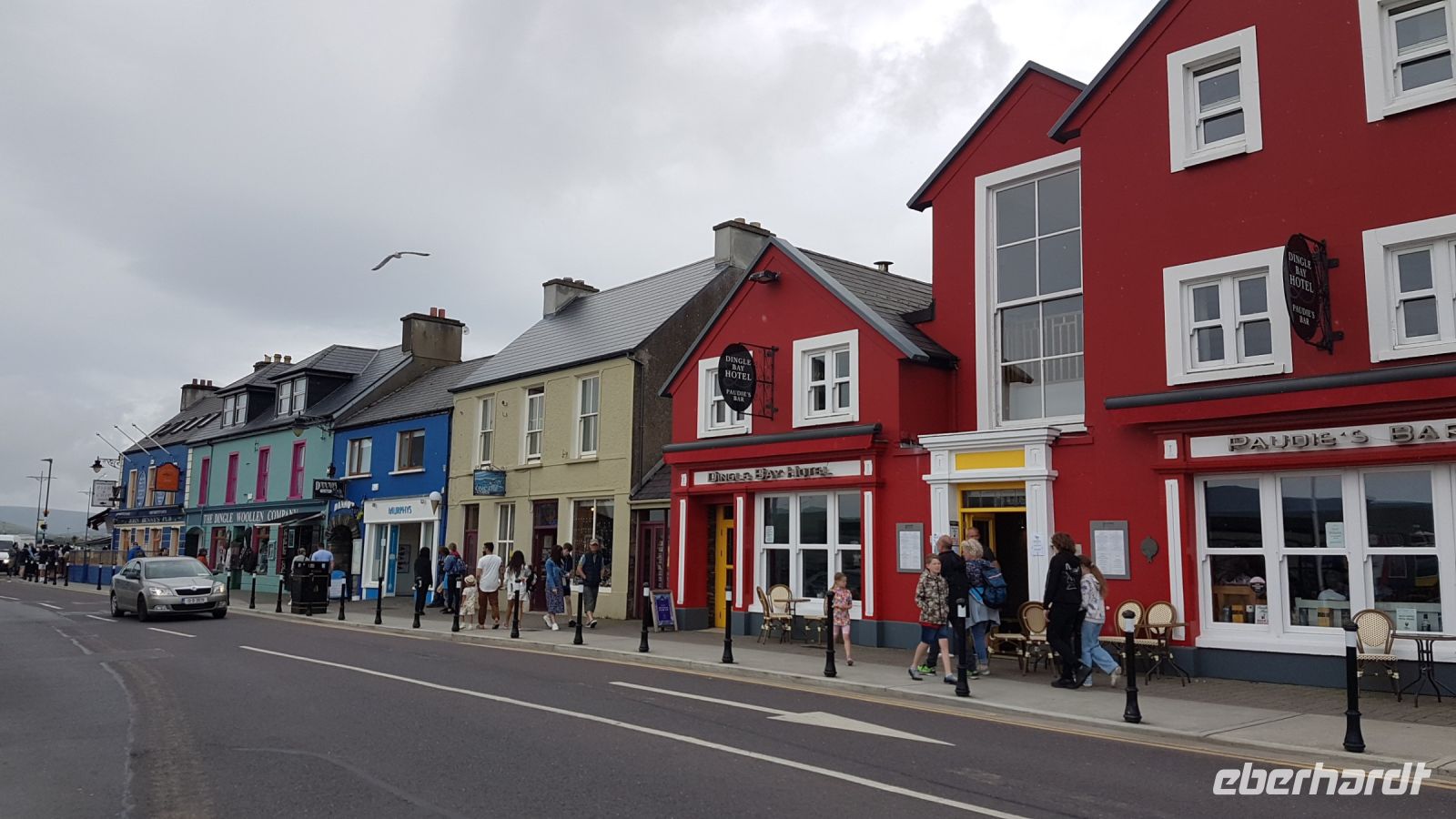 Bei Regenwetter brachen wir auf, um recht bald Achill Island zu erreichen, die größte Insel der Republik Irland. In Keel stiegen wir aus am Beehave Cafe, um dem Regen zu entkommen. Leider riss der Himmel erst am späten Nachmittag auf und der Regen begleitete uns den ganzen Tag über, so dass wir nur kurz den breiten Strand von Keel besuchen konnten. Als wir Keel verlassen wollten, mussten wir feststellen, dass unser Bus nicht mehr anspringen wollte. Nach einiger Wartezeit kam ein Mechaniker von einer lokalen Werkstatt und gab uns erst einmal Anlasshilfe. Unterwegs machten wir weitere Stops für Fotos und besuchten das Ballycroy Nationalparkzentrum. Hier erfuhren wir viele interessante Details zum Hochmoor hier, das zu den wenigen erhaltenen in Europa zählt. Auf dem Weg zum Hotel wurde unser Bus in Bangor für eine genauere Untersuchung in einer Werkstatt vorgestellt, wir besuchten während dessen den lokalen Pub The West End Bar, tranken das ein oder andere Guinness oder Tee mit Rum. Den restlichen Nachmittag hatten wir Freizeit, von unserem Broadhaven Hotel aus konnten wir einen Spaziergang zum kleinen Ortszentrum von Belmullet unternehmen oder eine lokale Besonderheit besichtigen: einen Tide-Pool direkt am Ufer des Atlantik. Den Abend verbrachten wir wieder bei einem gemeinsamen Abendessen in unserem Hotel.