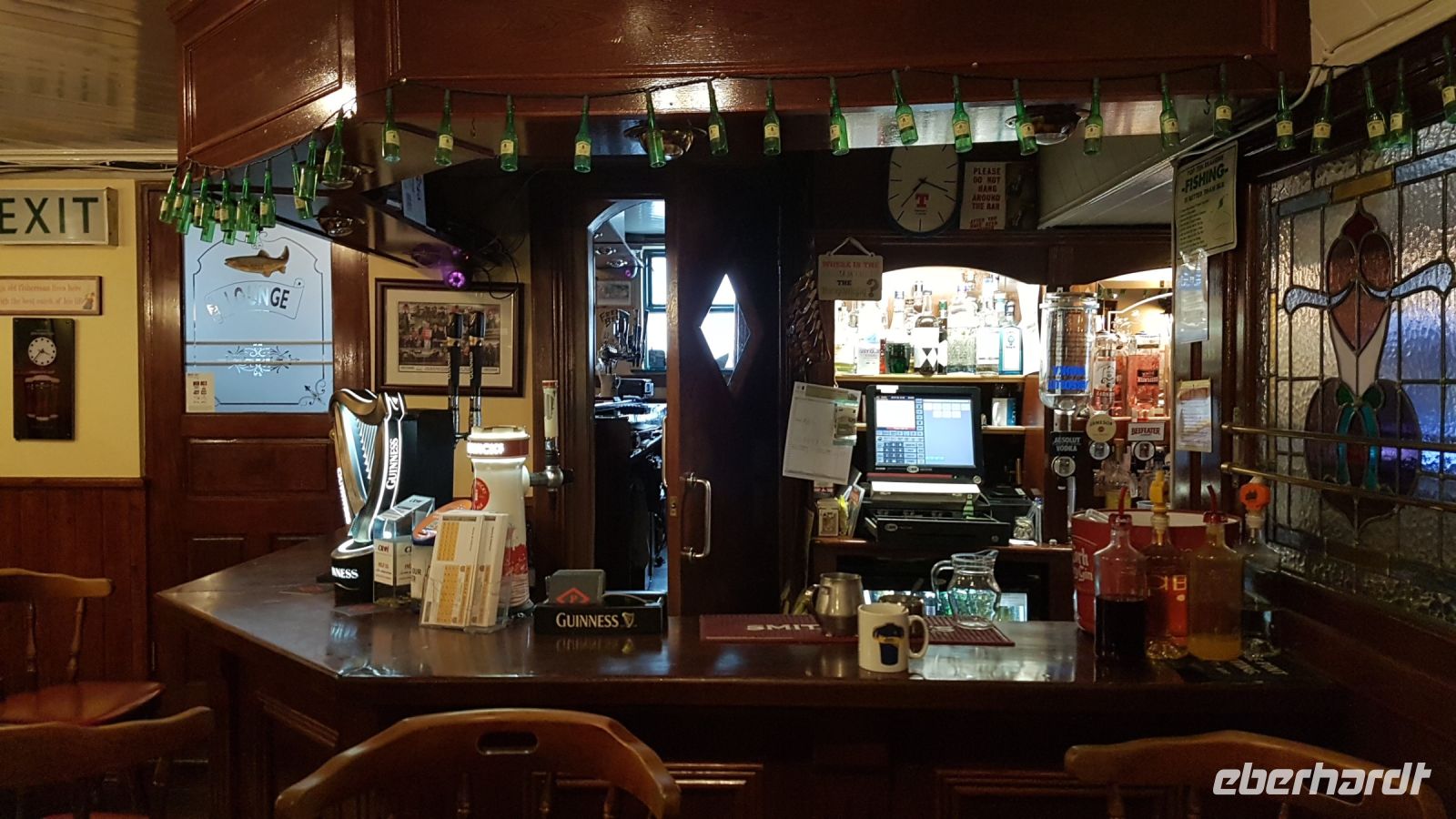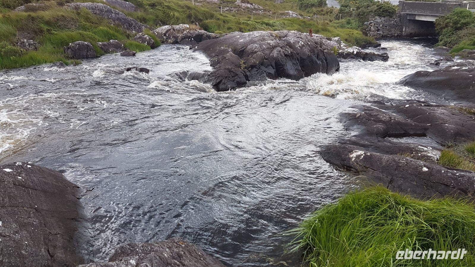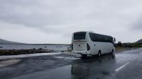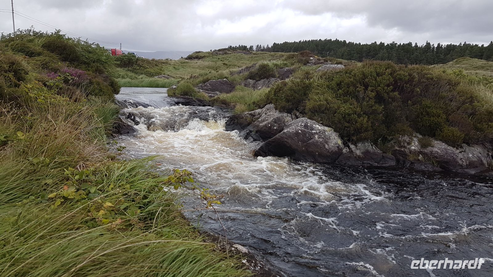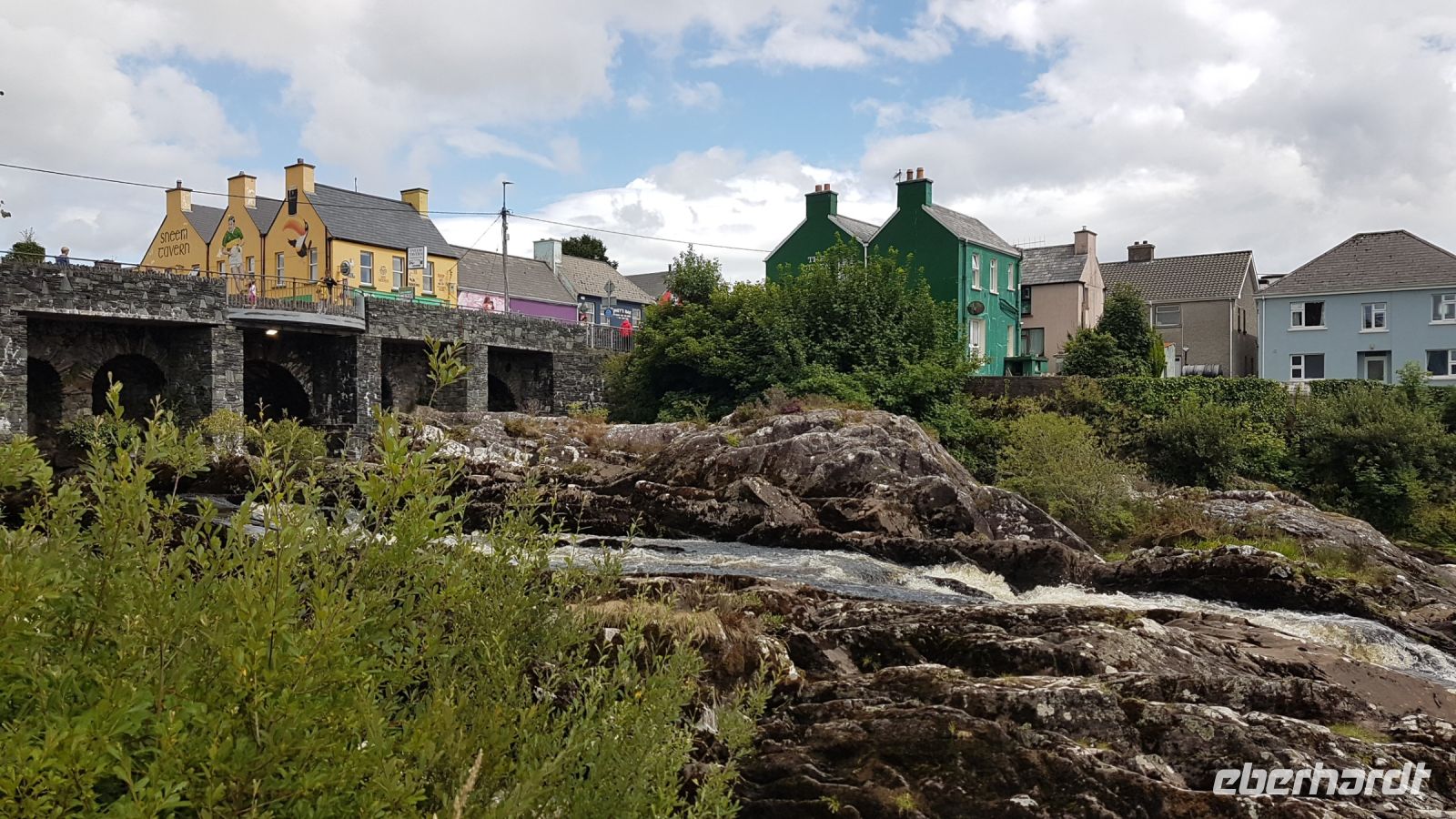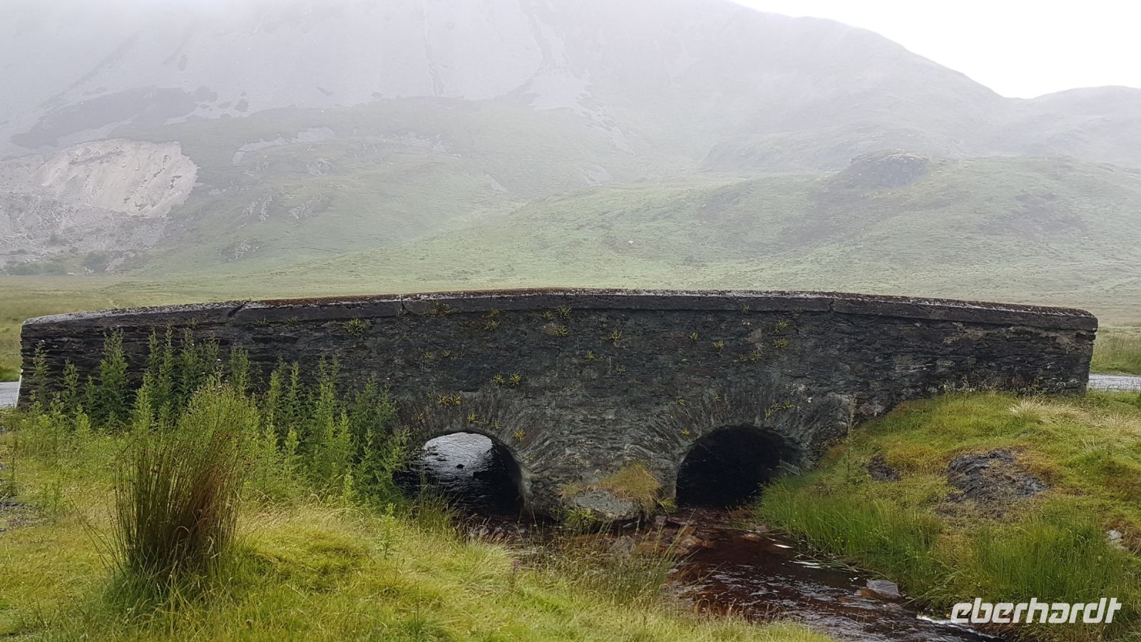 Bei Regenwetter brachen wir auf, um recht bald Achill Island zu erreichen, die größte Insel der Republik Irland. In Keel stiegen wir aus am Beehave Cafe, um dem Regen zu entkommen. Leider riss der Himmel erst am späten Nachmittag auf und der Regen begleitete uns den ganzen Tag über, so dass wir nur kurz den breiten Strand von Keel besuchen konnten. Als wir Keel verlassen wollten, mussten wir feststellen, dass unser Bus nicht mehr anspringen wollte. Nach einiger Wartezeit kam ein Mechaniker von einer lokalen Werkstatt und gab uns erst einmal Anlasshilfe. Unterwegs machten wir weitere Stops für Fotos und besuchten das Ballycroy Nationalparkzentrum. Hier erfuhren wir viele interessante Details zum Hochmoor hier, das zu den wenigen erhaltenen in Europa zählt. Auf dem Weg zum Hotel wurde unser Bus in Bangor für eine genauere Untersuchung in einer Werkstatt vorgestellt, wir besuchten während dessen den lokalen Pub The West End Bar, tranken das ein oder andere Guinness oder Tee mit Rum. Den restlichen Nachmittag hatten wir Freizeit, von unserem Broadhaven Hotel aus konnten wir einen Spaziergang zum kleinen Ortszentrum von Belmullet unternehmen oder eine lokale Besonderheit besichtigen: einen Tide-Pool direkt am Ufer des Atlantik. Den Abend verbrachten wir wieder bei einem gemeinsamen Abendessen in unserem Hotel.